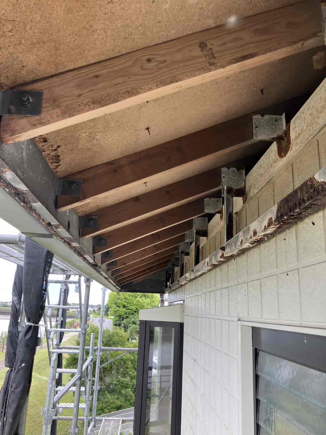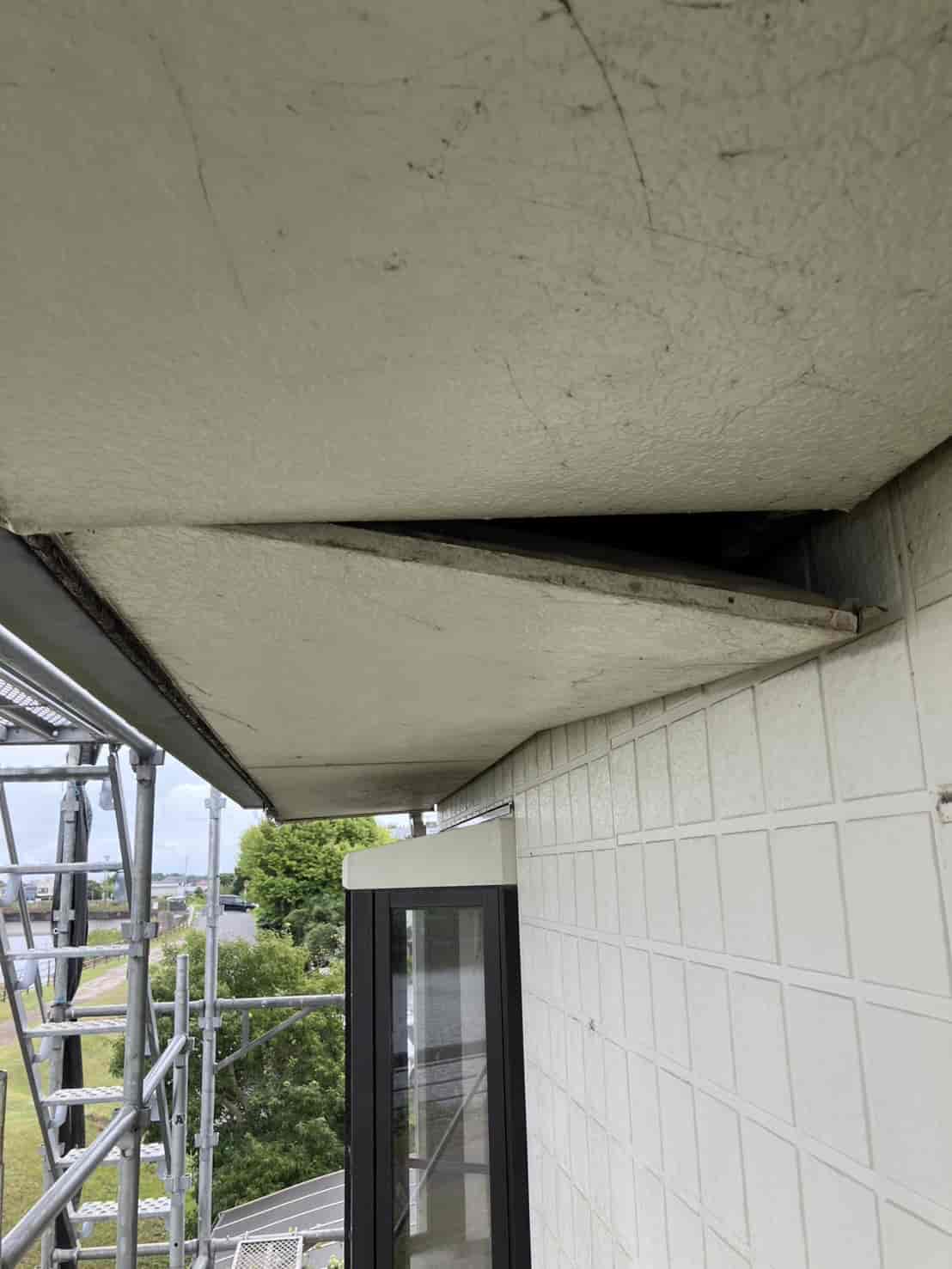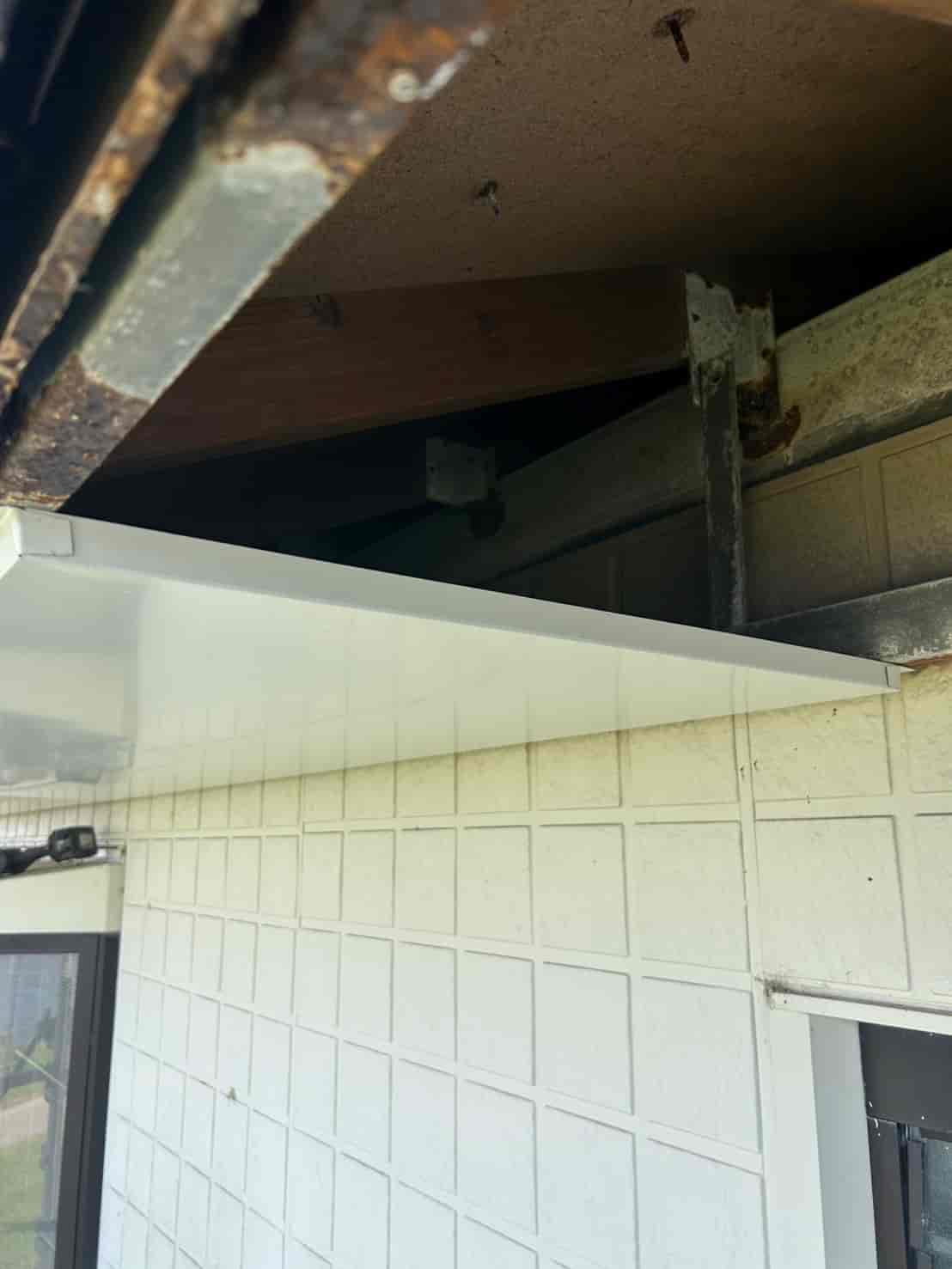 【対応】軒天が外れて落下しそうとのご相談を受け、錆で劣化した軽量鉄骨を補強のうえ既存軒天を撤去し、特注のガルバリウム鋼板を設置。シーリング処理で防水性を高め、安全で美観の整った状態に復旧しました。