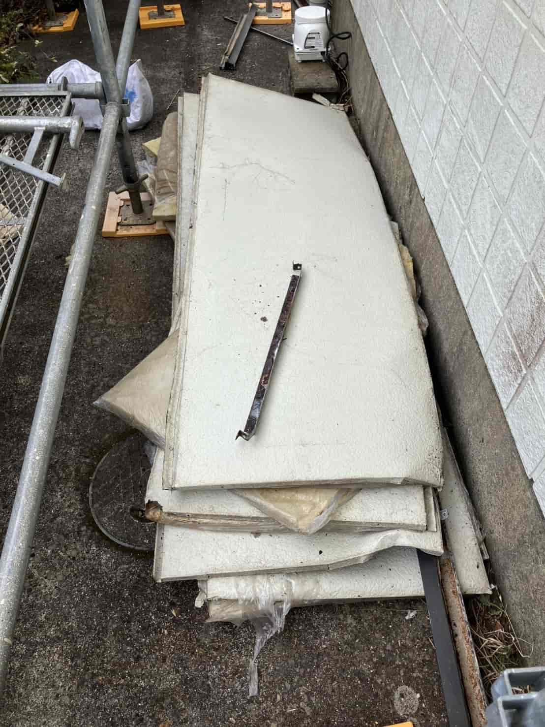 今回の千葉県長生郡での施工では、錆で劣化した軽量鉄骨のために外れたスチール軒天を撤去し、特注のガルバリウム鋼板で補修しました。