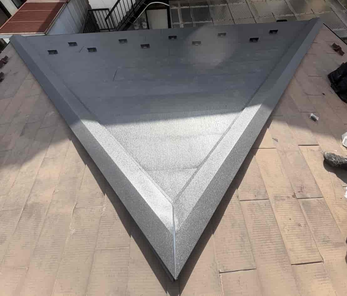 特に既存の木下地に一部腐食が見られたため、新たにラーチ合板で補強し、防水ルーフィングを丁寧に張り込みました。その上からガルバリウム鋼板(耐久性・防錆性に優れる素材)を施工し、屋根との取り合いも専用の水切り板金で処理。最終的にシーリングで全周を防水処理して、雨仕舞を完全に仕上げました。