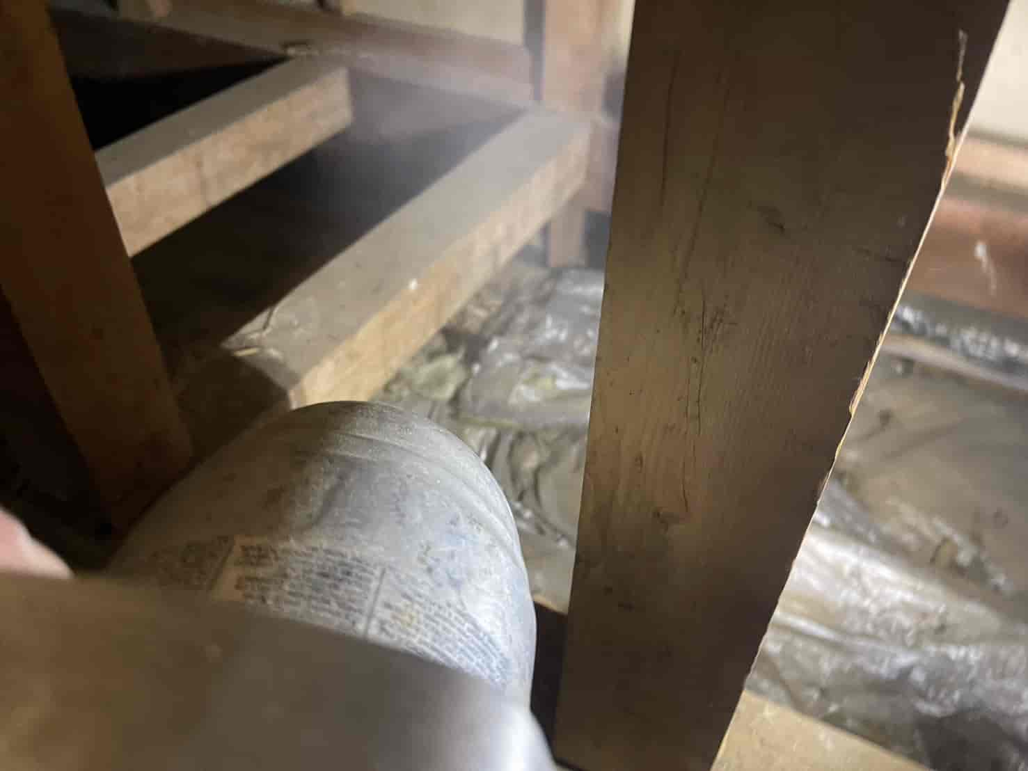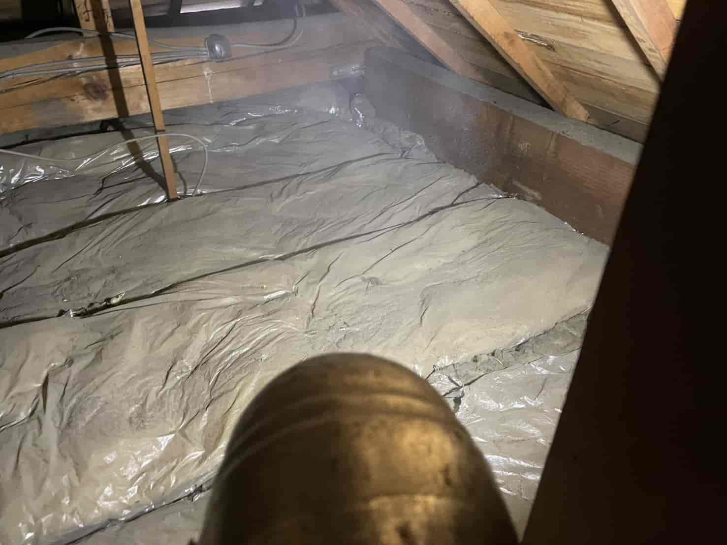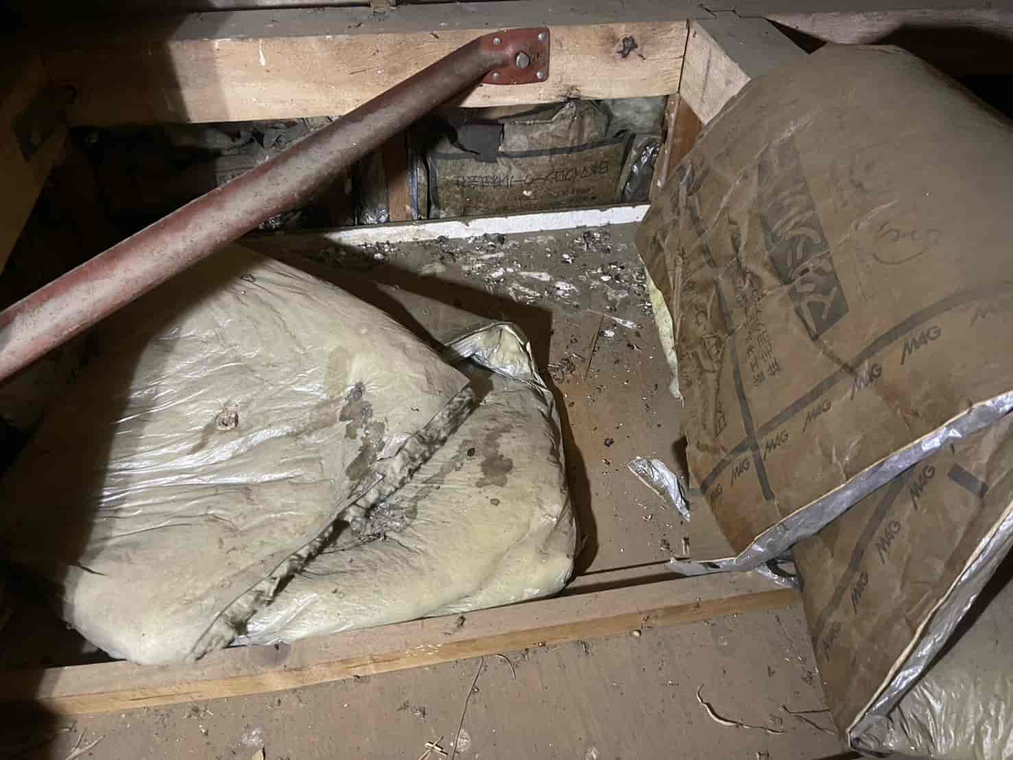 続いて天井裏の点検を実施しました。点検口から内部を確認すると、断熱材の上にフンや足跡が点在しており、