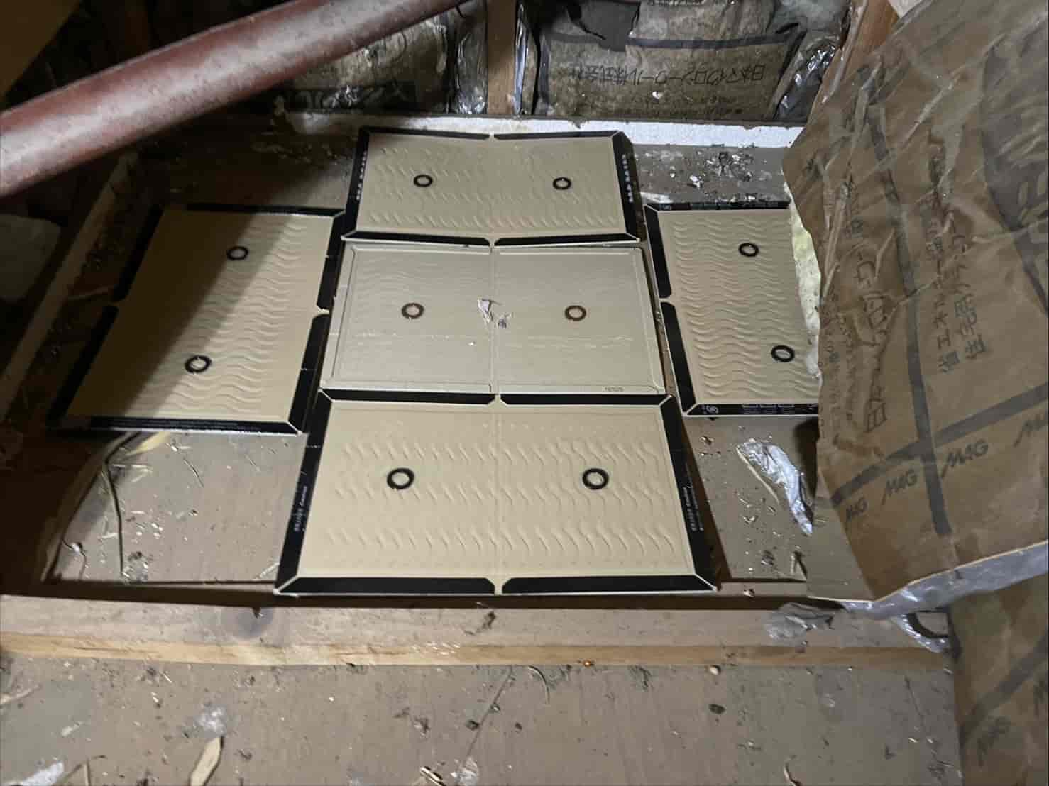 その後、侵入口の封鎖作業に移ります。通気口には防鼠金網を取り付け、配管周りの隙間には専用のパテや金属材を使用して隙間なく塞ぎました。