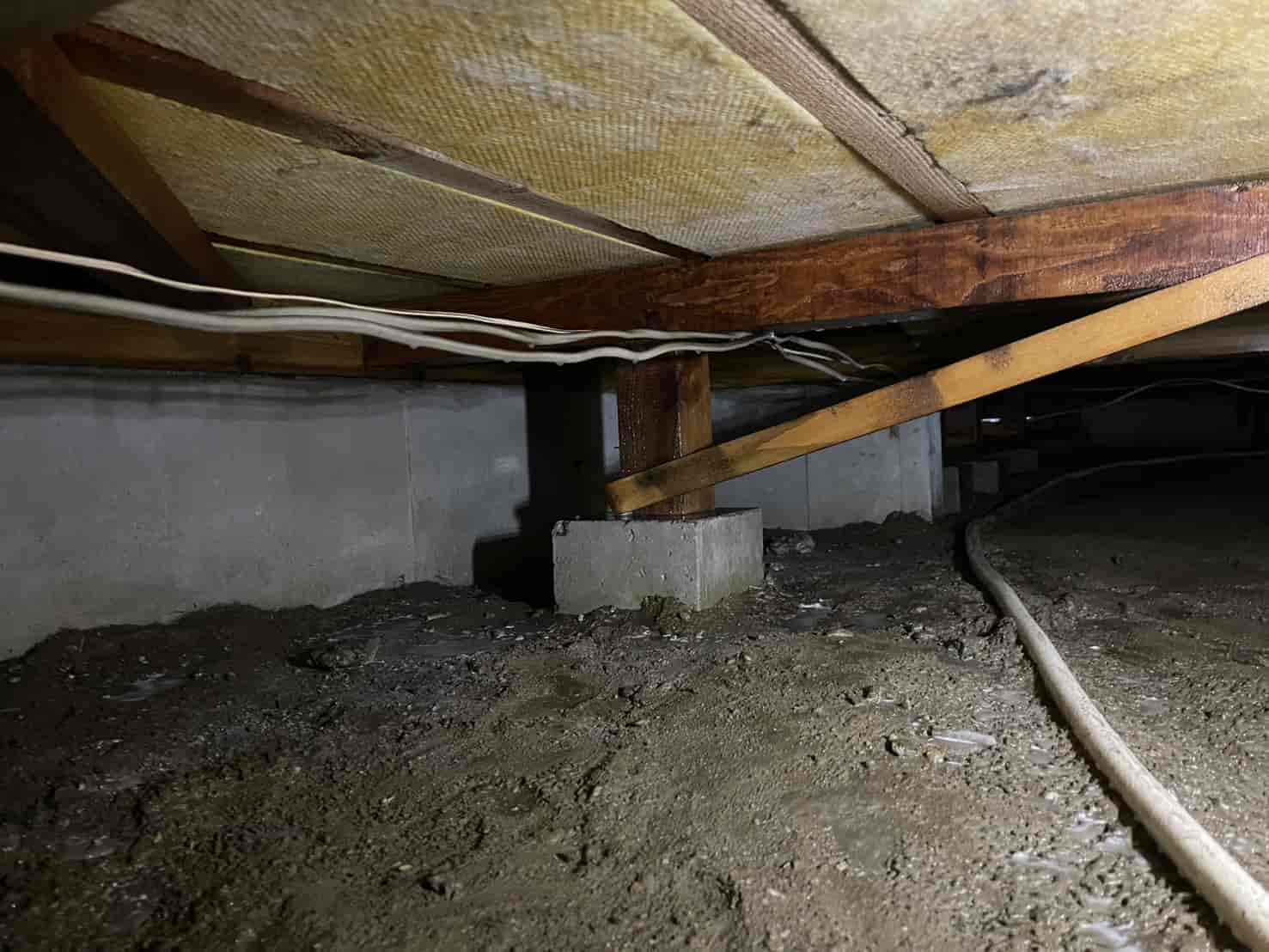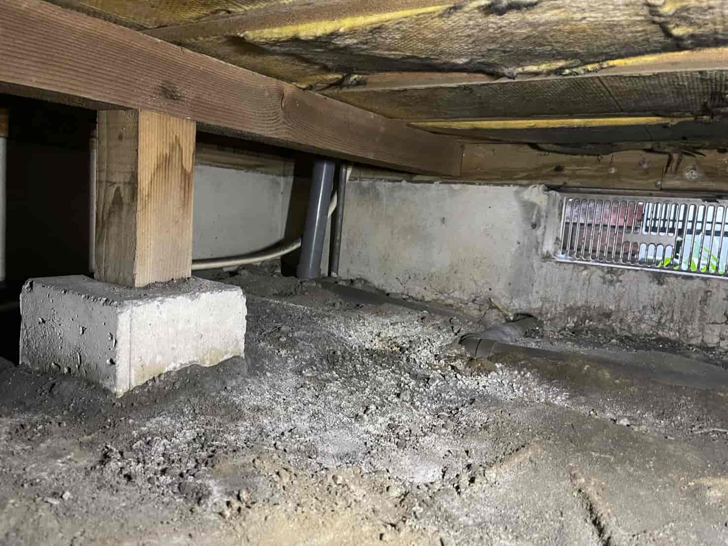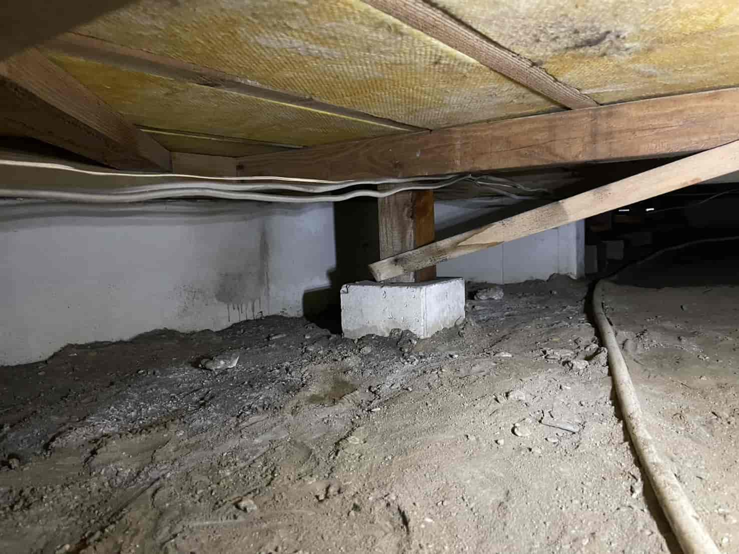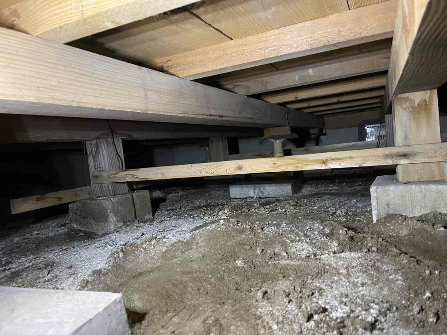 床下に入り、基礎・束石・木部・土壌の状態を細かく確認したところ、床下空間に空中蟻道(くうちゅうぎどう)が形成されているのを確認しました。