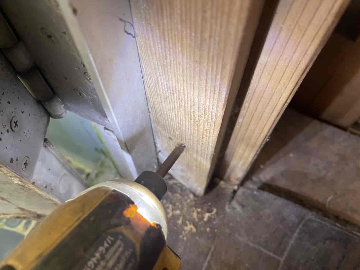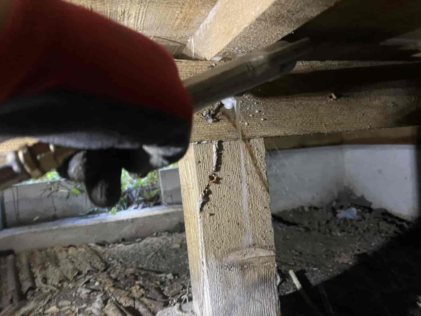 次に床下では、被害の大きかった大引きを中心に穿孔注入処理を実施しました。表面処理だけではなく、木材内部に直接薬剤を浸透させることで、現在生息しているシロアリの駆除と、今後の再侵入防止を同時に行います。蟻道が確認された箇所についても破壊・除去を行い、薬剤処理を徹底しました。