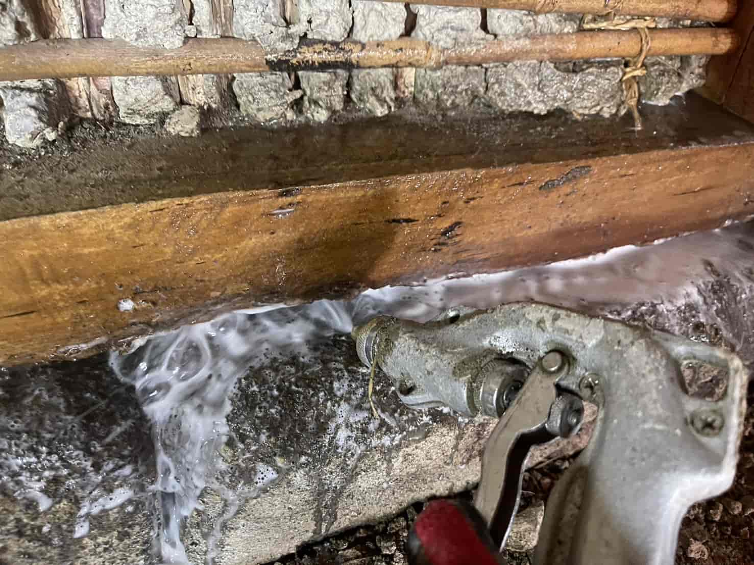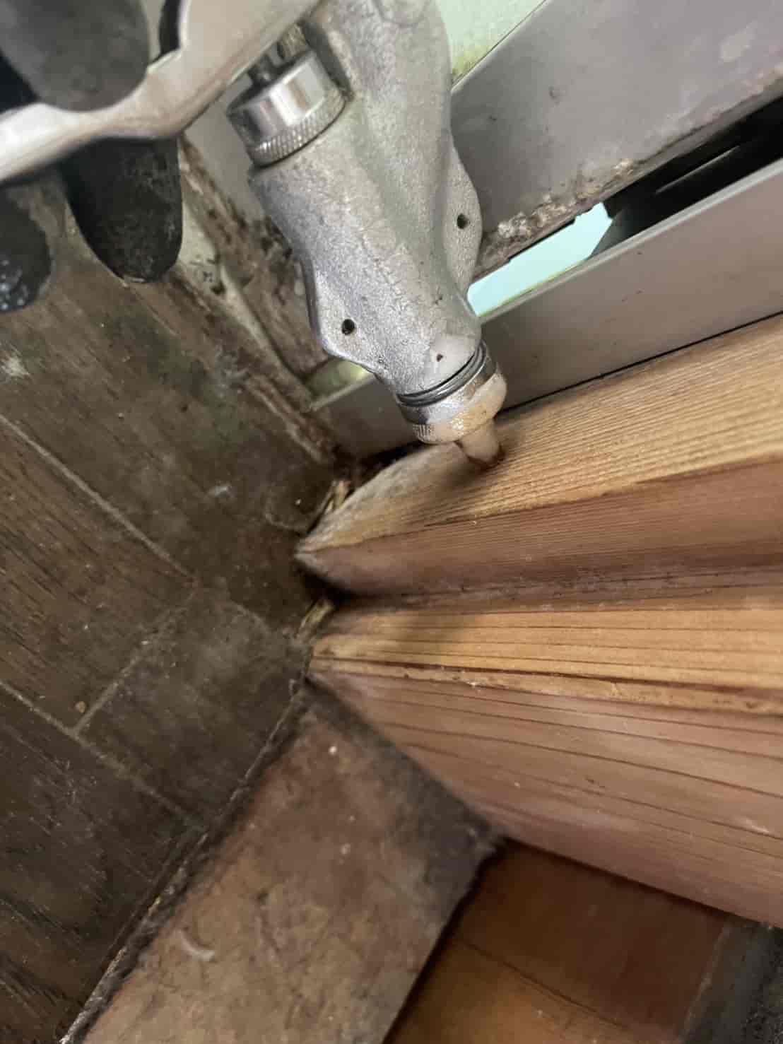 さらに、室内の張り部分に関しては、構造や仕上げ材への影響を最小限に抑えるため、ムース処理を採用しました。ムース状の薬剤は発泡しながら内部に広がる特性があり、壁内や見えない空間にも行き渡るため、羽蟻が発生していた上部構造への対策として非常に有効です。これにより、穿孔数を抑えつつ、確実な防蟻効果を確保しました。