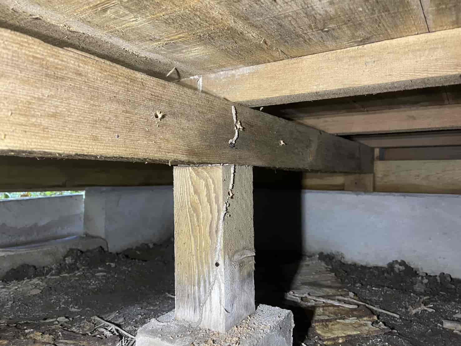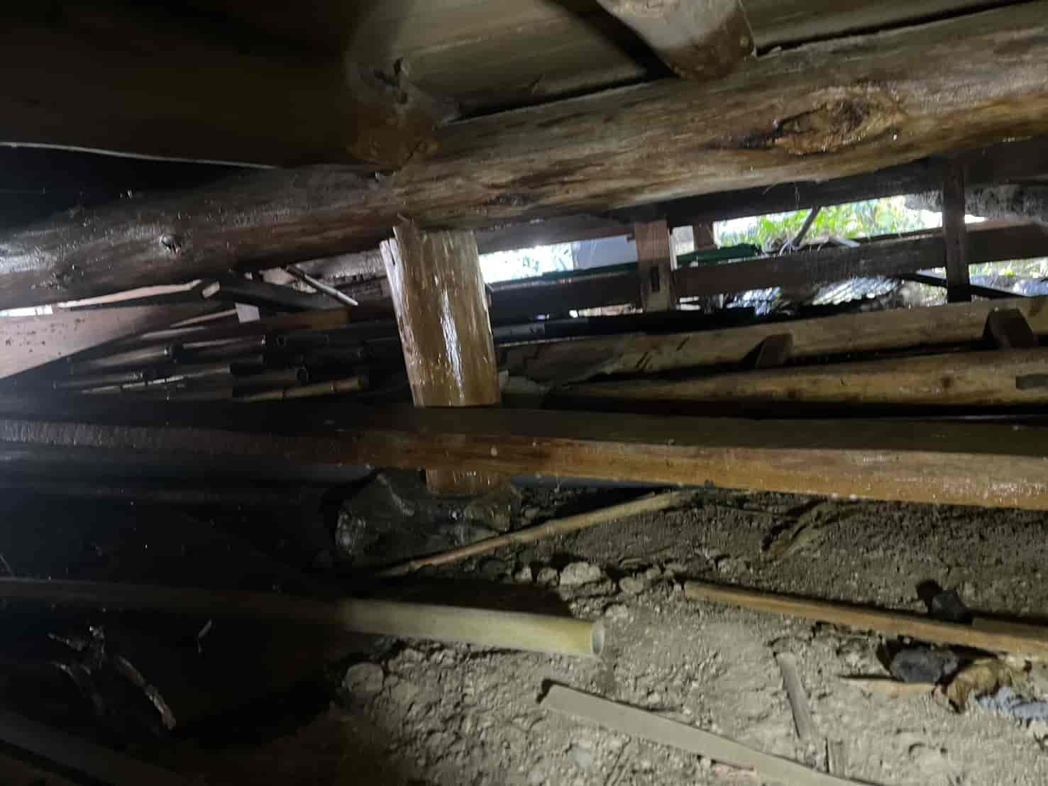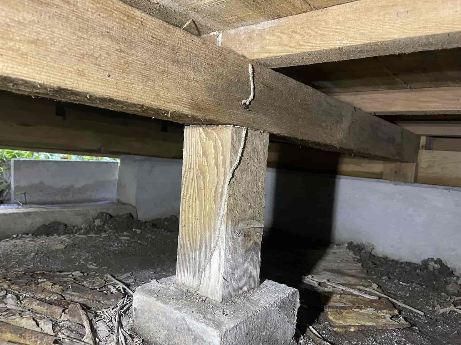 まず初めに床下点検を実施しました。床下に進入すると、複数箇所に蟻道(ぎどう)を確認し、シロアリの活動が現在も継続していることが分かりました。特に風呂場周辺の湿気が多い箇所では被害が顕著で、大引きや周辺木部には大量の木片が散乱しており、内部が空洞化している部材も見受けられました。床がブカブカしていた原因も、この大引きや構造材の食害による強度低下が主な要因と判断しました。
