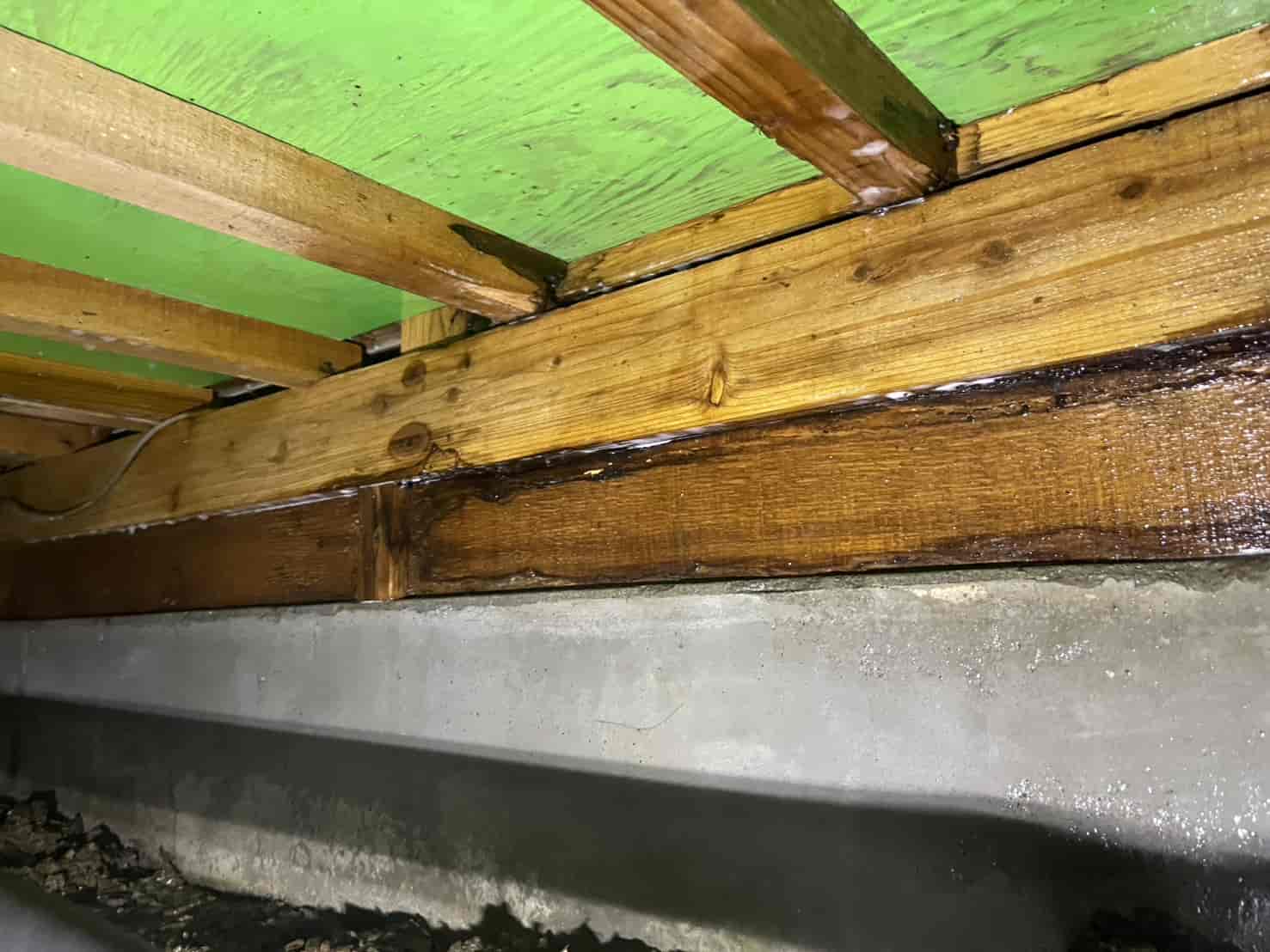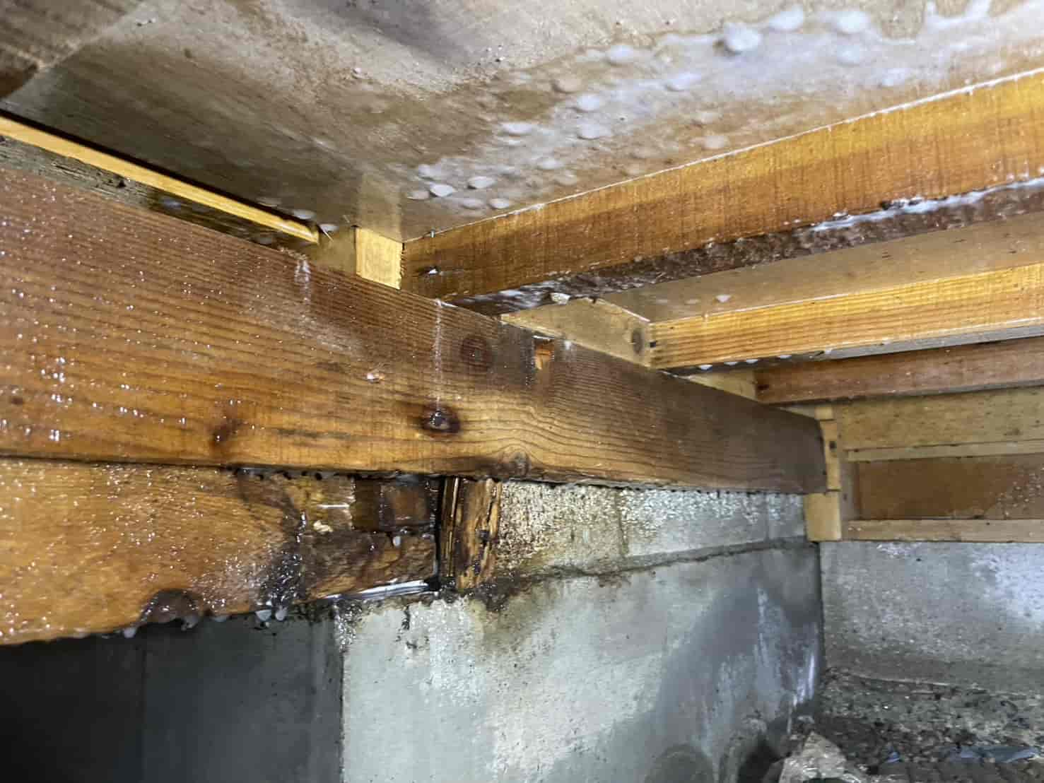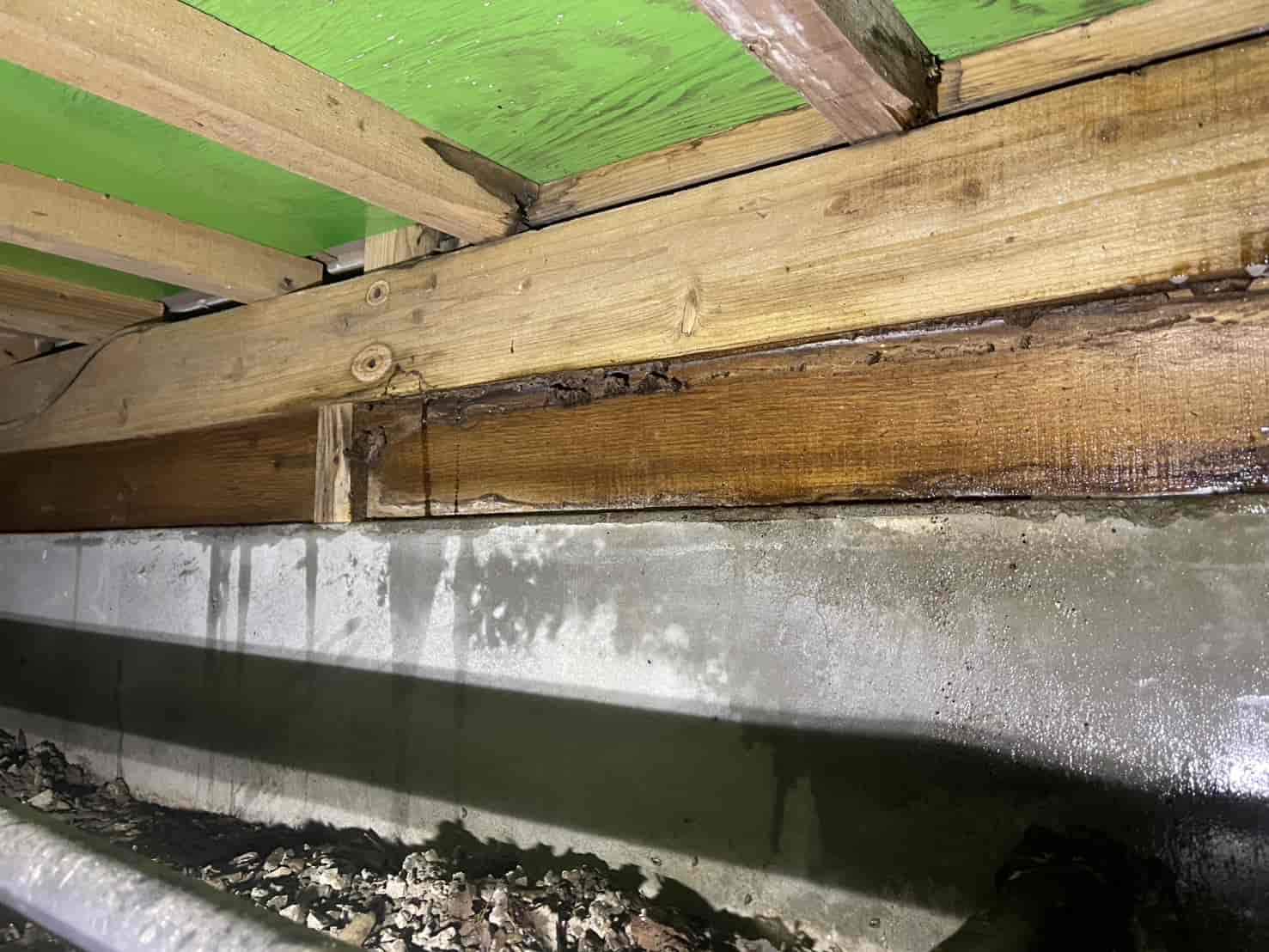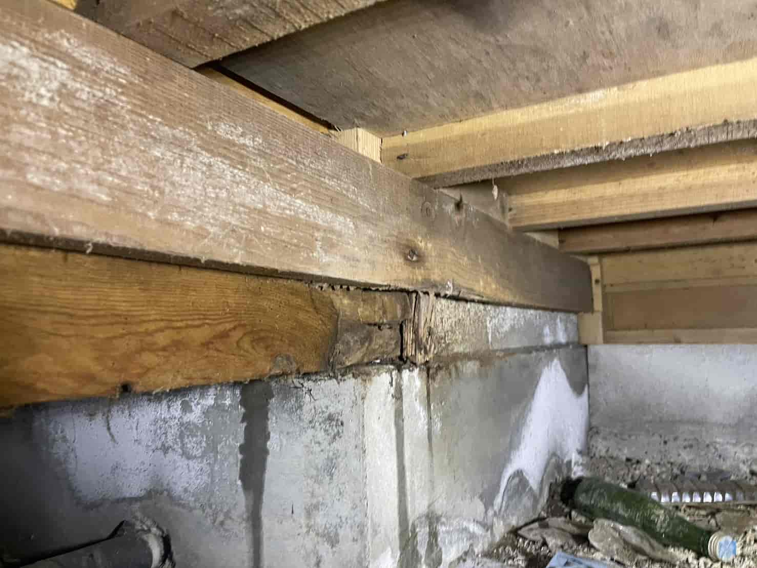 まず初めに床下点検を実施しました。床下に進入すると、複数箇所に蟻道(ぎどう)を確認し、シロアリの活動が現在も継続していることが分かりました。特に風呂場周辺の湿気が多い箇所では被害が顕著で、大引きや周辺木部には大量の木片が散乱しており、内部が空洞化している部材も見受けられました。床がブカブカしていた原因も、この大引きや構造材の食害による強度低下が主な要因と判断しました。
