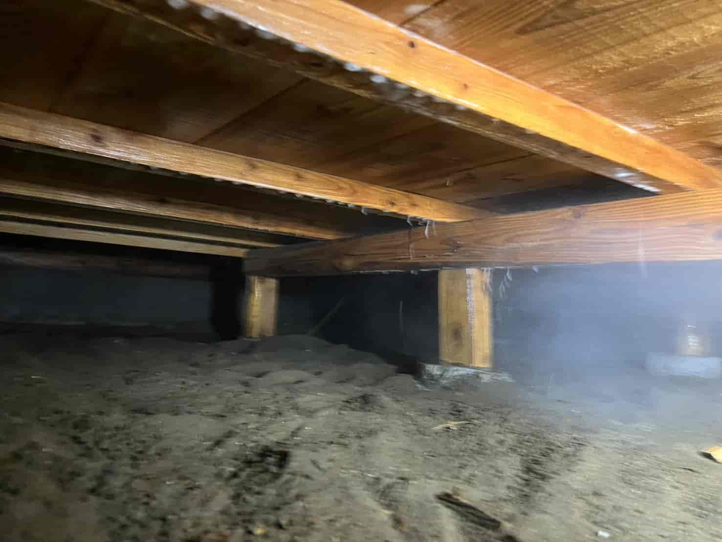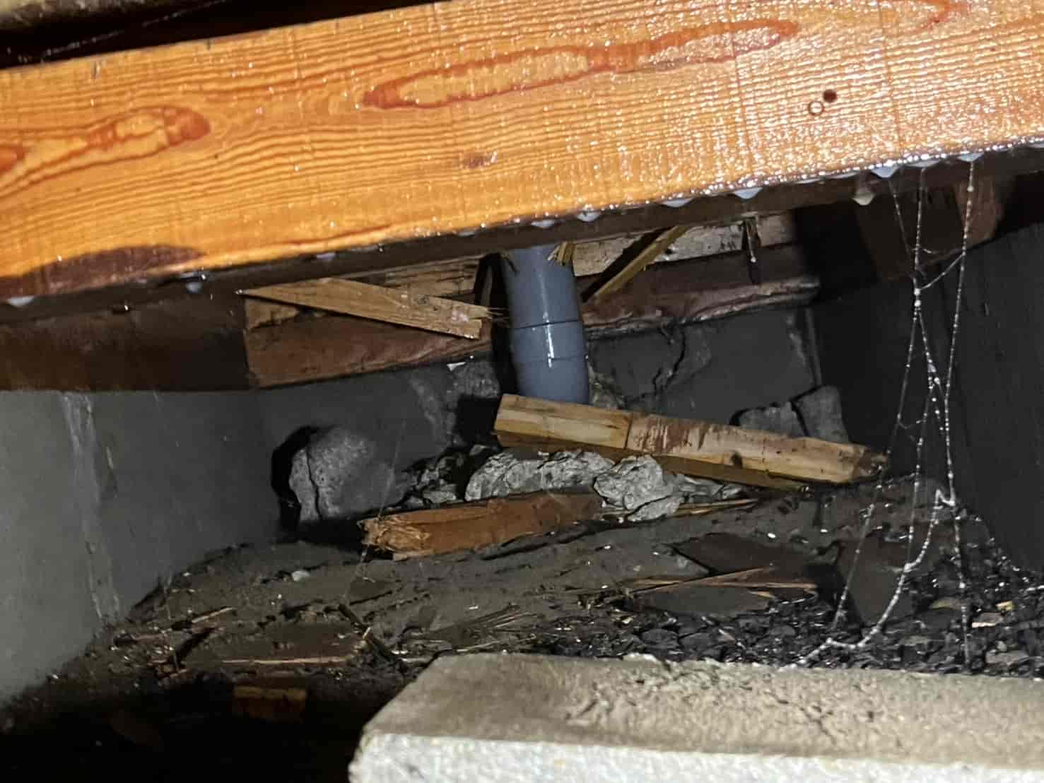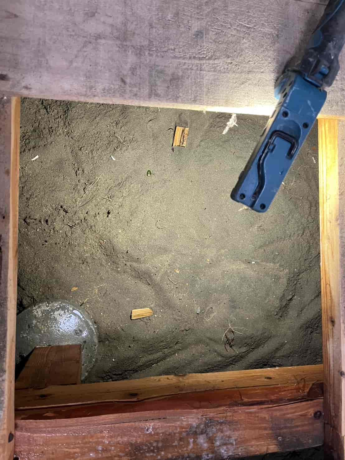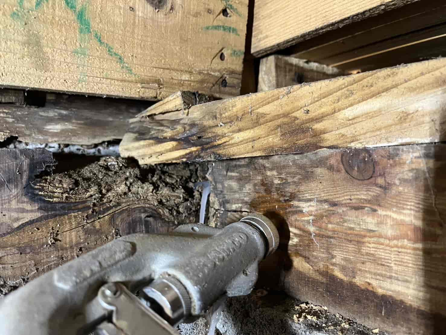 【対応】長年お付き合いいただいているリピーターの民泊オーナー様から、床に違和感がある」とのご相談がありました。現地調査で床下に複数の蟻道を確認。被害箇所の木部と床下全体に穿孔注入・薬剤散布を実施し、早期に被害拡大を防止しました。