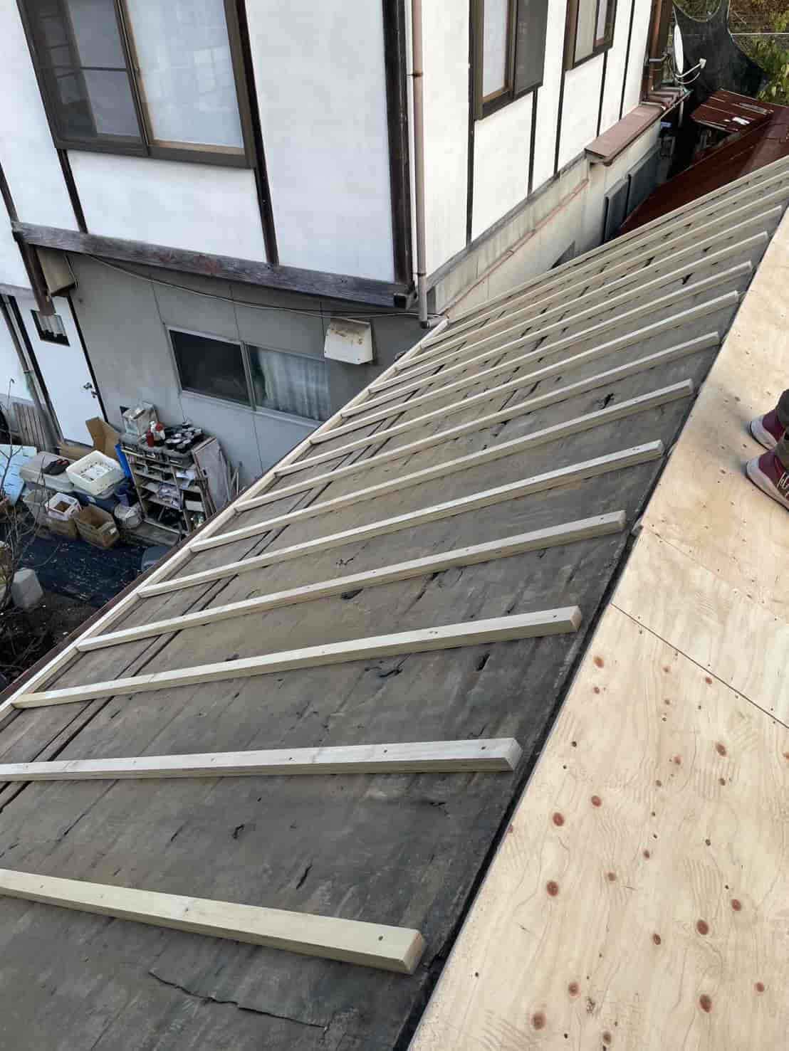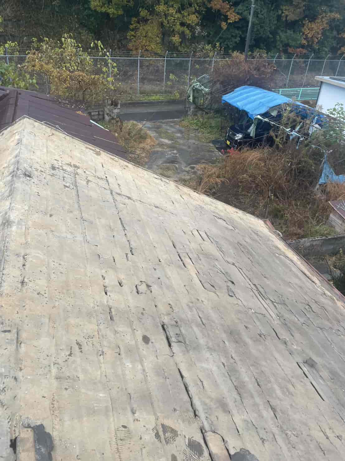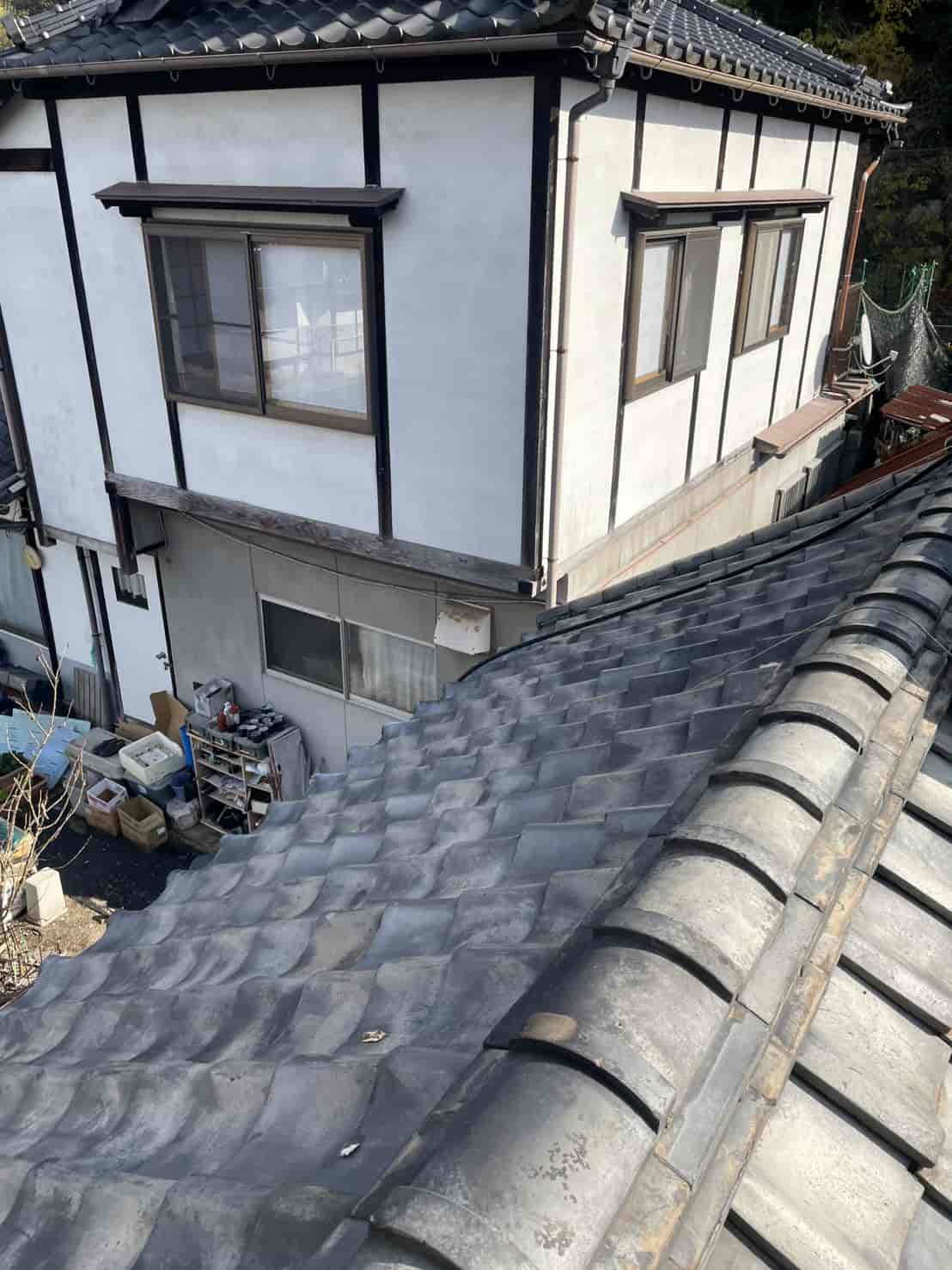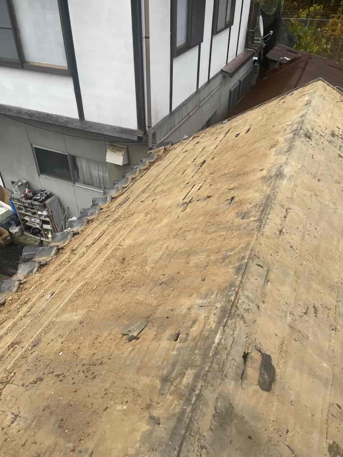 江田島市にお住まいの方から以前から雨漏りしていたが、いよいよ補修を考えているので見にきてほしいとの相談を受け伺ったところ、屋根の部分補修をご希望とのことでしたが、雨漏り該当屋根は屋根材の瓦が全体的に劣化していることから、該当屋根全面葺き替えをご提案し、ご依頼いただきました。