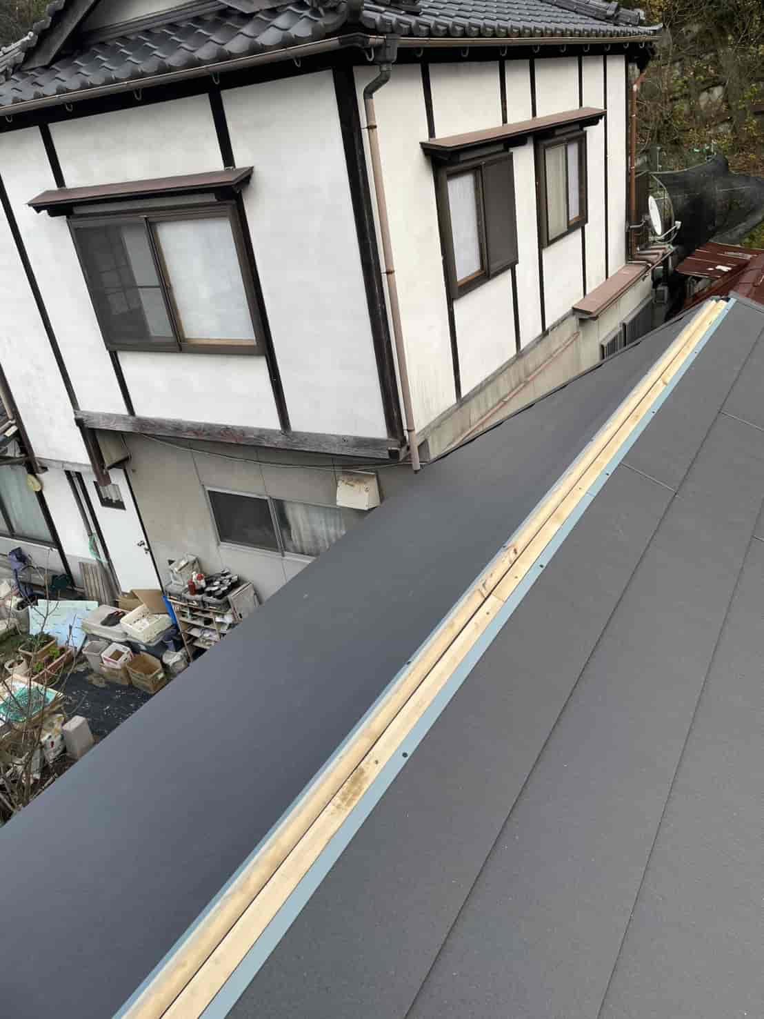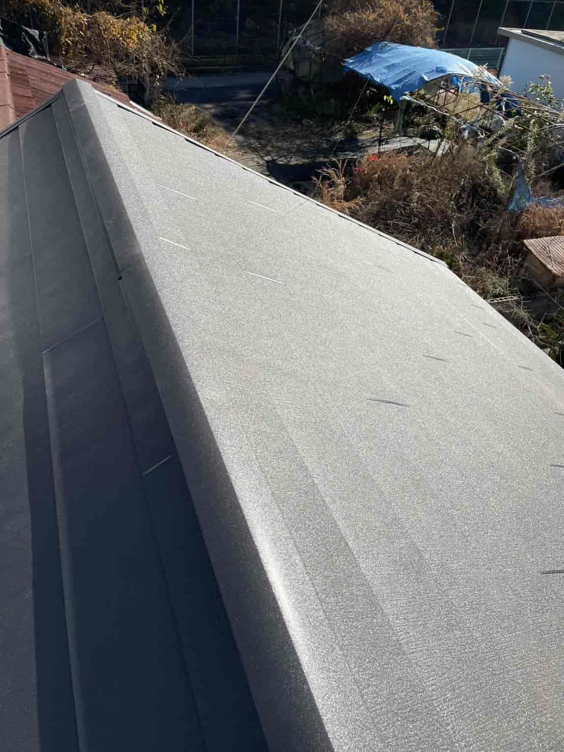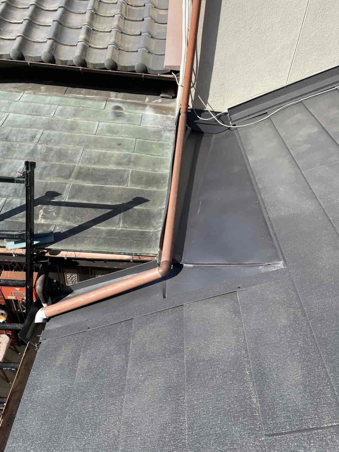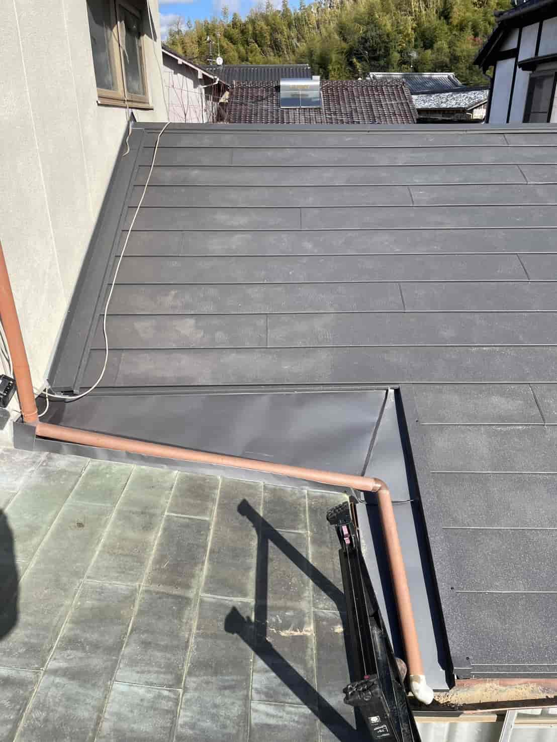 屋根全体の劣化を確認したため、部分補修ではなく屋根全面葺き替えをご提案し、アイジー工業「スーパーガルテクト」にて施工しました。併せて谷部はガルバリウム鋼板による板金を製作・施工し、雨漏り対策を行いました。