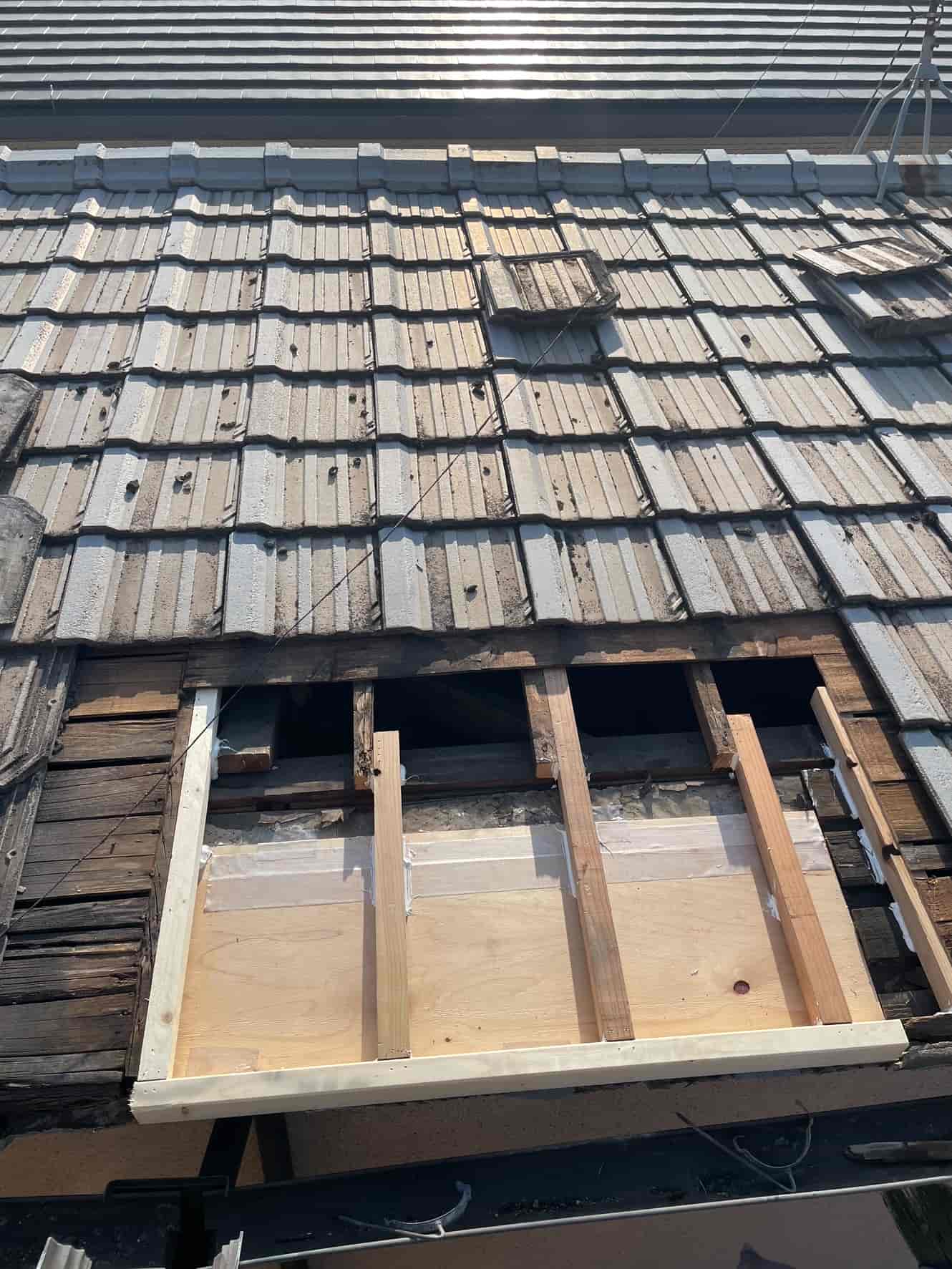 【対応】軒先の一部が崩落しそうになっているので、部分補修してほしいとのご依頼をいただきました。伺って現地調査したところ、セメント瓦が一部割れ、そこから浸水していたため、下地の木が腐食し、自重に耐えれなくなり、鼻隠しのモルタルも砕け、崩落しかかっておりました。腐食した木を取り除き、下地を入れ替え、軒先部分の瓦と鼻隠し部分を板金でカバーいたしました。