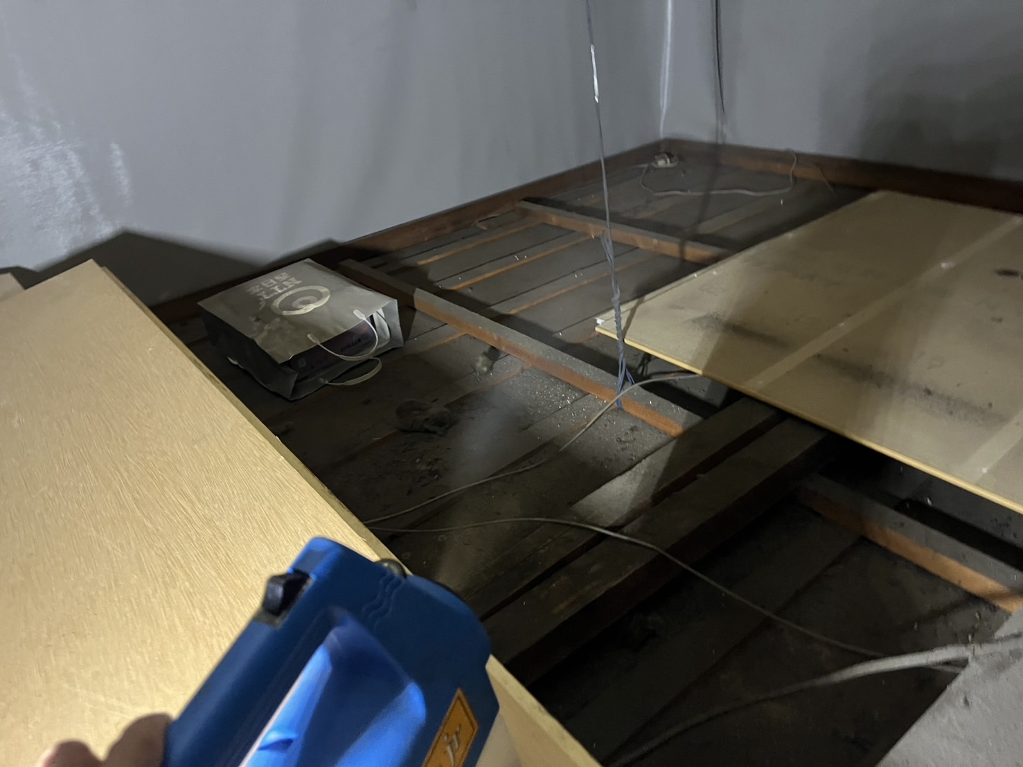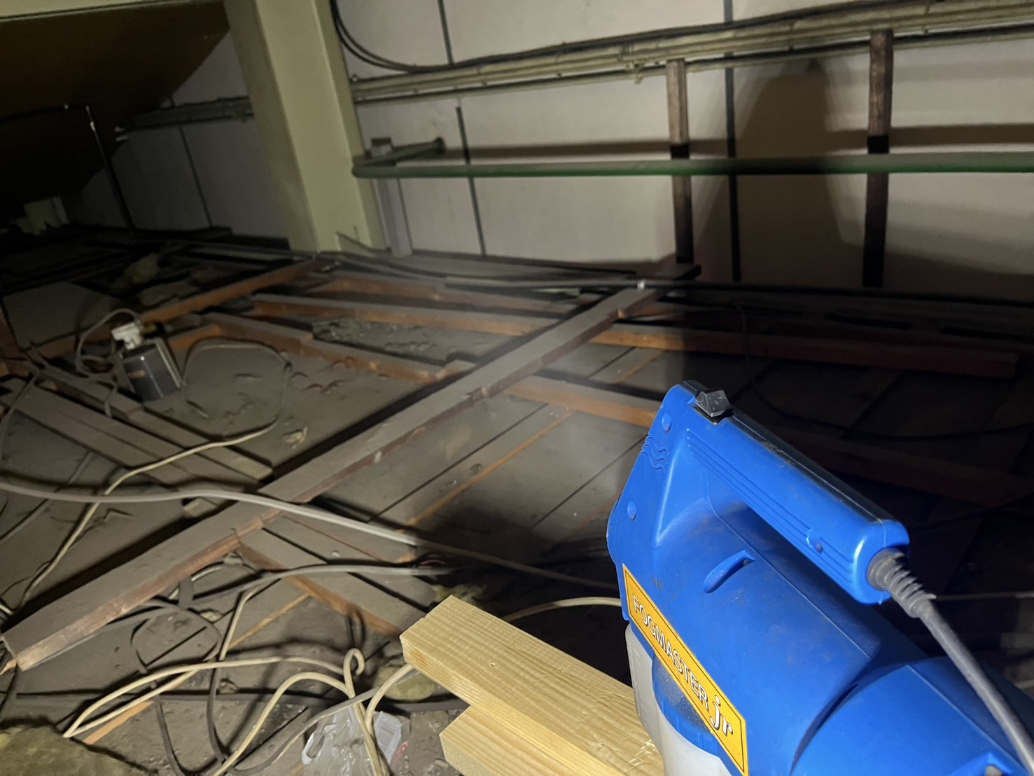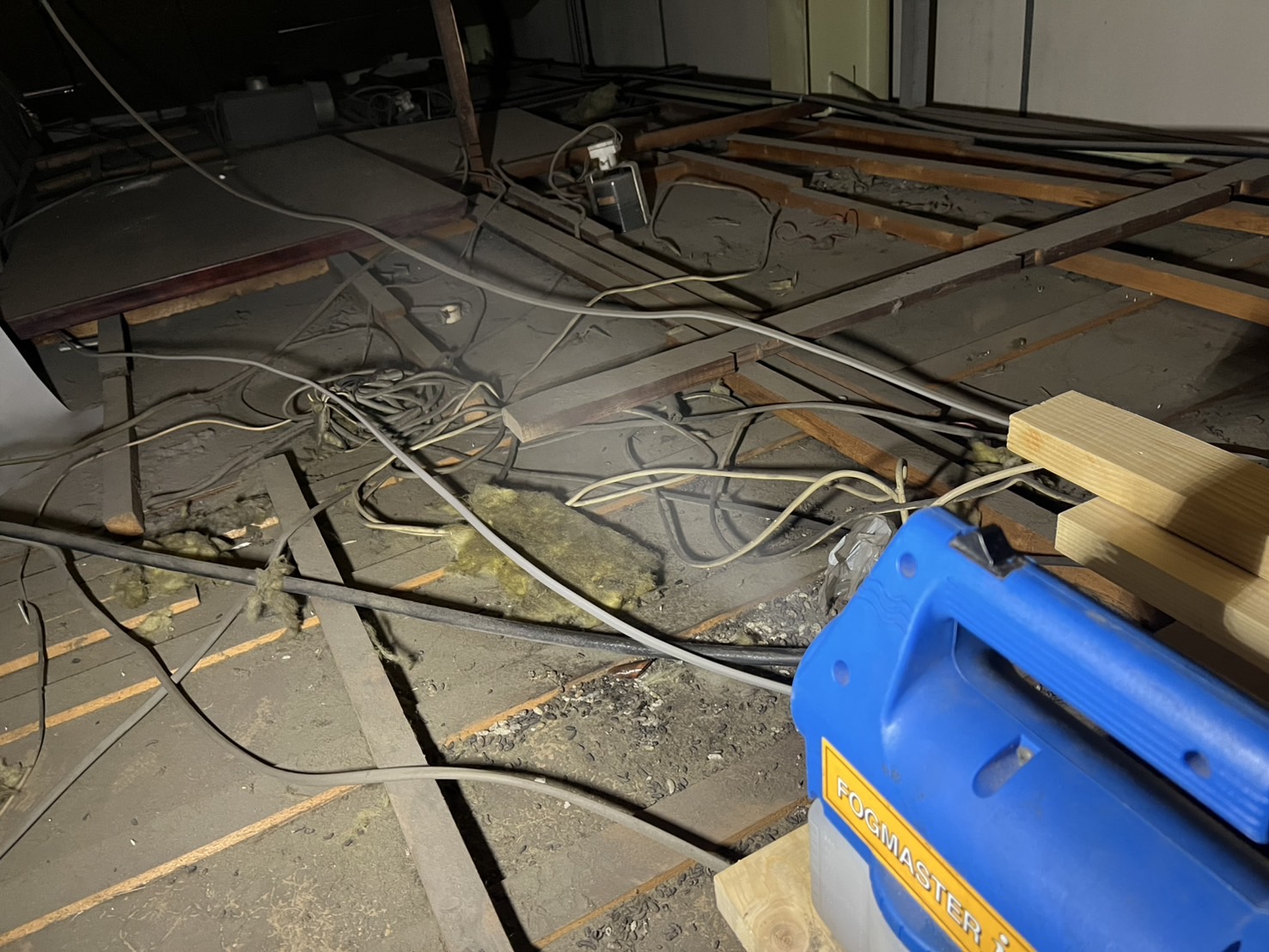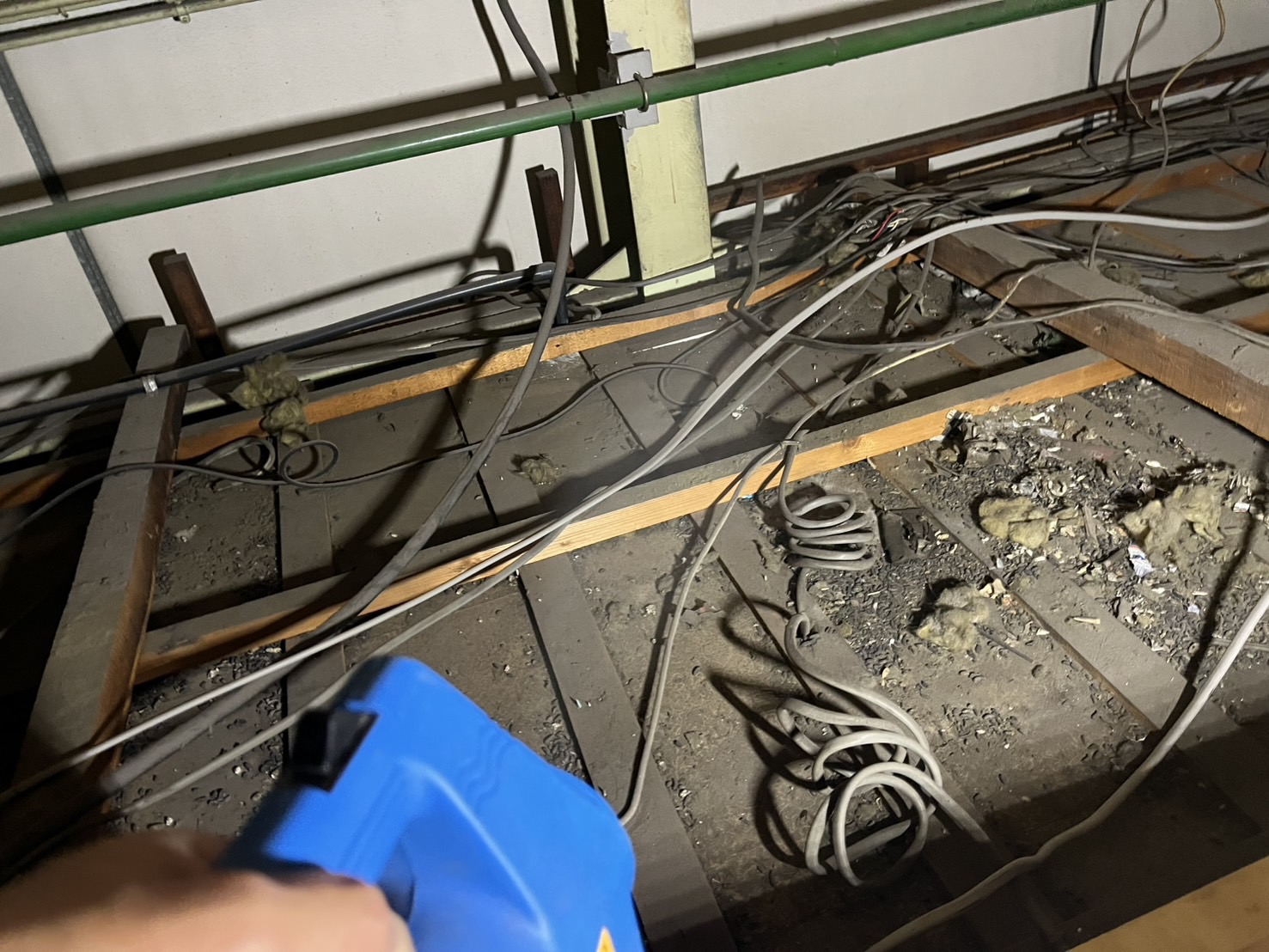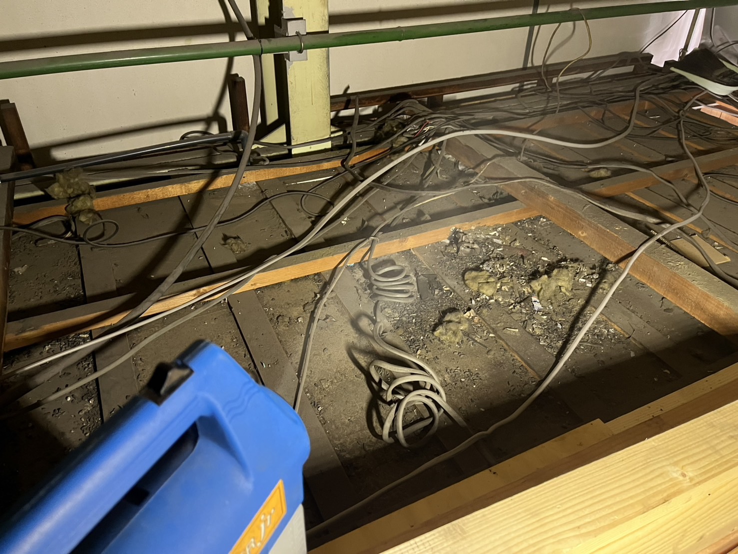 工場に到着し、問題の更衣室の天井裏を点検させていただくと、すぐにその原因が判明しました。そこには、複数のネズミが侵入した形跡が明確に残されていたのです。