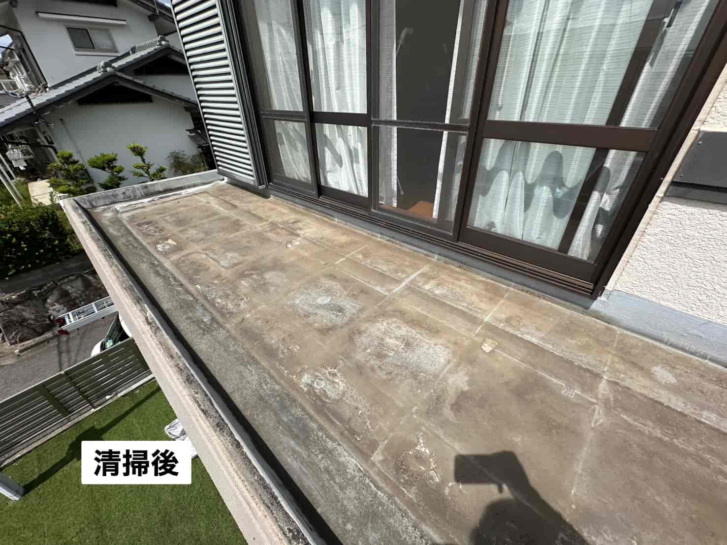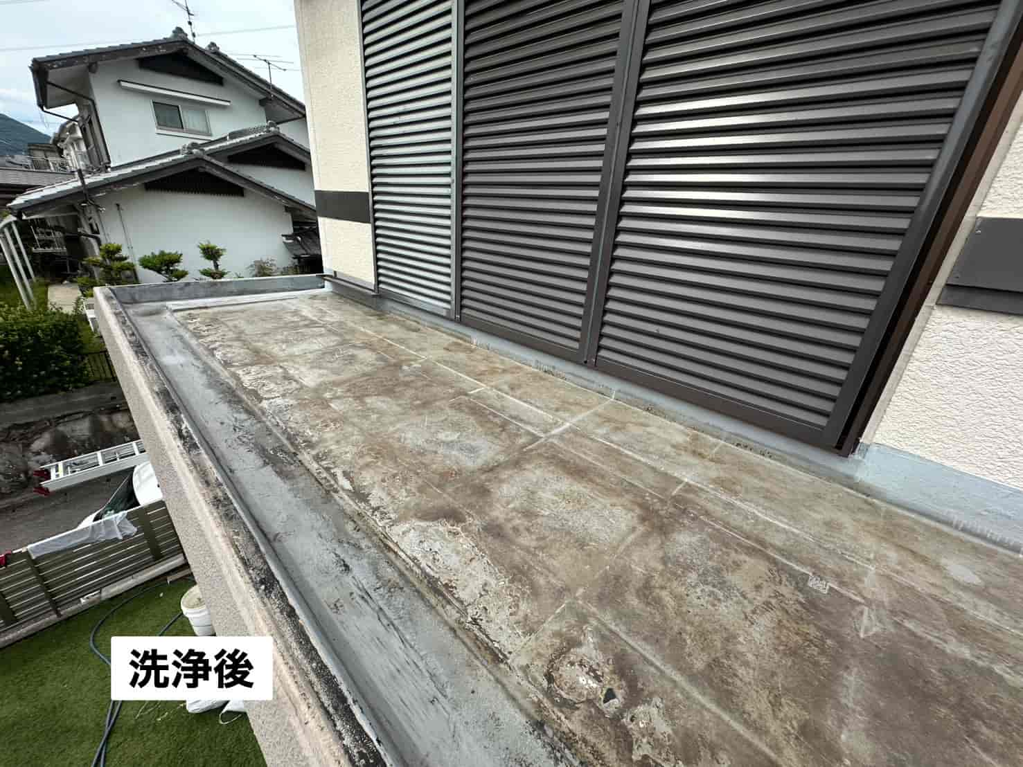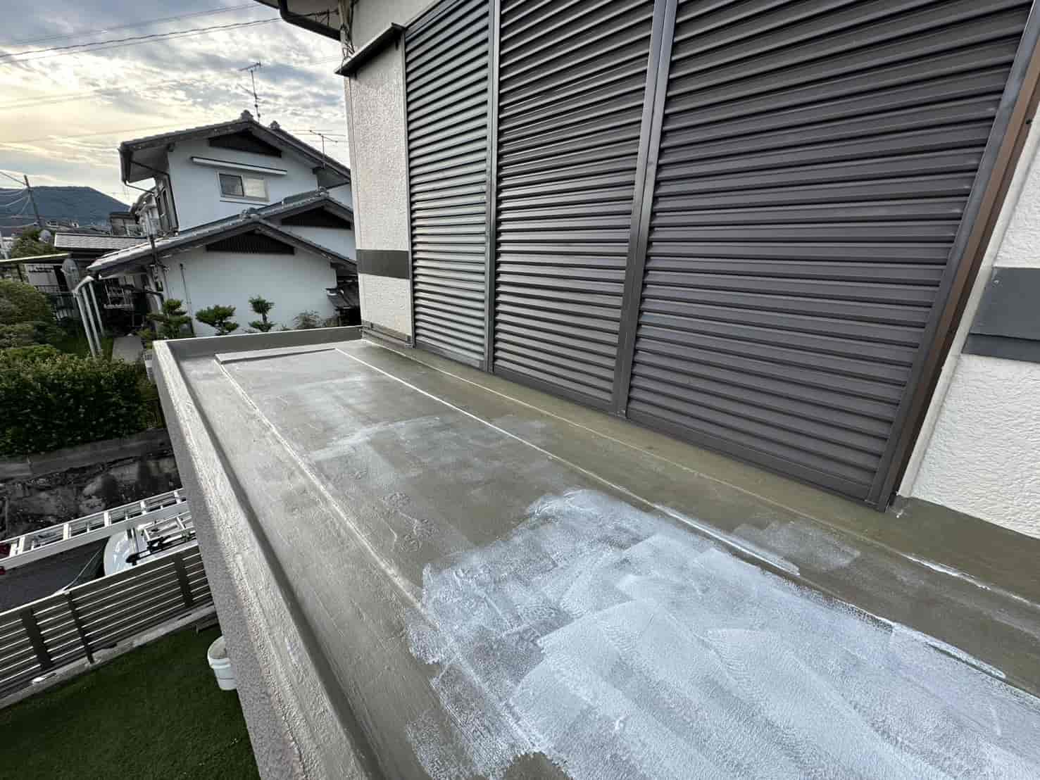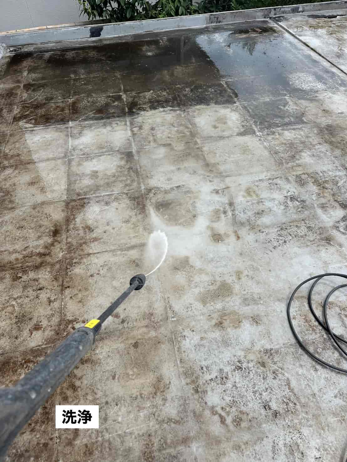 まずはベランダ全体を高圧洗浄し、長年の汚れや藻、ほこりを徹底的に除去します。下地に異物が残ると防水材の密着性が低下するため、初期段階での丁寧な清掃が重要です。