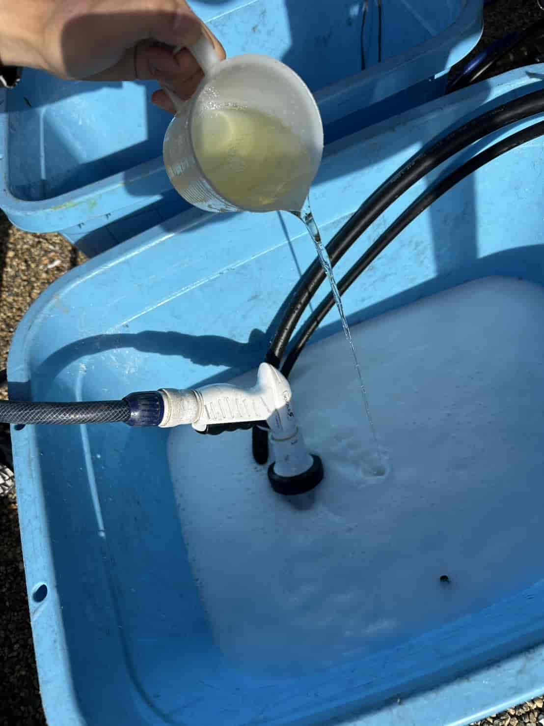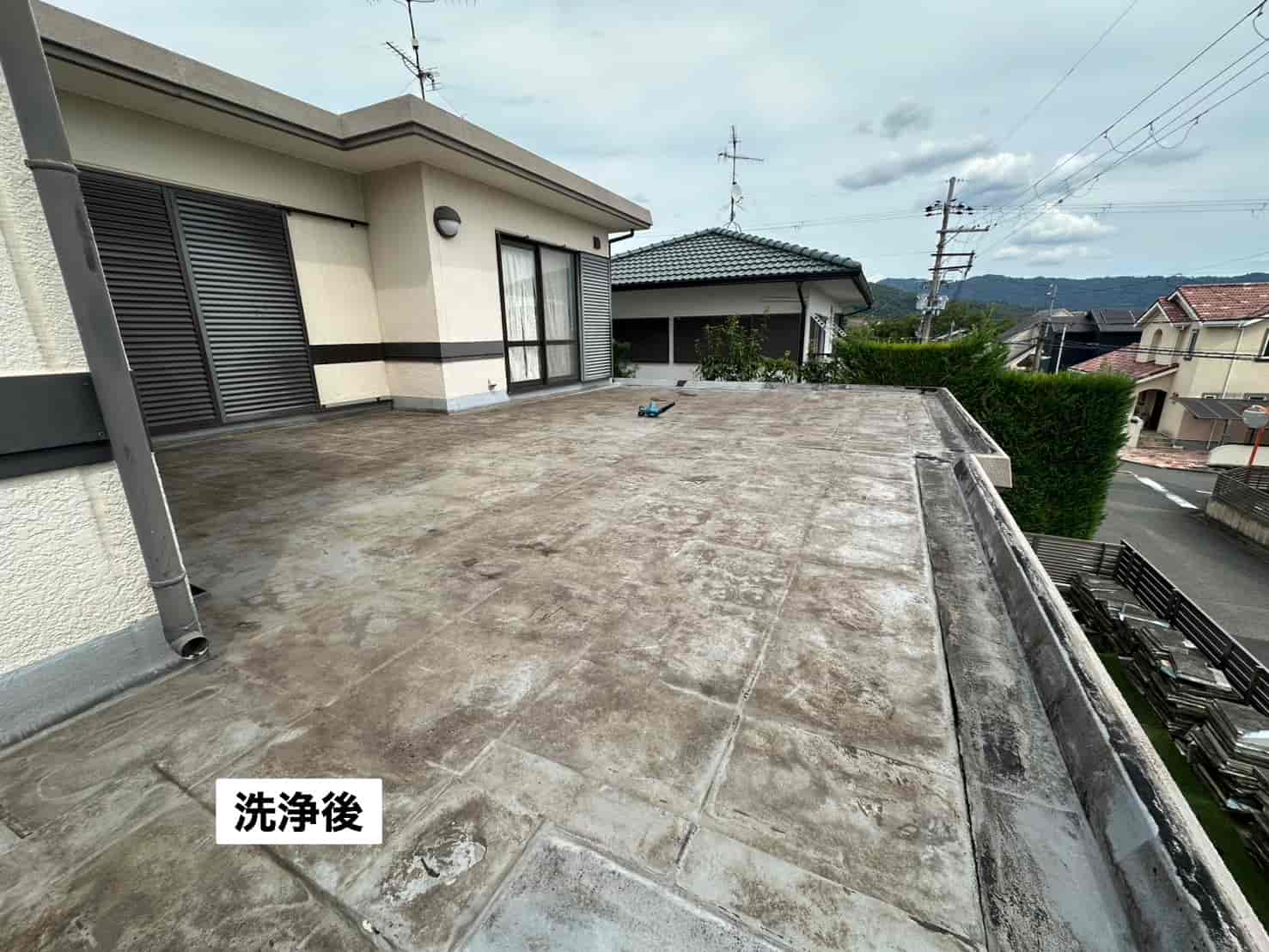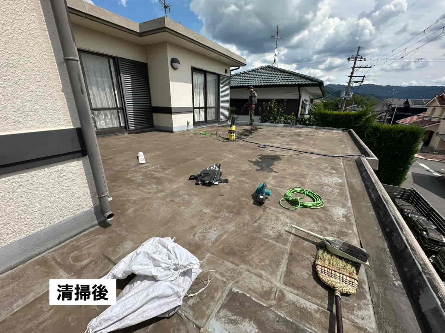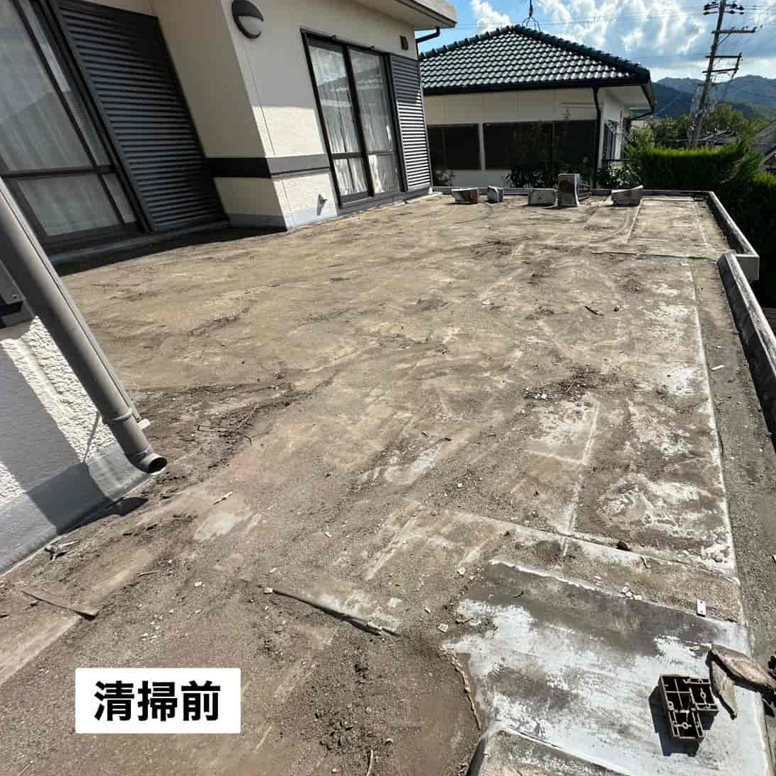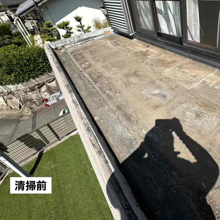 まずはベランダ全体を高圧洗浄し、長年の汚れや藻、ほこりを徹底的に除去します。下地に異物が残ると防水材の密着性が低下するため、初期段階での丁寧な清掃が重要です。