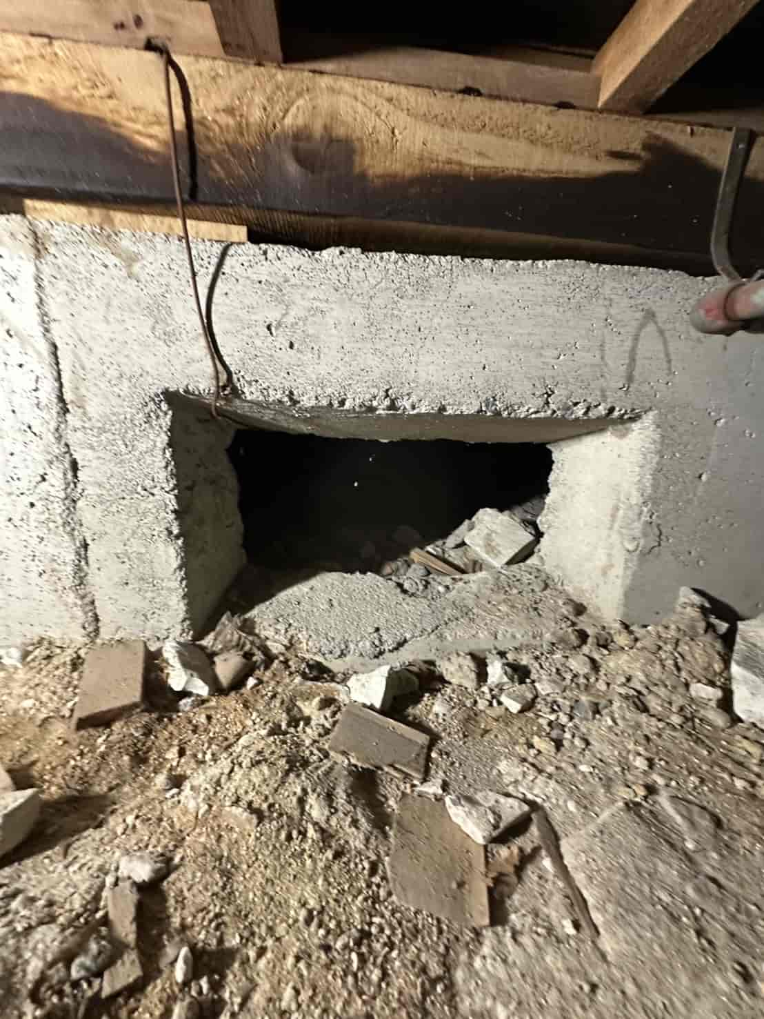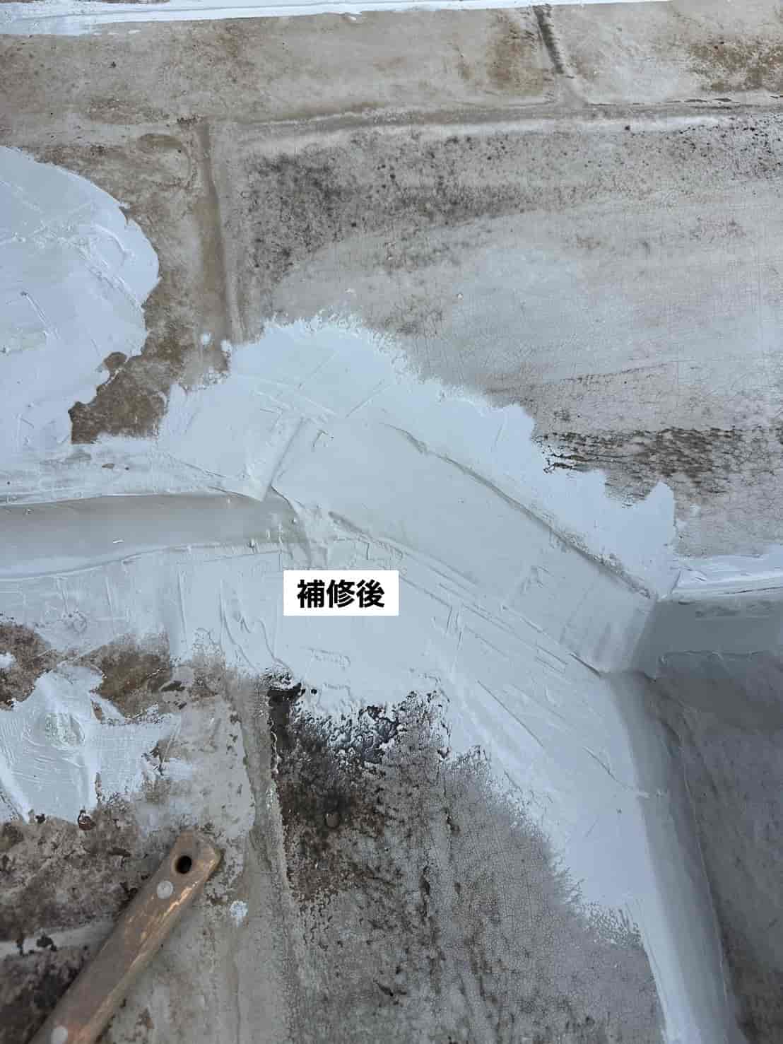 【対応】お客様から「2階の大きなベランダから雨漏りしている」とのご相談をいただき、現地調査を行ったところ、ベランダ床面近くの上部に目立つクラック(ひび割れ)が確認されました。長年の紫外線や風雨の影響で防水層が劣化し、ひび割れ部分から雨水が浸入していると考えられる状況でした。ウレタン防水工法による全面防水工事と改修ドレン新設を実施し、長期的な防水性を確保しました。