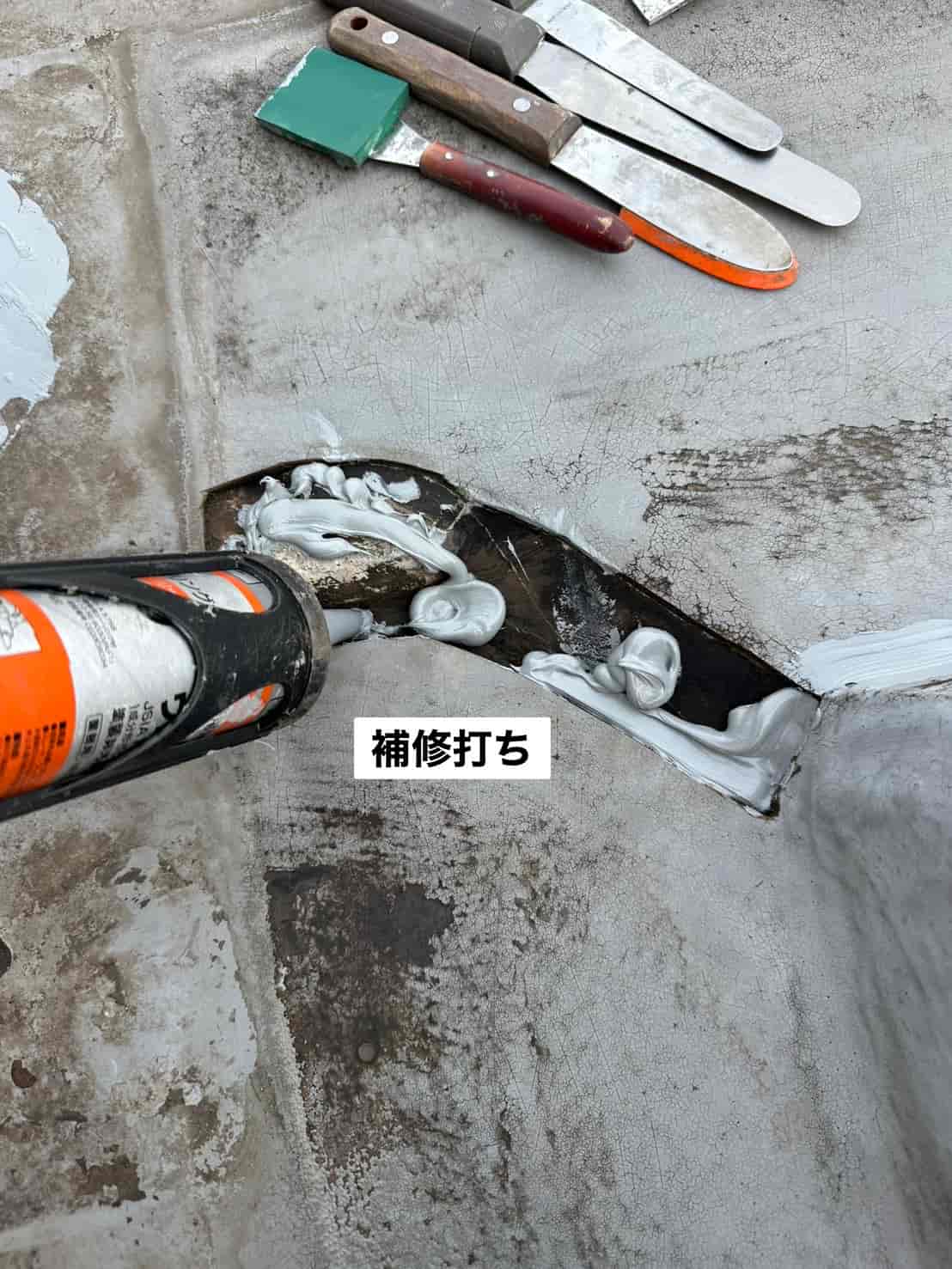 ひび割れや目地部にウレタン系シーリング材を充填。クラックからの浸水を防ぐと同時に、下地と防水層の動きを吸収できる柔軟性を確保します。