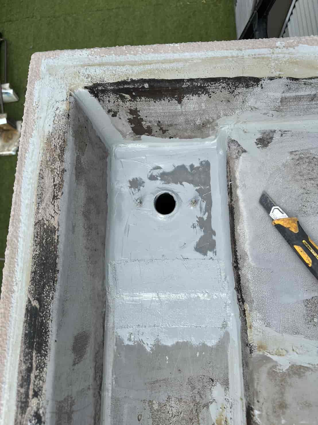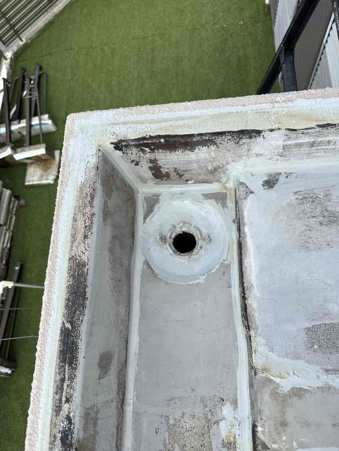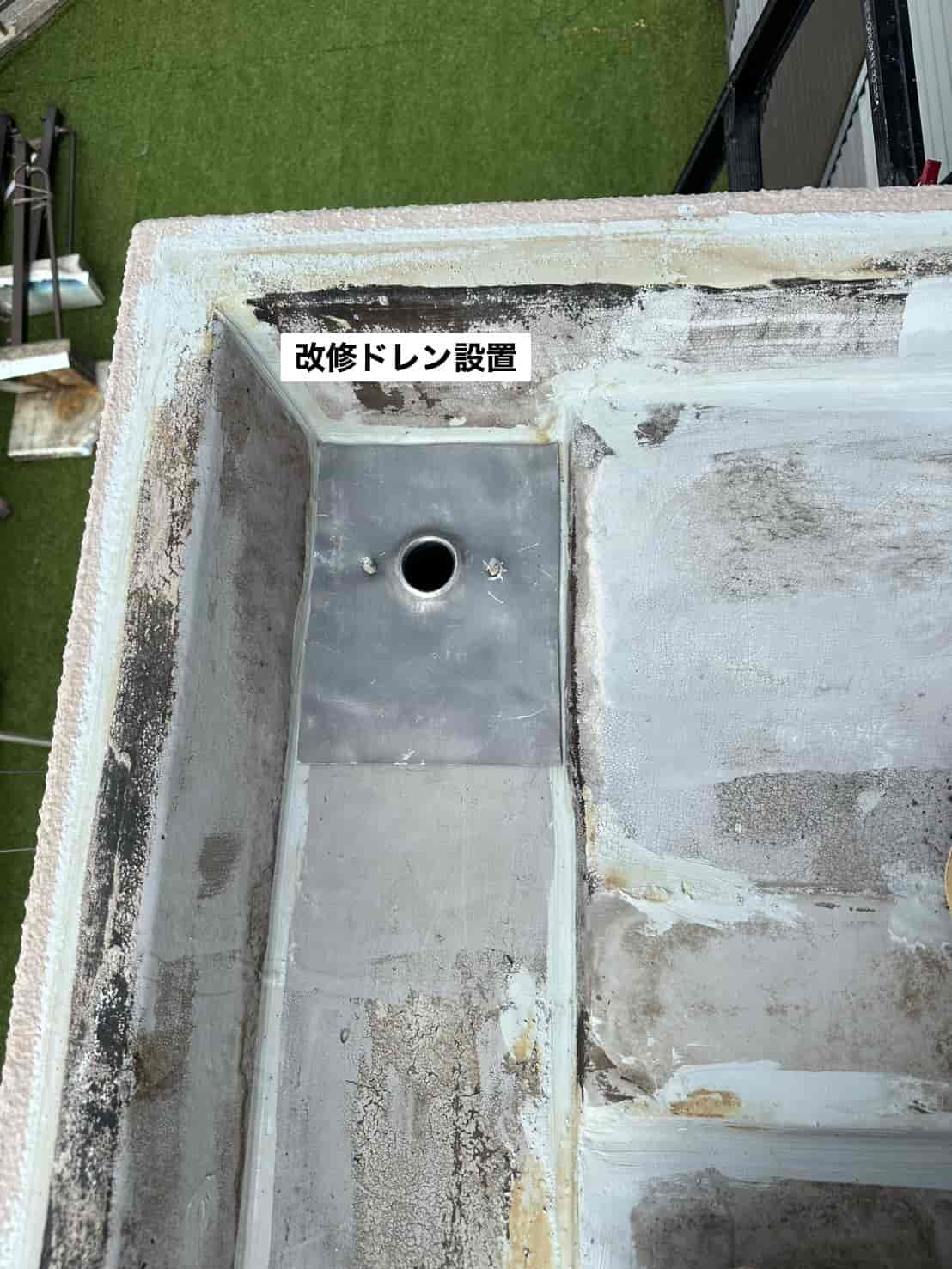 既存ドレン付近は雨水が集まりやすく、長期的には排水性能の低下が懸念されます。万一排水不良が起きると、雨漏り再発のリスクが高まるため、今回の工事では予防的措置として改修ドレンを新設しました。改修ドレンは既存の排水口を活かしつつ、新たな防水層と一体化させることで、より確実に排水できる構造となります。これにより、今後の大雨や長雨時にも安心してお過ごしいただけます。