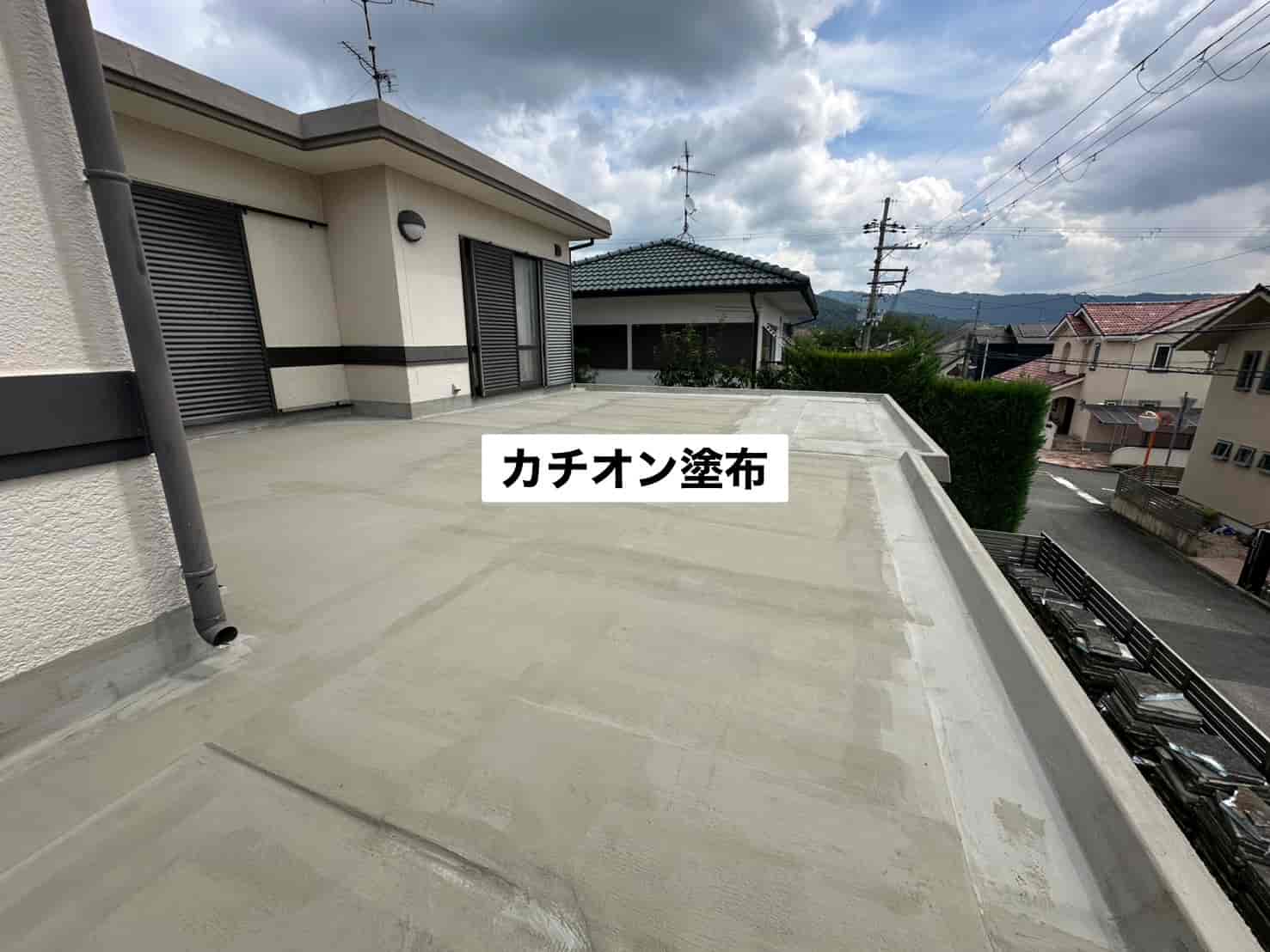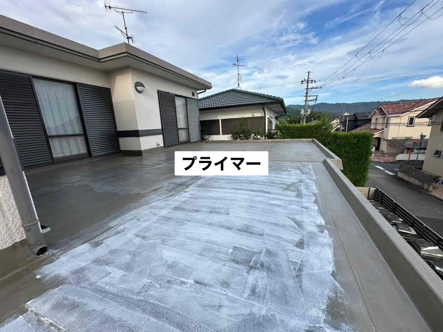 下地の不陸や微細な凹凸を平滑に整えるため、カチオン系の下地調整材を塗布。これによりプライマーや防水材が均一に密着し、仕上がりの品質が向上します。