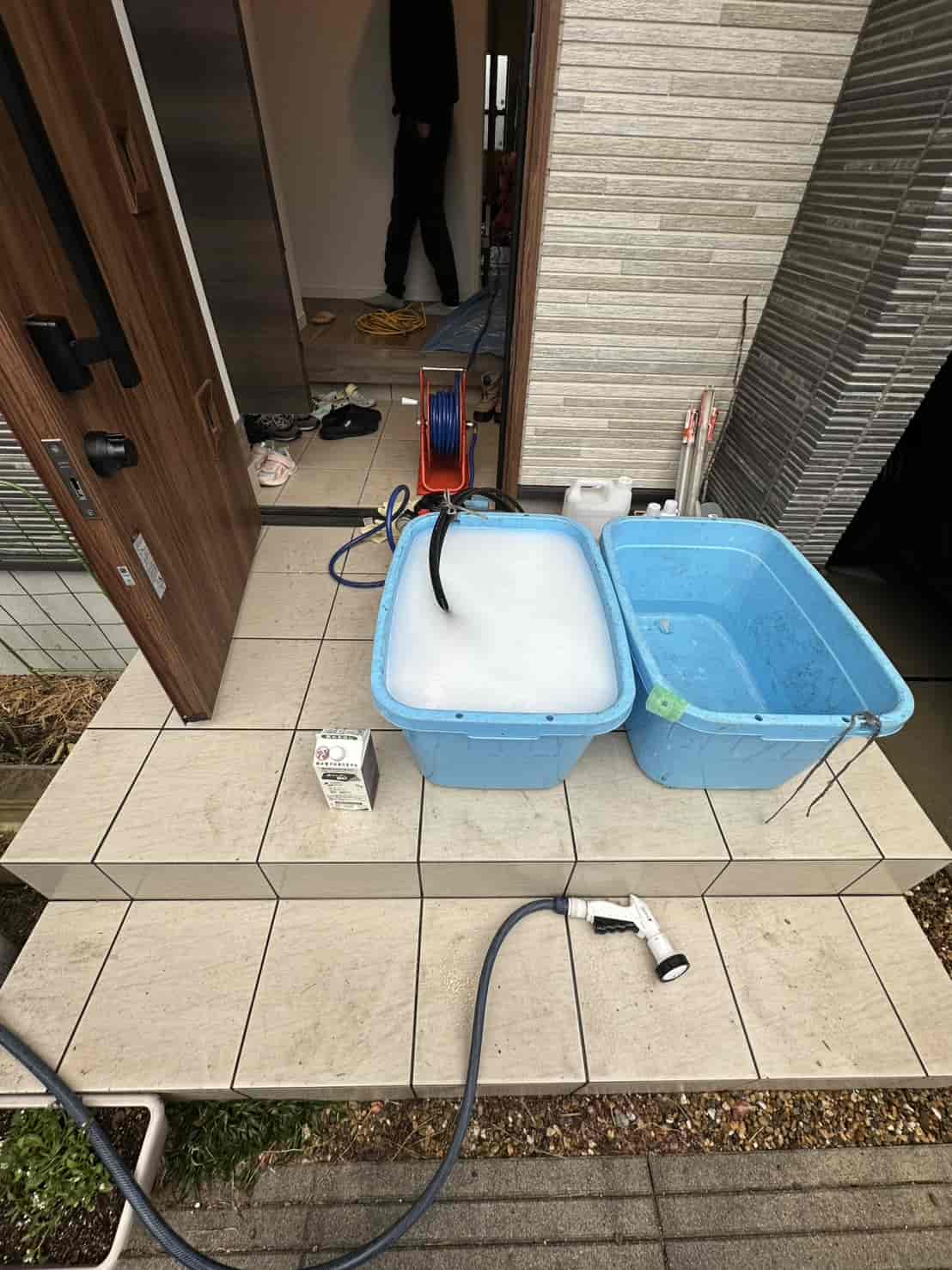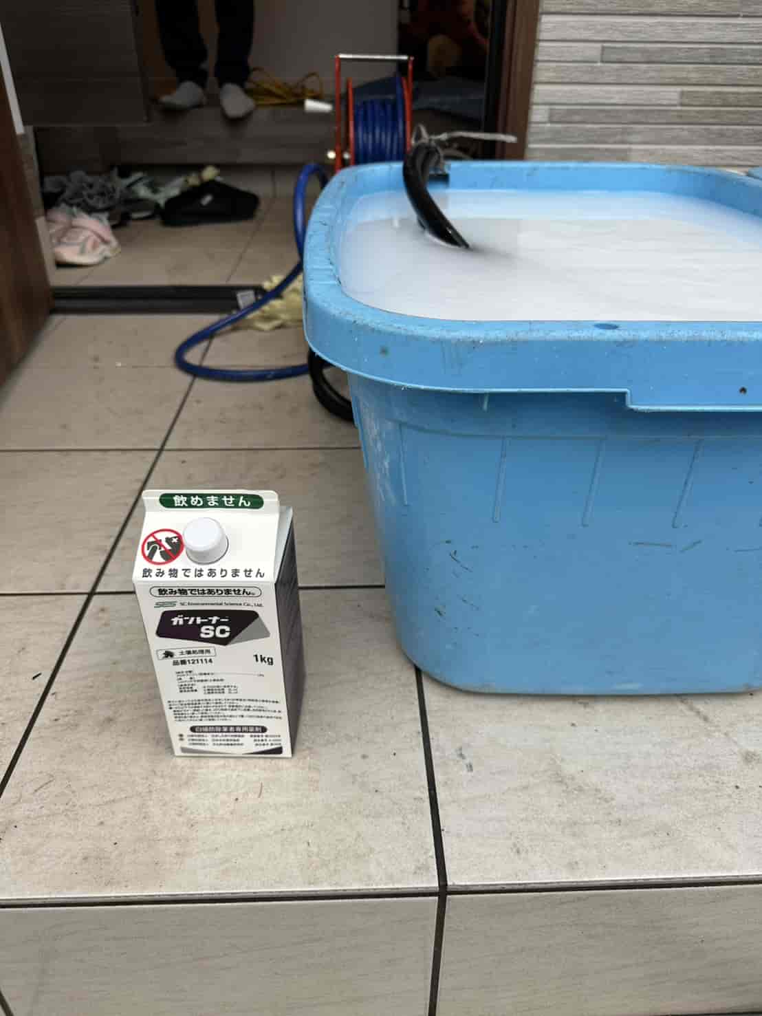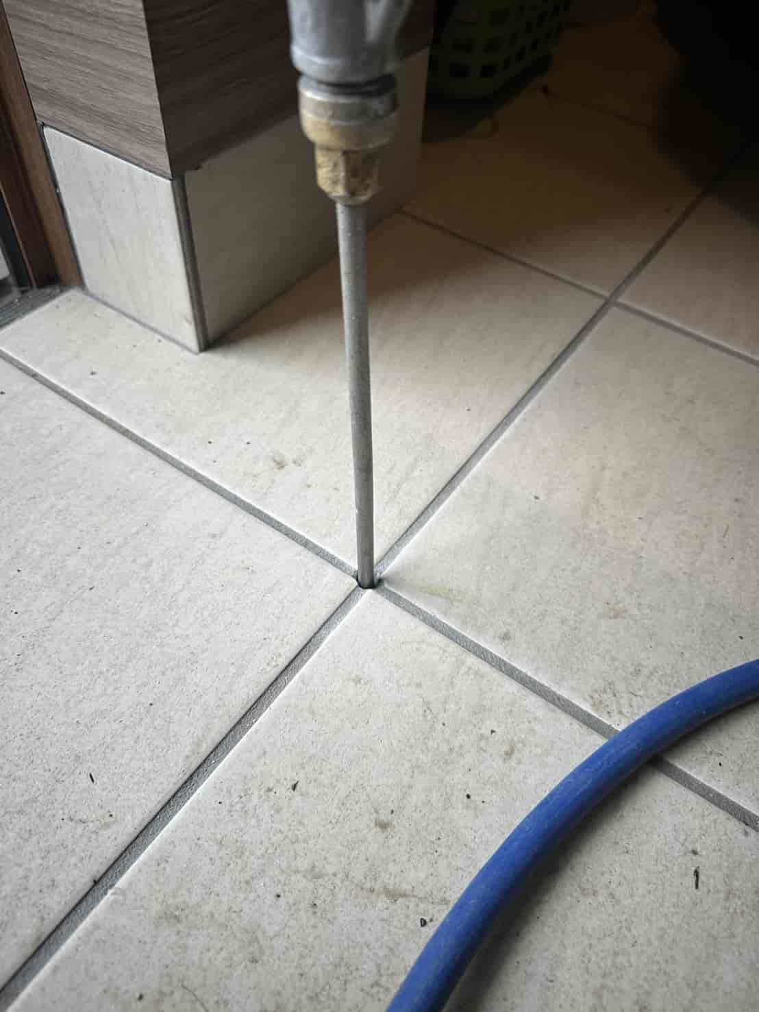 今回の住宅は玄関が広めのタイプでした。玄関部分は床下からの散布ができない構造のため、スラブタイル穿孔注入処理を行いました。タイルの目地部分などから穿孔し、薬剤をコンクリート下へ注入します。これにより、土間下からの白アリ侵入をしっかりブロックします。玄関は侵入リスクが高い箇所の一つです。ここをきちんと処理するかどうかで、予防効果に大きな差が出ます。