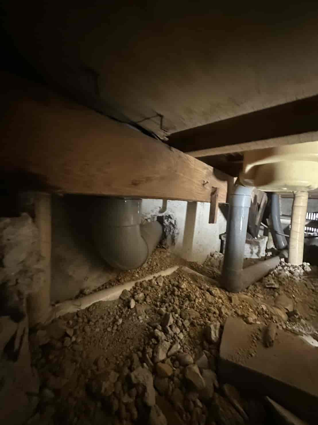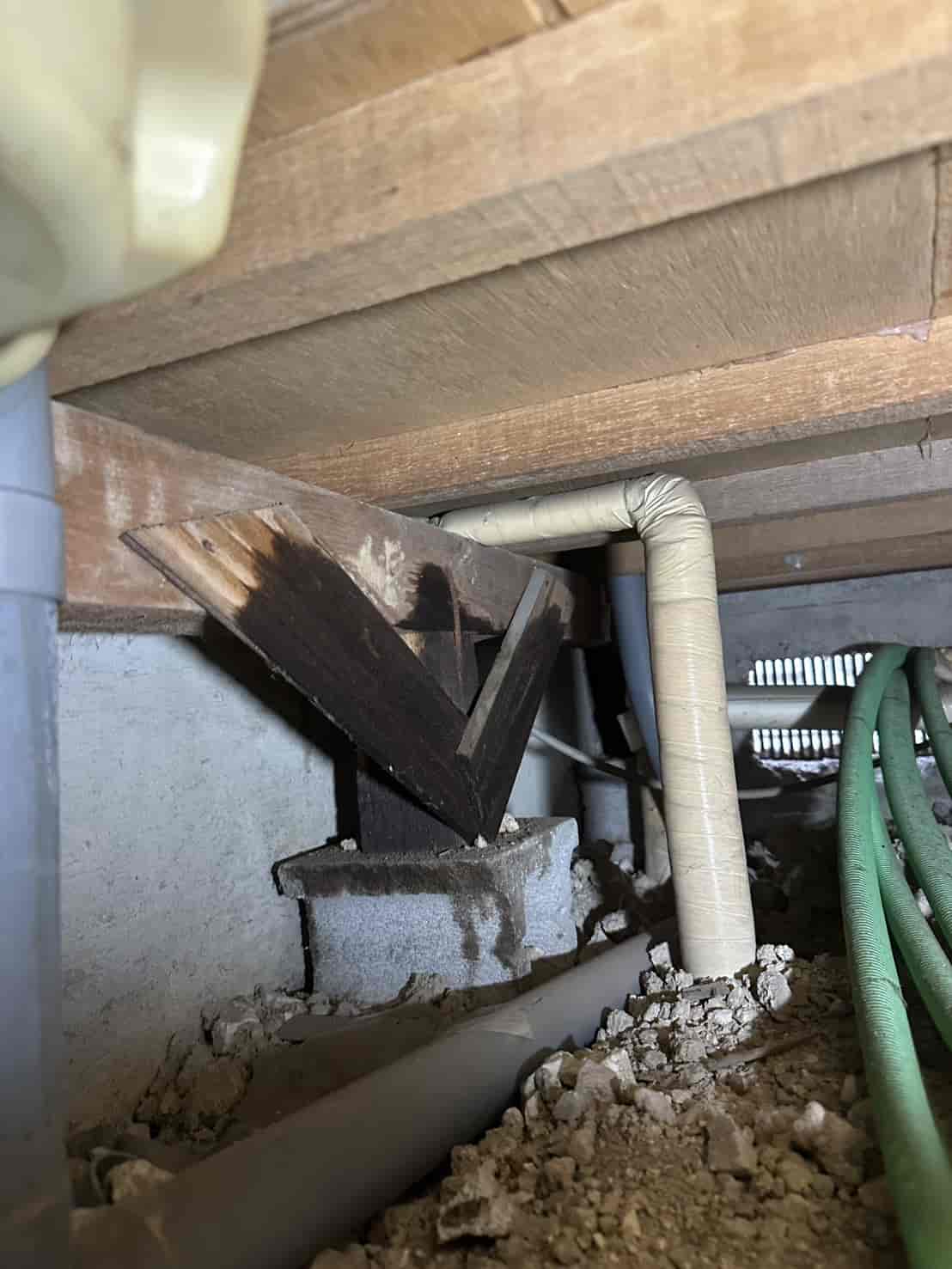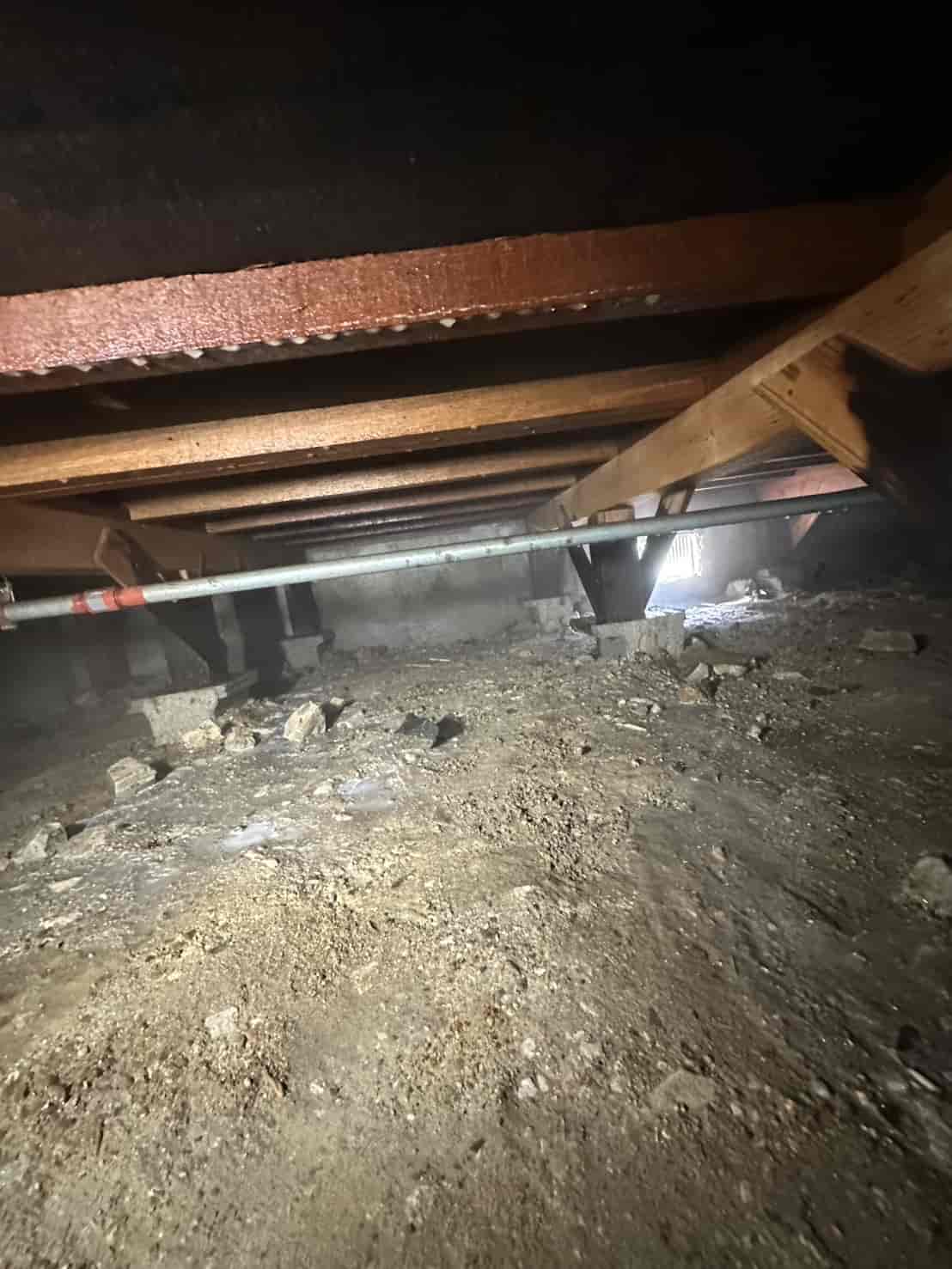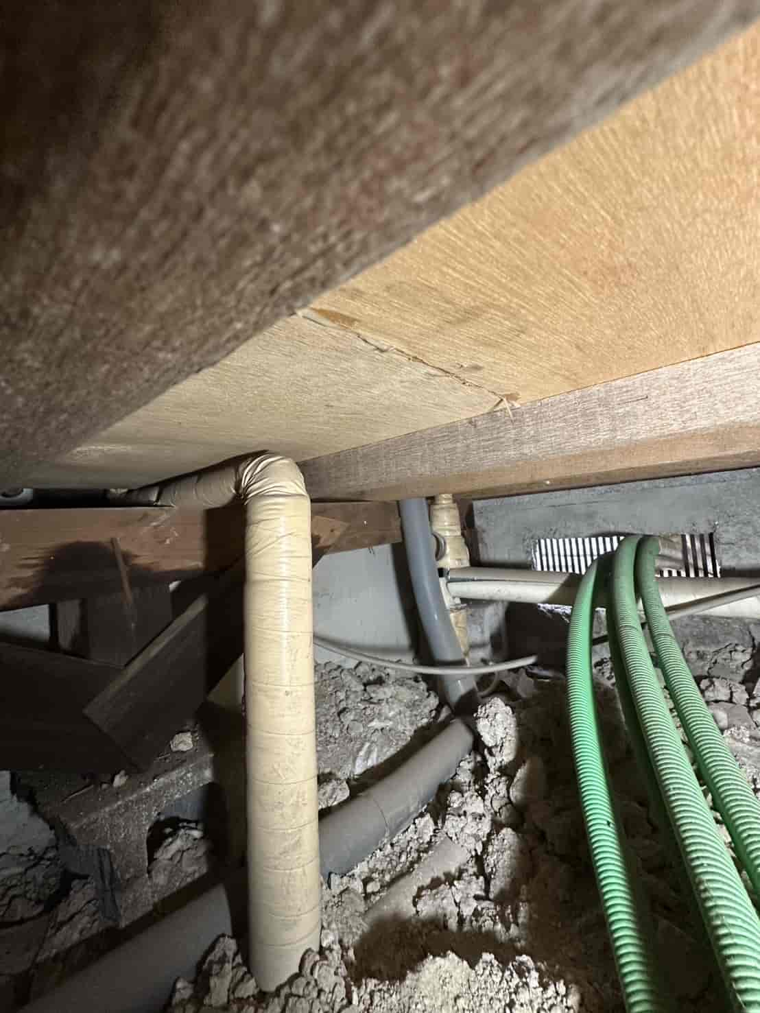 それでも、わずかな隙間から別の区画を覗いたところ、しっかりとした「蟻道(ぎどう)」が確認できました。蟻道とは、シロアリが地中や床下から木材へ侵入するために作るトンネル状の通路で、これが存在するということは、すでにシロアリが建物内部に侵入し被害を拡大させている証拠です。目に見える範囲だけでなく、基礎内部や壁際にまで被害が及んでいると判断しました。