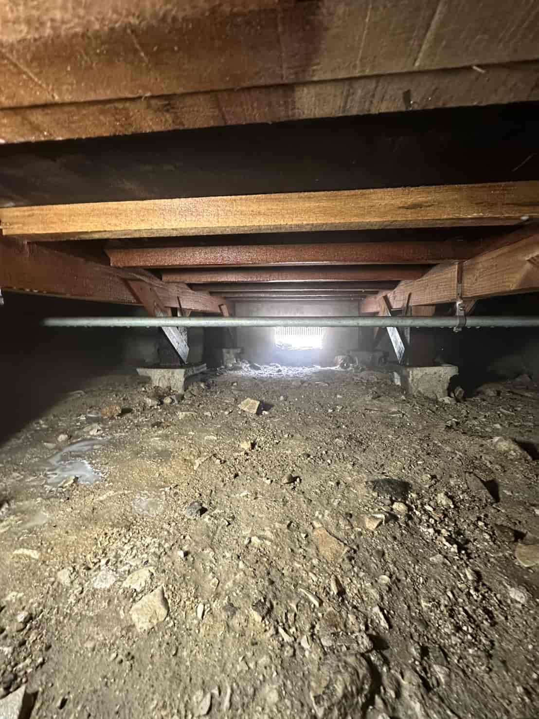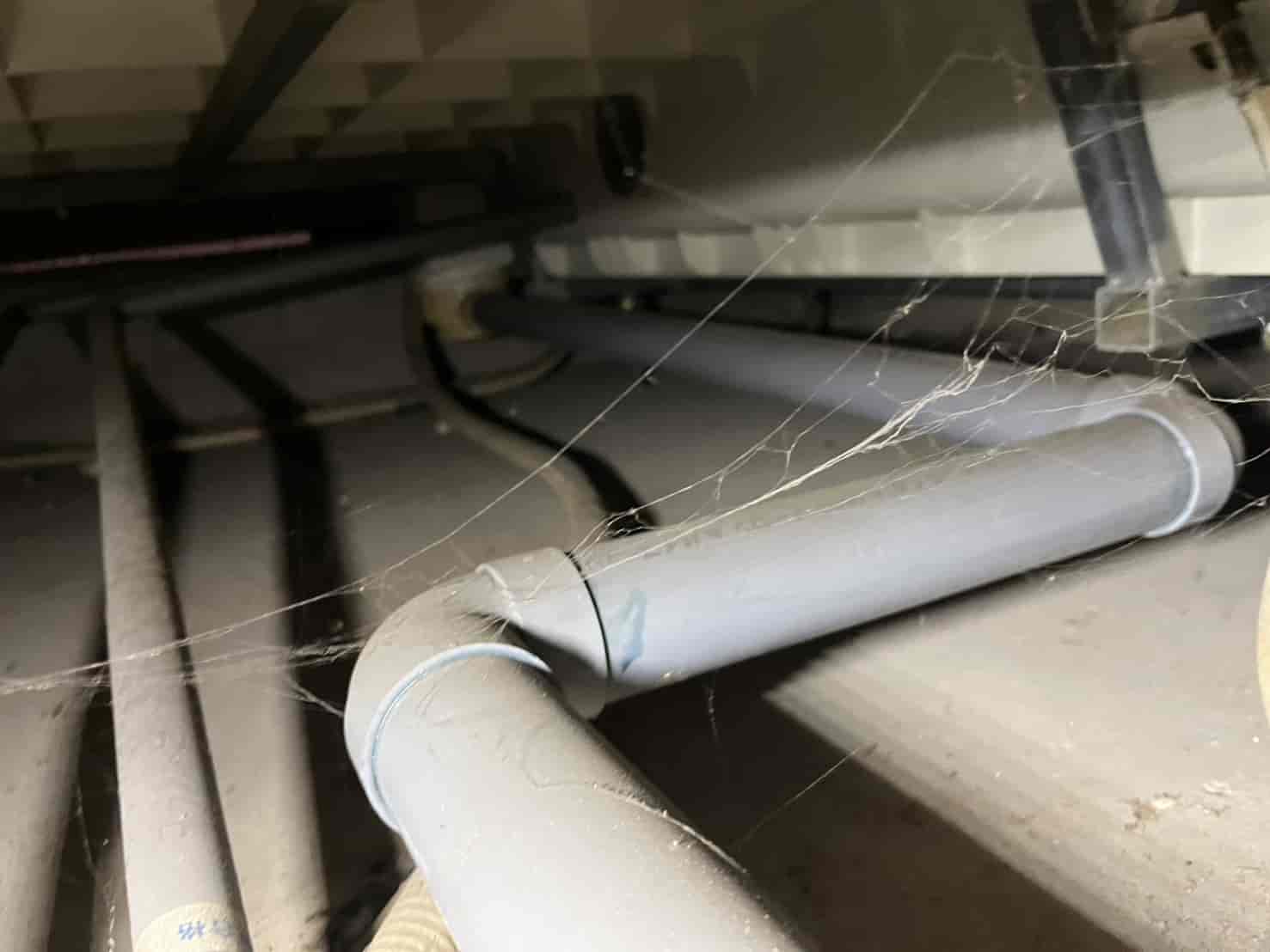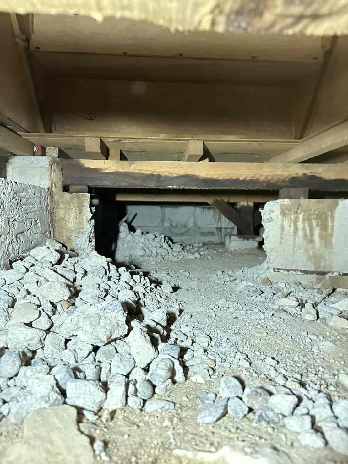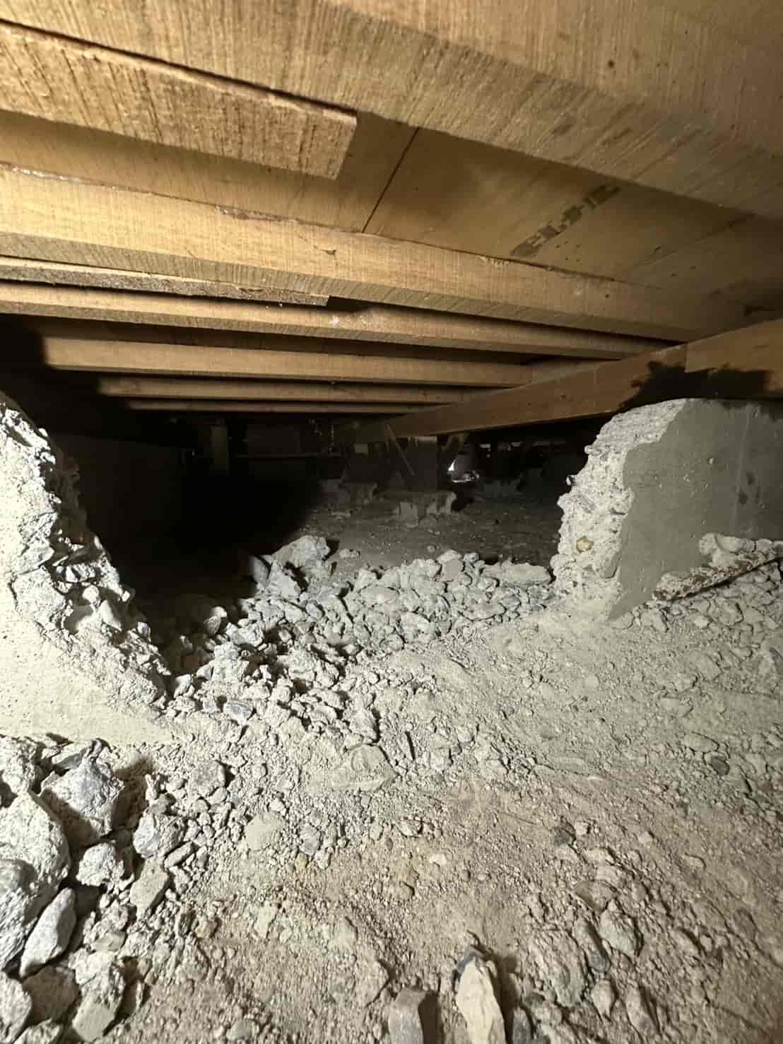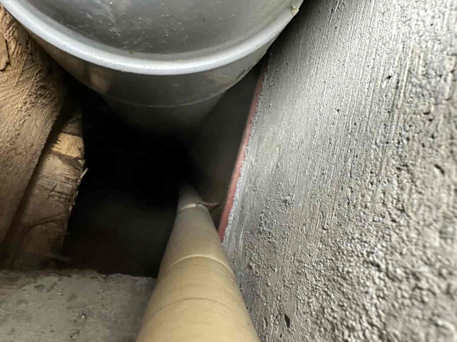 それでも、わずかな隙間から別の区画を覗いたところ、しっかりとした「蟻道(ぎどう)」が確認できました。蟻道とは、シロアリが地中や床下から木材へ侵入するために作るトンネル状の通路で、これが存在するということは、すでにシロアリが建物内部に侵入し被害を拡大させている証拠です。目に見える範囲だけでなく、基礎内部や壁際にまで被害が及んでいると判断しました。