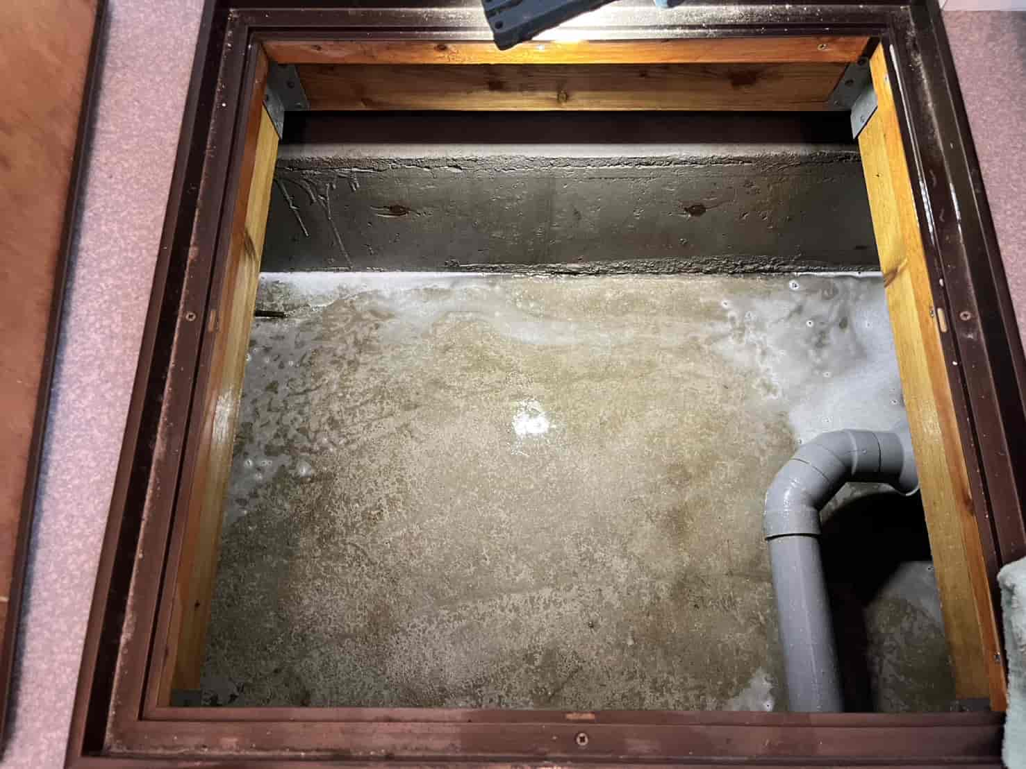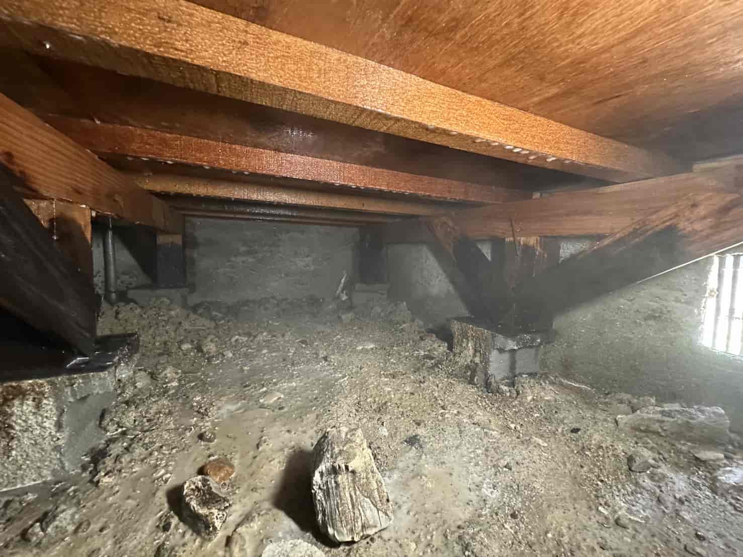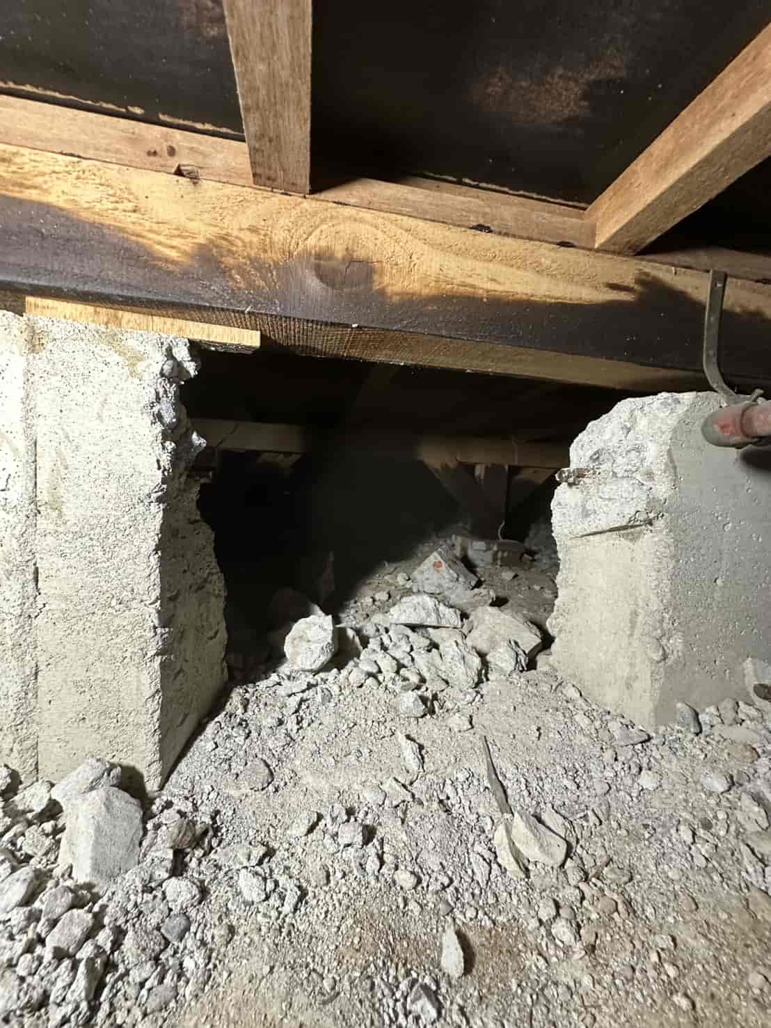 実際に現場を確認したところ、畳は確かに食害を受けており、床下にシロアリが侵入している可能性が高いと判断しました。しかし、すべての床下に容易に入れるわけではなく、一部しか人が入れない構造でした。建物はコンクリート基礎で区切られており、床下の空間が複雑に仕切られているため、目視だけでは全体を確認することが難しい状況でした。
