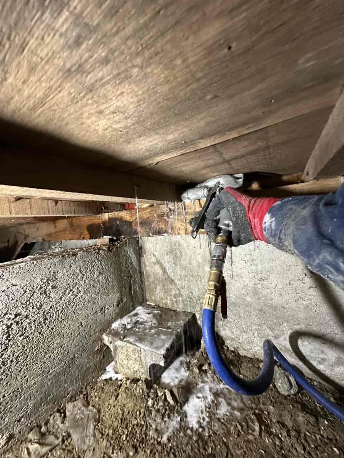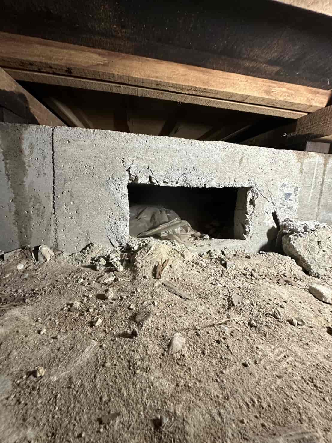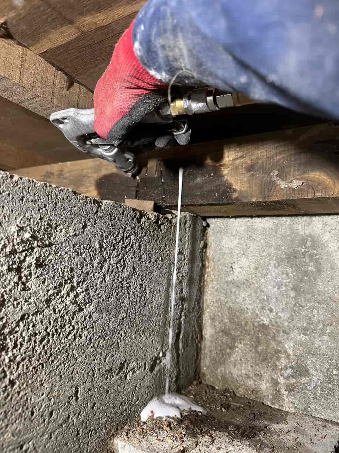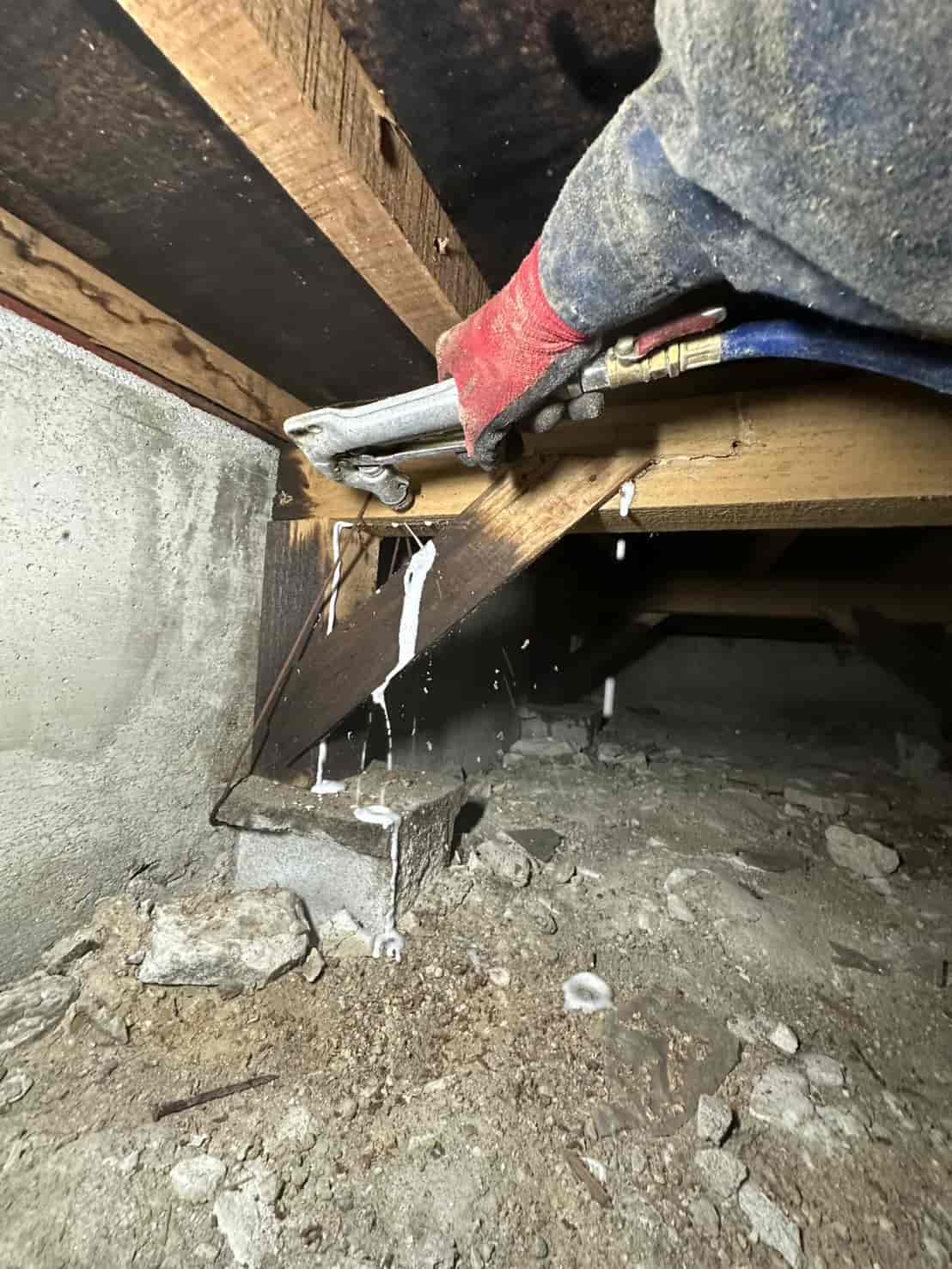 区切られた床下をつなぐため、一部の基礎コンクリートをハツリ(削る)作業を行いました。これにより隣接する空間にアクセスでき、薬剤を隅々まで行き渡らせることが可能となります。基礎のハツリは建物に影響を与えない範囲で最小限にとどめ、作業後は丁寧に補修しました。
