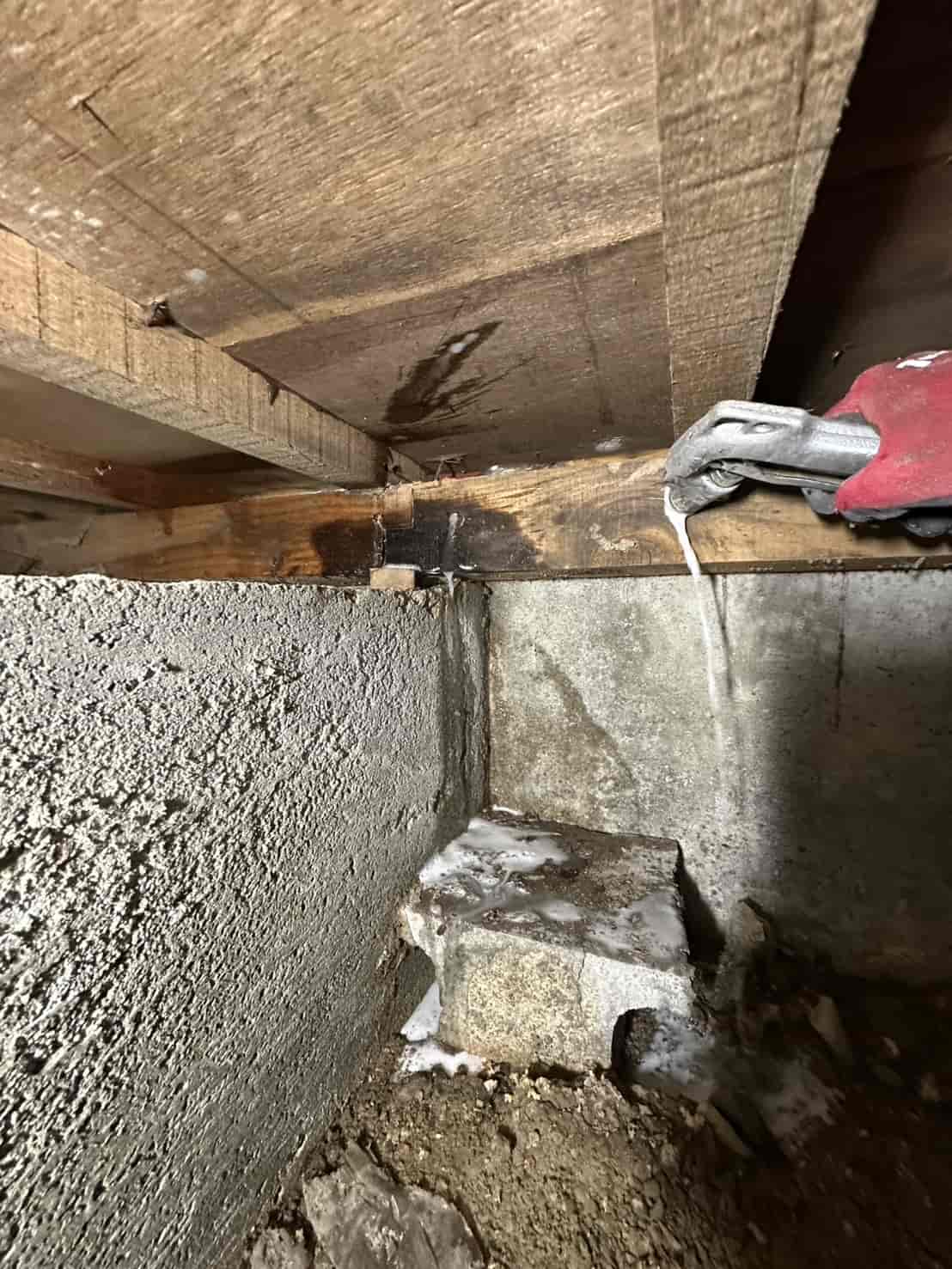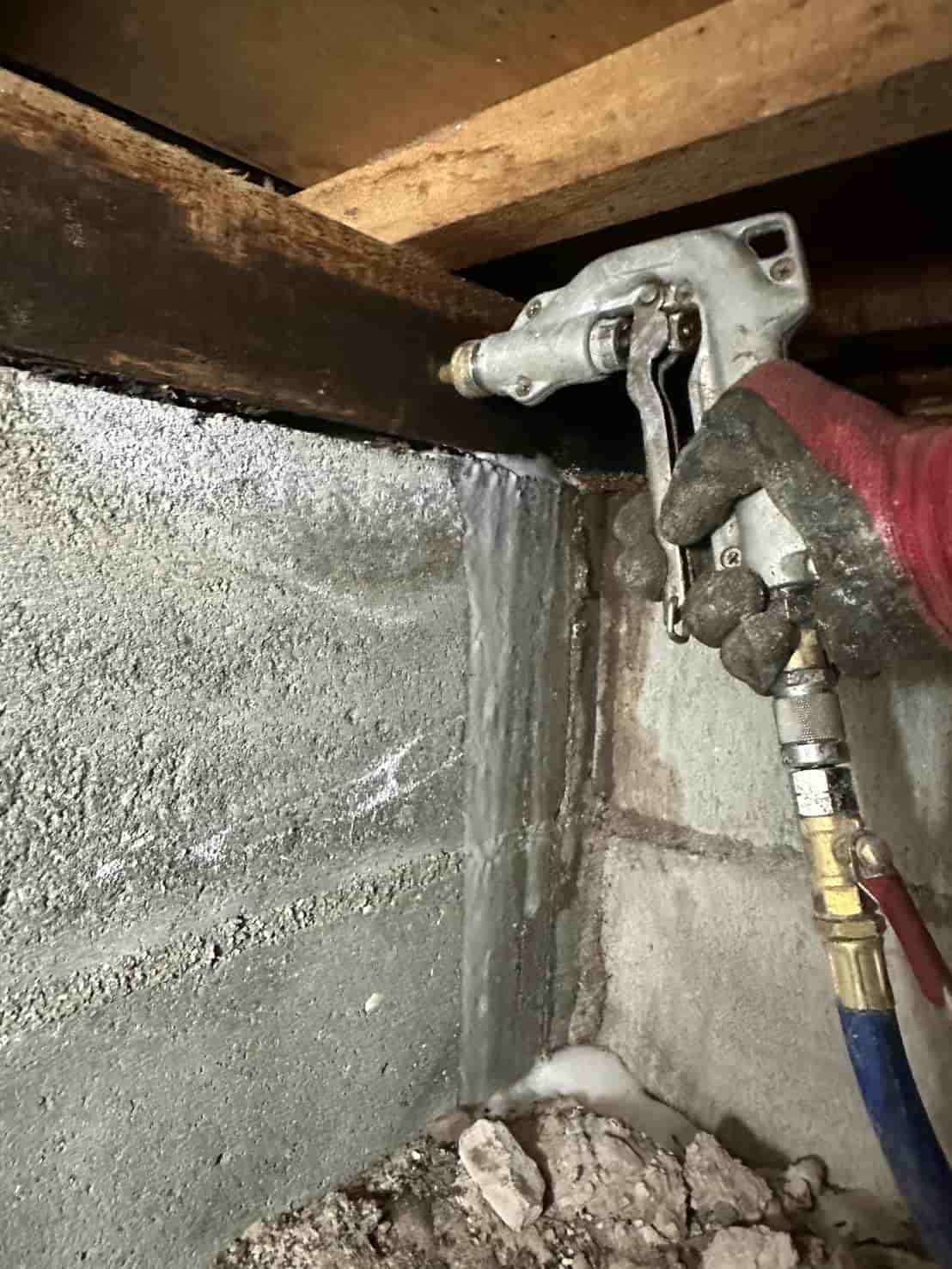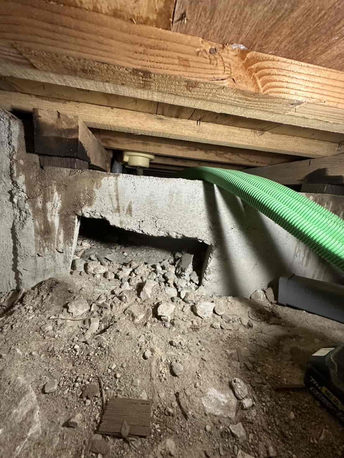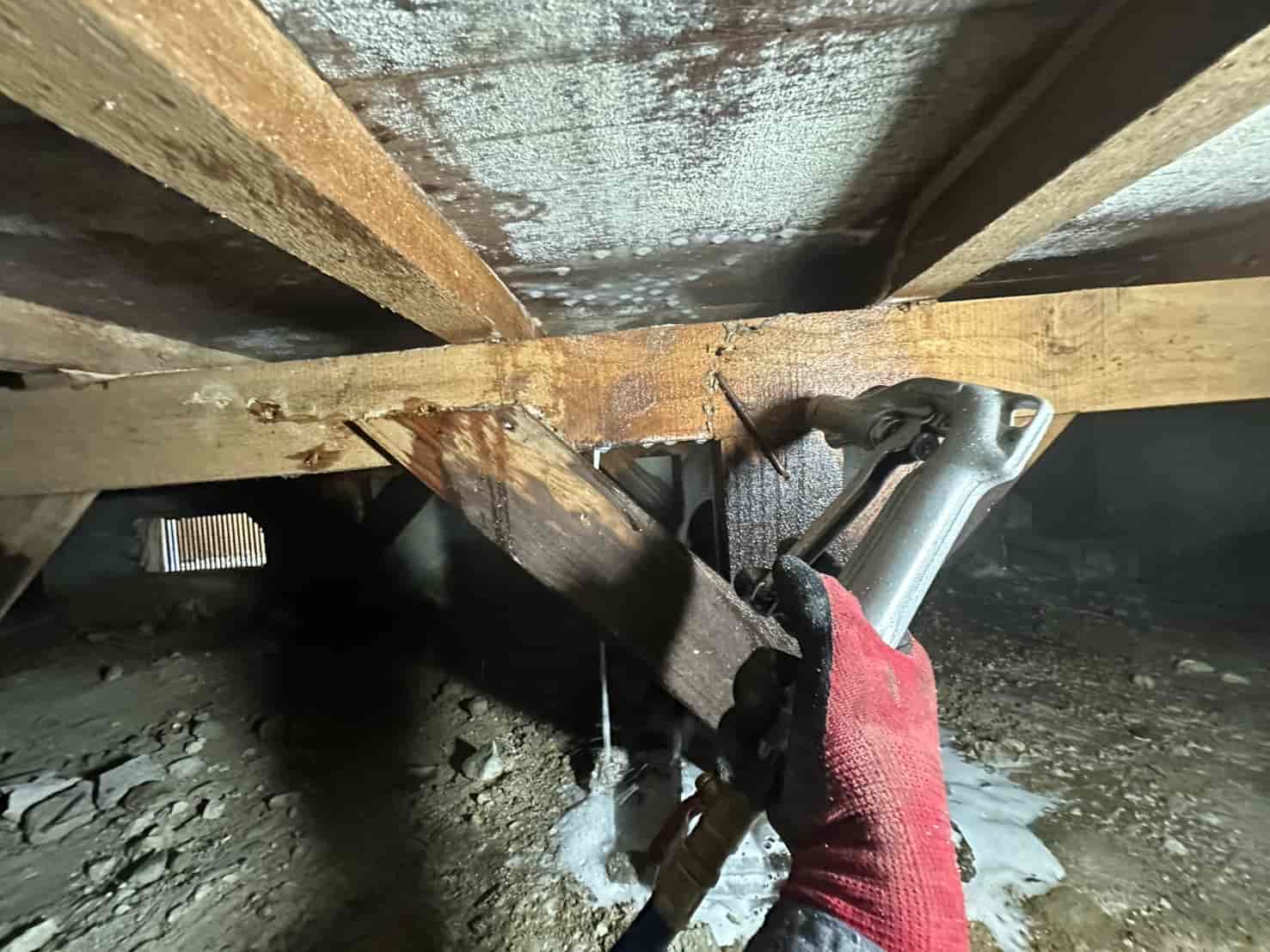 区切られた床下をつなぐため、一部の基礎コンクリートをハツリ(削る)作業を行いました。これにより隣接する空間にアクセスでき、薬剤を隅々まで行き渡らせることが可能となります。基礎のハツリは建物に影響を与えない範囲で最小限にとどめ、作業後は丁寧に補修しました。
