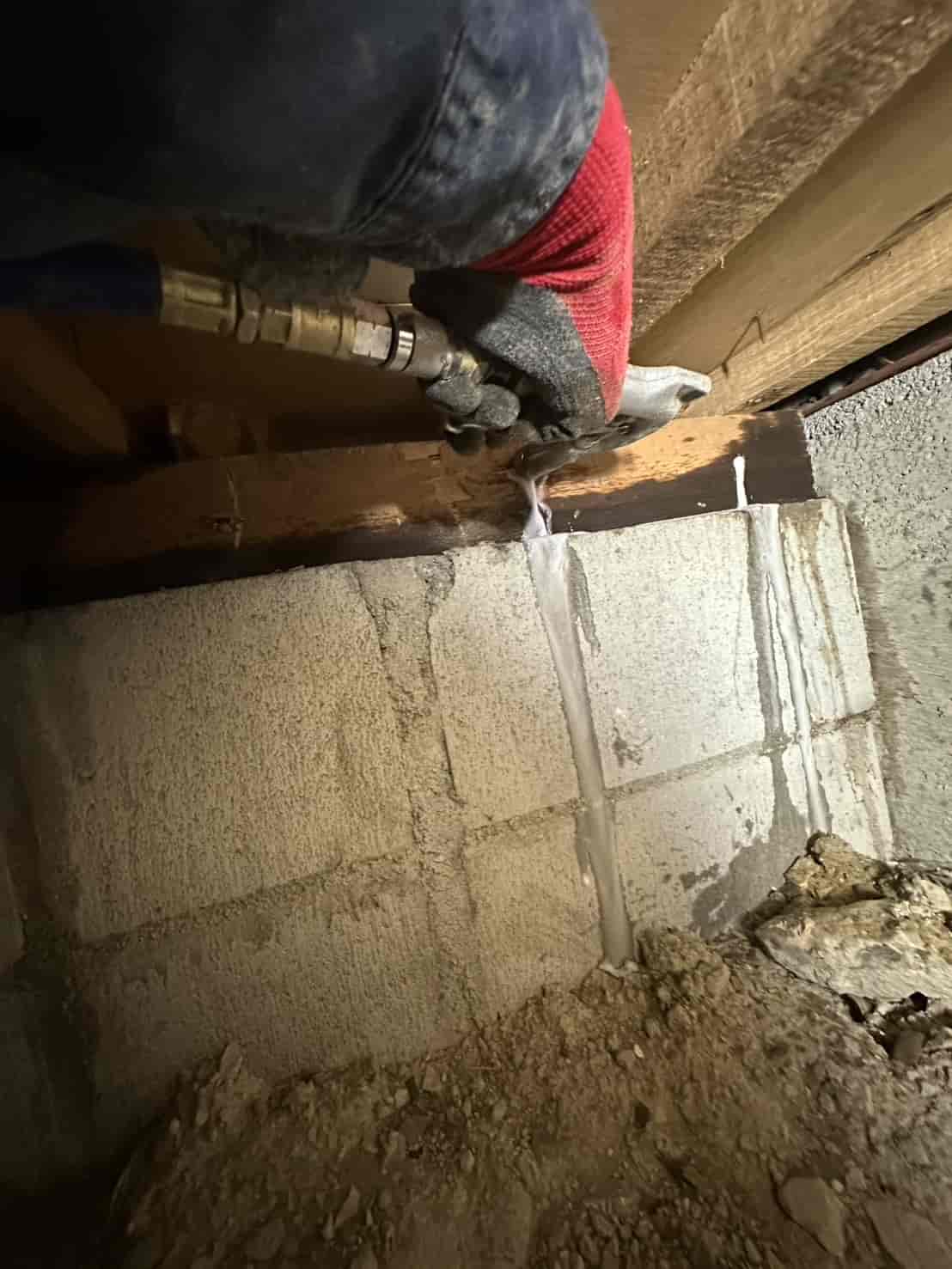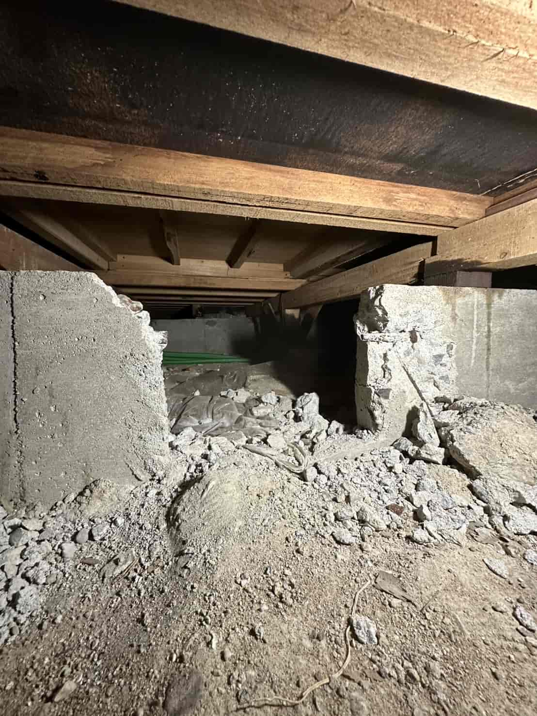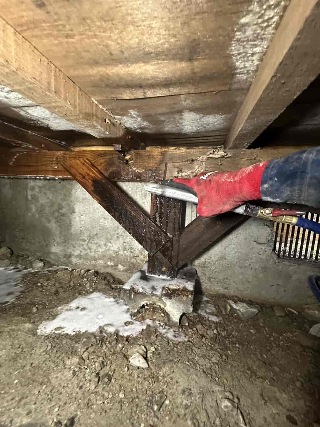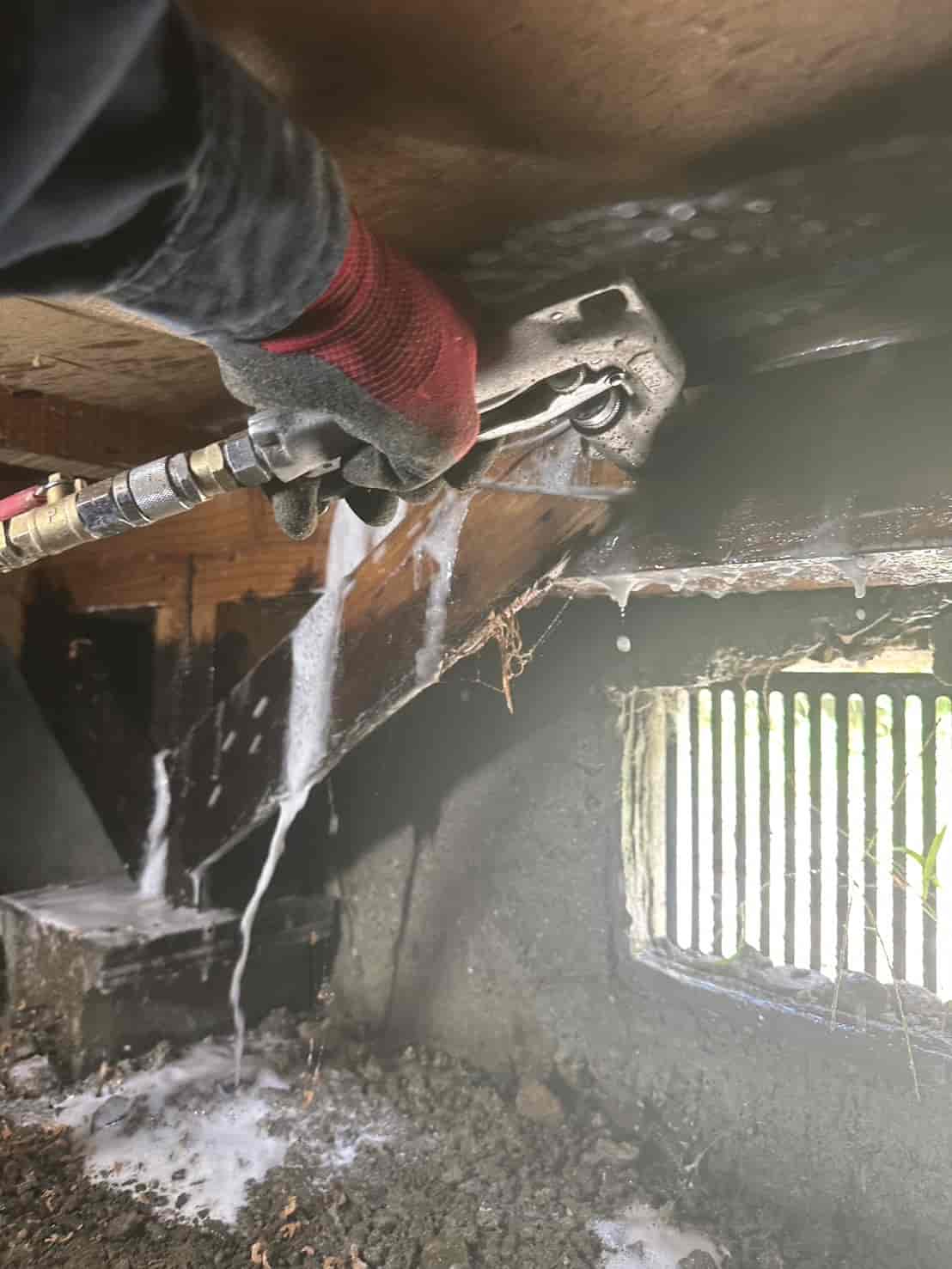 区切られた床下をつなぐため、一部の基礎コンクリートをハツリ(削る)作業を行いました。これにより隣接する空間にアクセスでき、薬剤を隅々まで行き渡らせることが可能となります。基礎のハツリは建物に影響を与えない範囲で最小限にとどめ、作業後は丁寧に補修しました。
