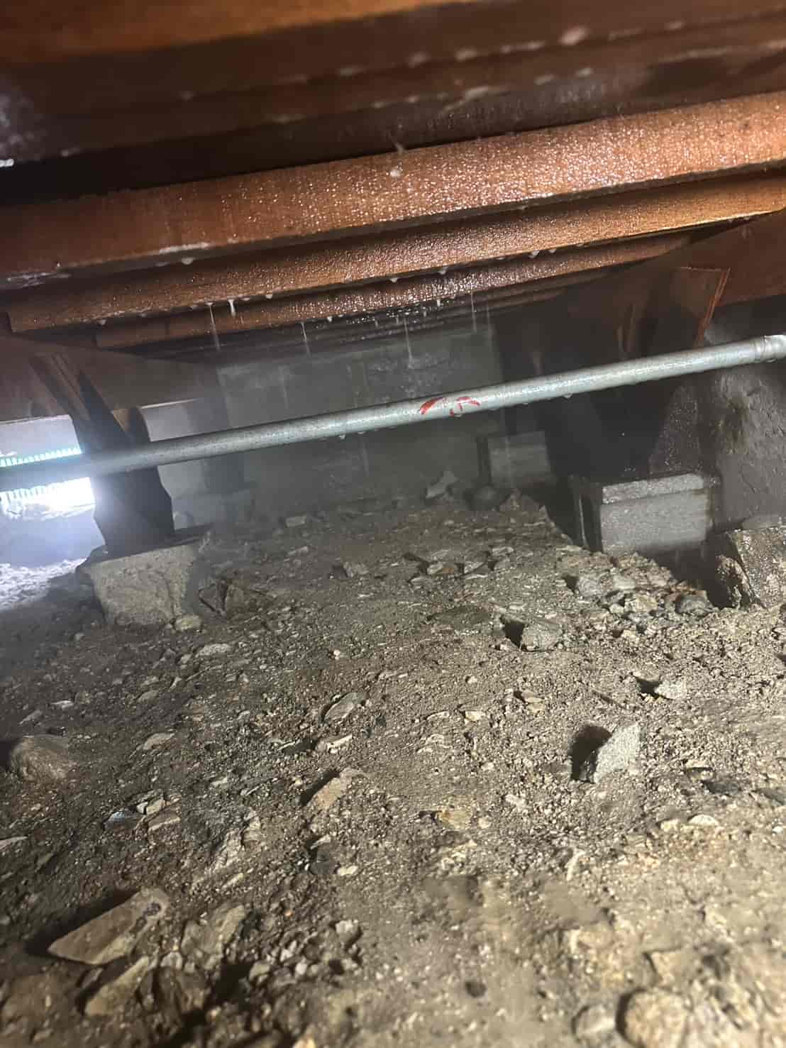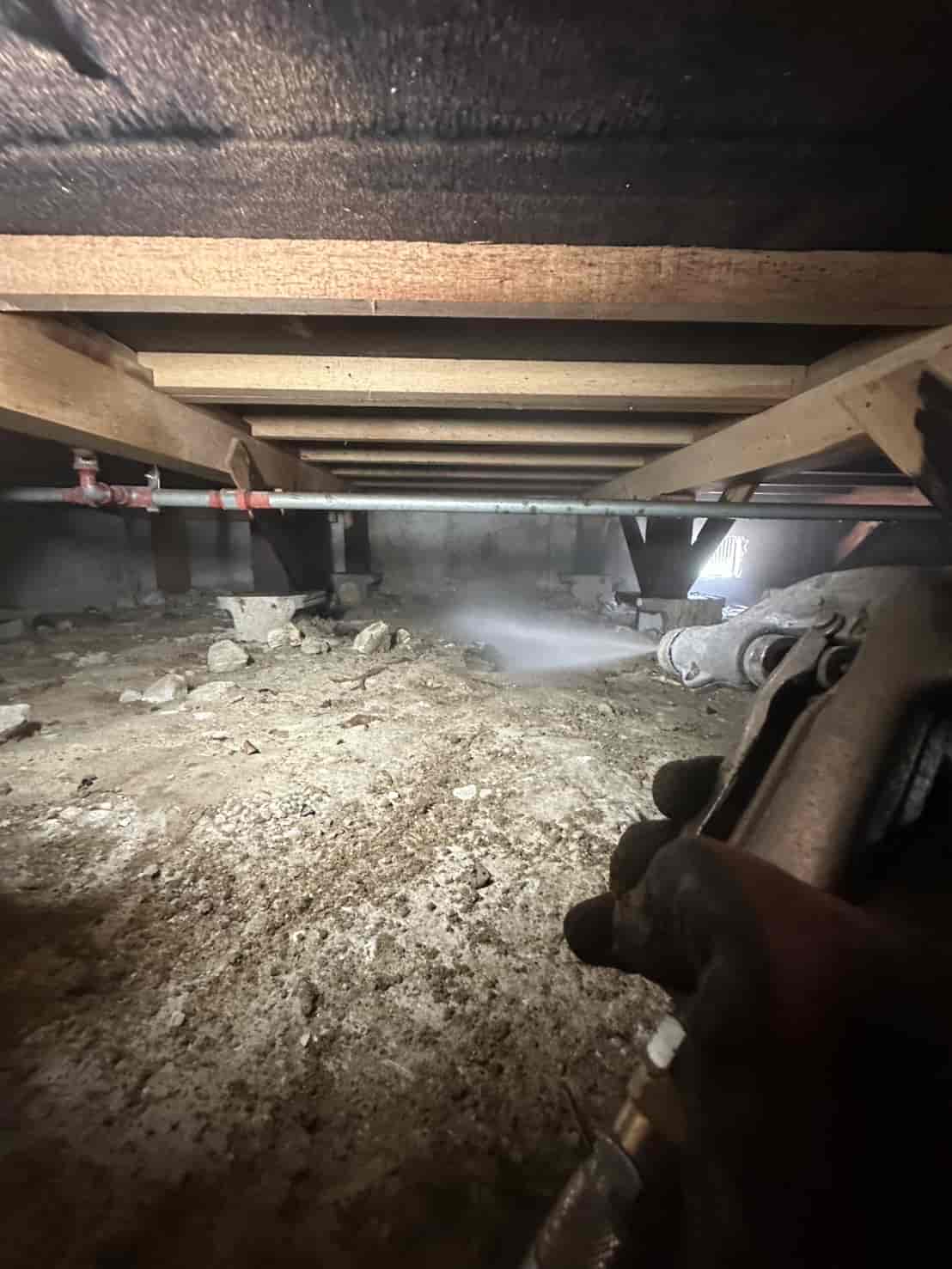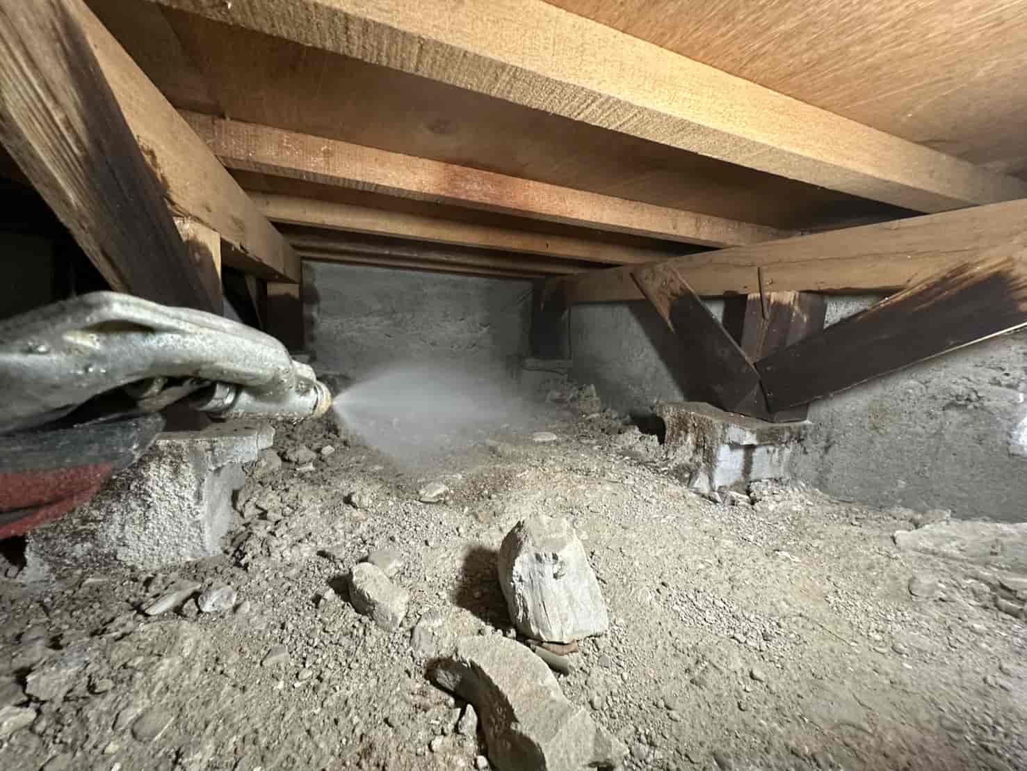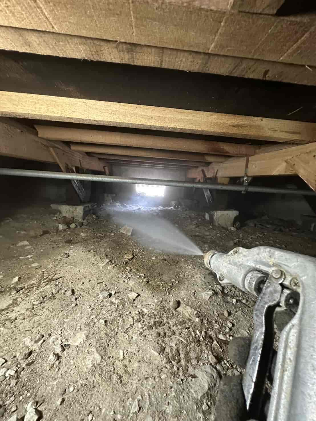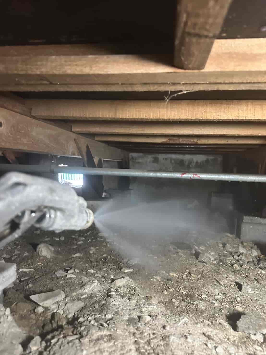 床下全体には薬剤を広く散布し、シロアリの侵入経路を断ち切るとともに、潜んでいる個体を駆除しました。特に基礎の境界部分や湿気がこもりやすい箇所を重点的に処理しています。