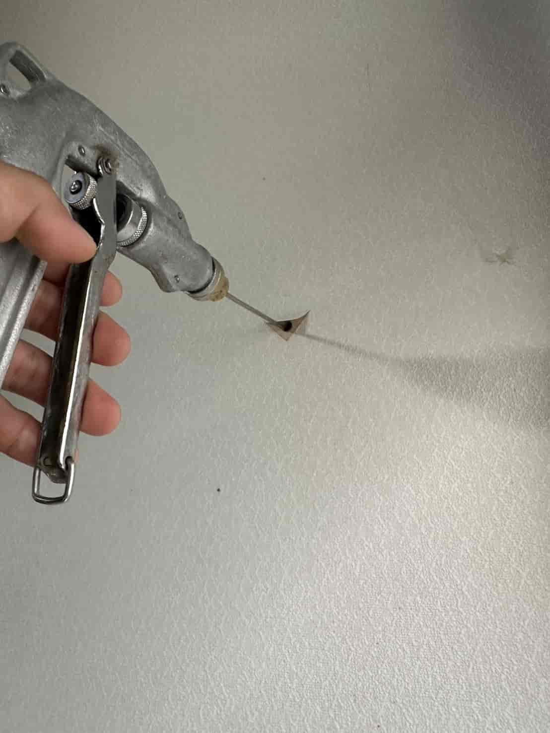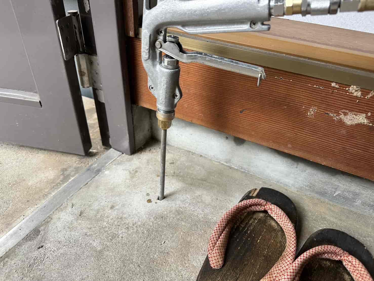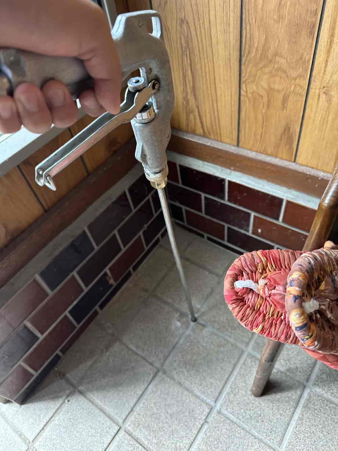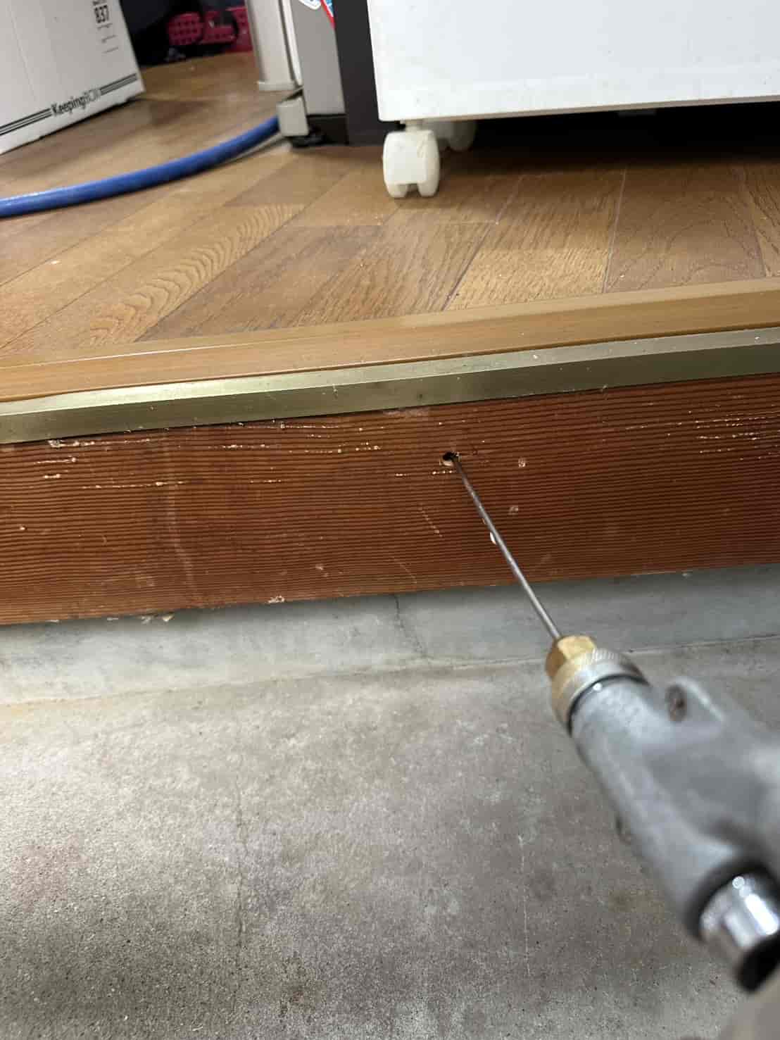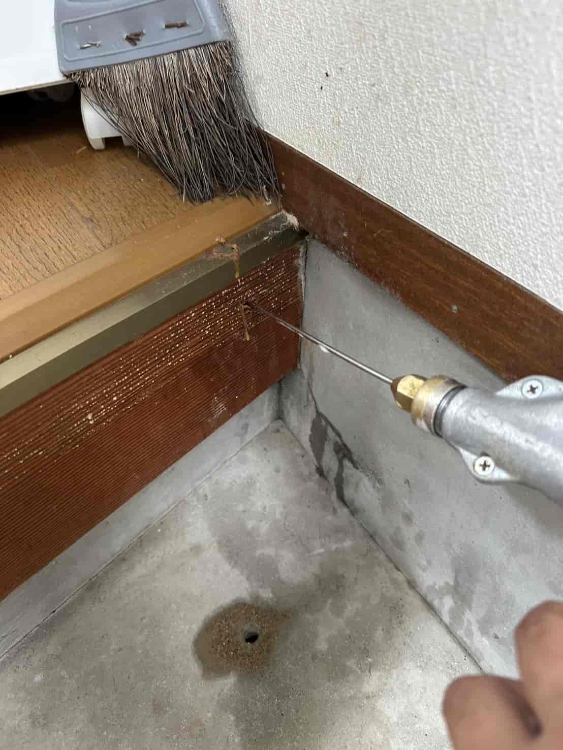 被害が確認された箇所の木部には、ドリルで小さな穴を開け、そこから専用の薬剤を加圧注入しました。木材の内部に潜むシロアリを確実に駆除するための工法で、被害箇所を中心に複数の処理を行いました。