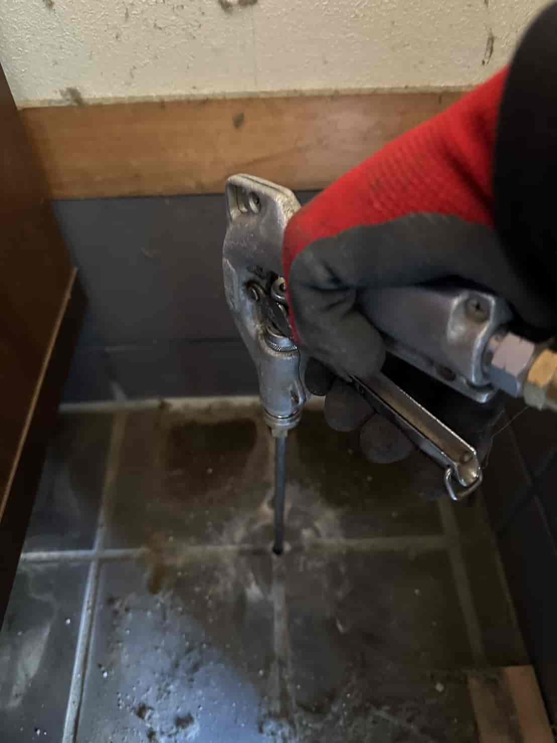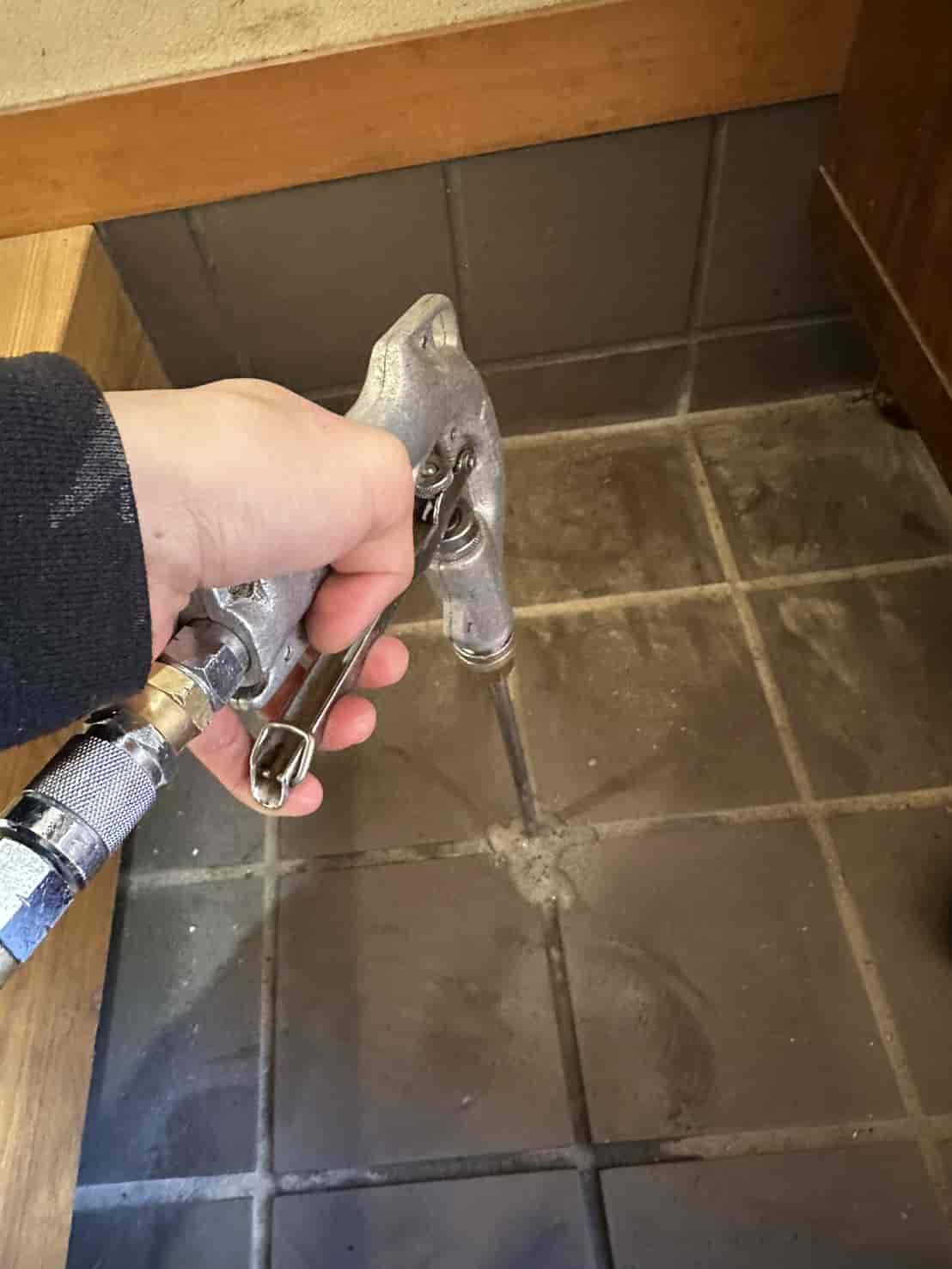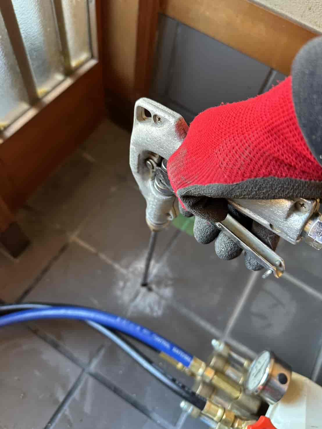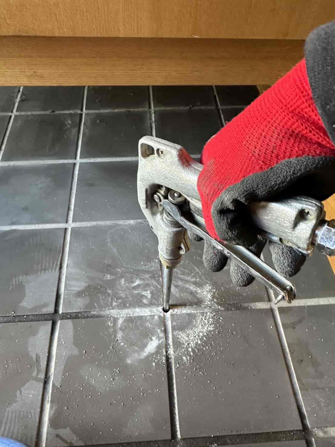 玄関部分は、床下が土ではなくコンクリートスラブ+タイル仕上げとなっていました。このような箇所は、床下からの散布処理ができないため、スラブタイル穿孔注入工法にて対応しています。具体的には、