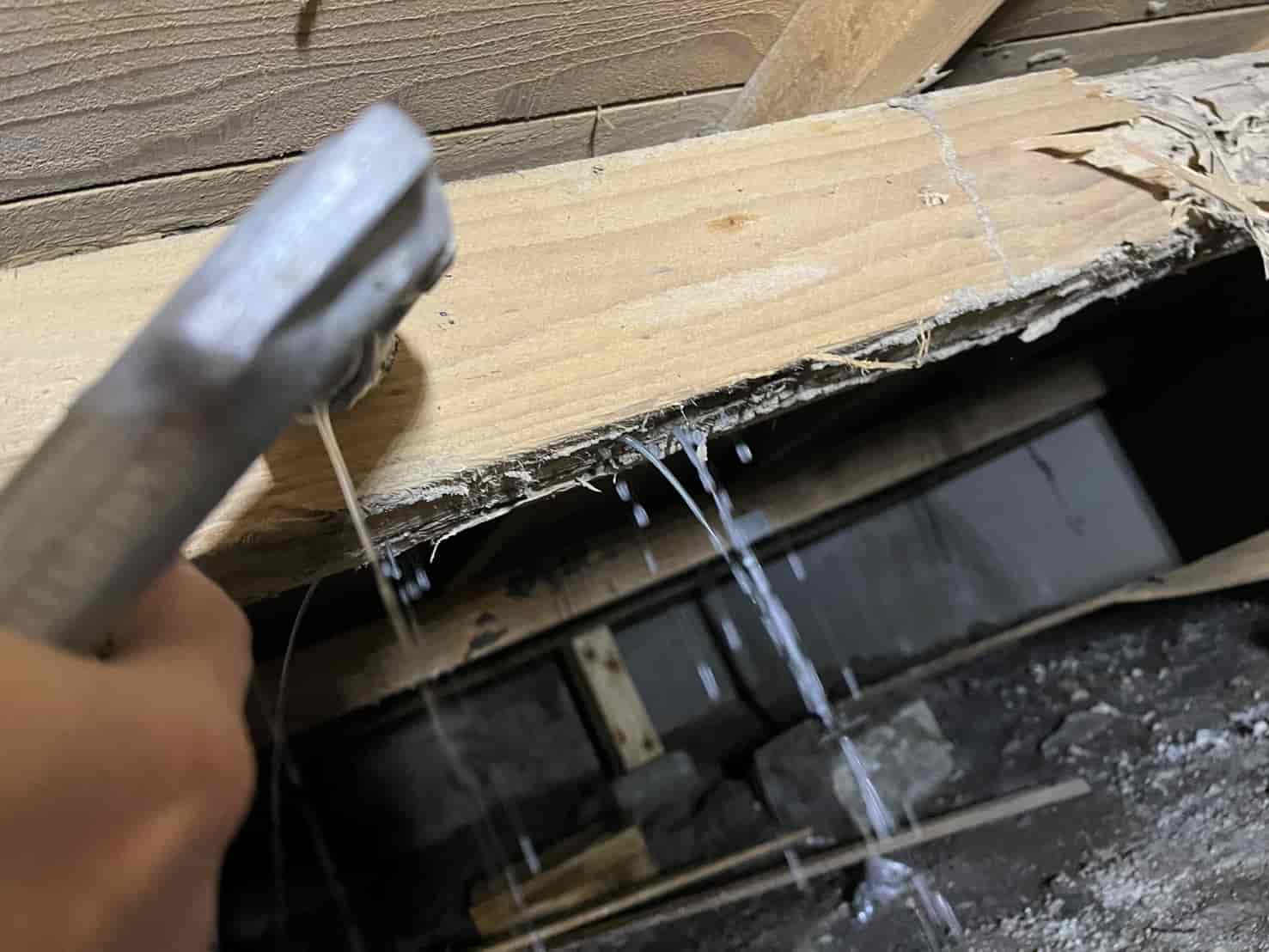 お宅に到着し、さっそく床下へ潜り調査を開始しました。 お客様が仰っていた通り、水漏れ箇所周辺の木材はシロアリに食い荒らされ、手で触れると簡単に崩れてしまうほど被害は深刻でした。しかし、問題はそれだけではありません。
