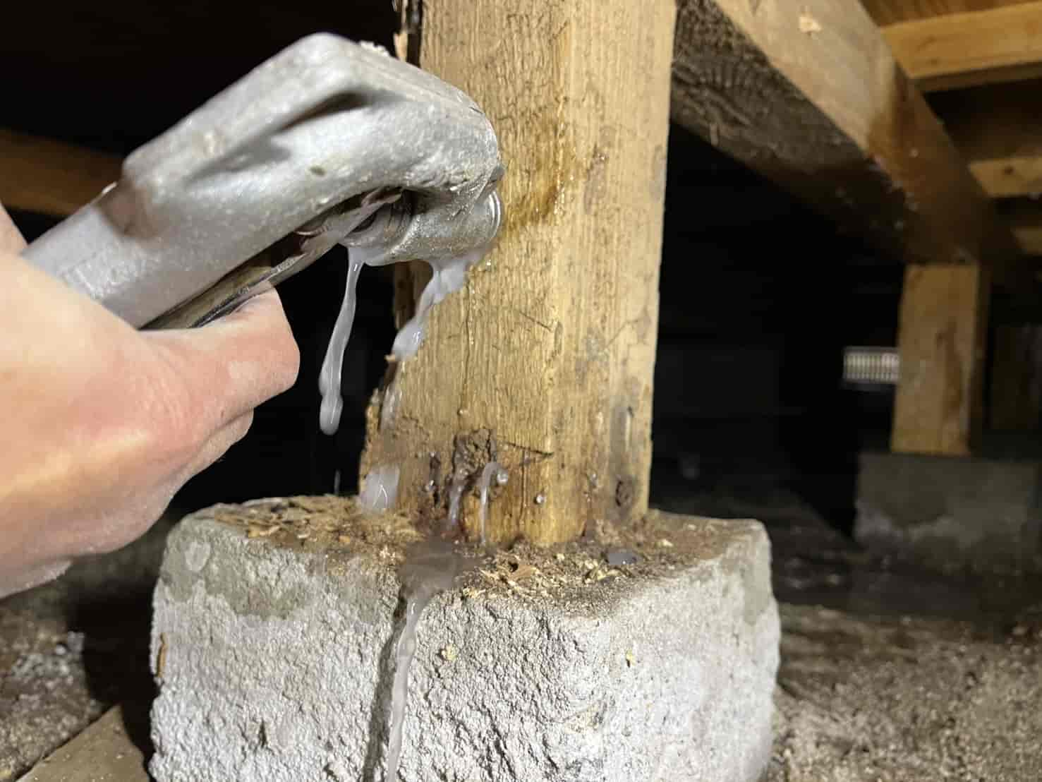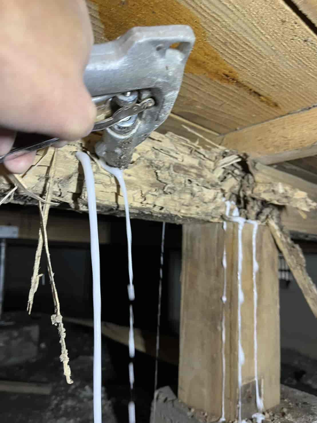すでにシロアリが侵入している木材の内部にドリルで小さな穴を開け、直接薬剤を注入します。表面に塗るだけでは届かない内部の巣や食害箇所を徹底的に叩きます。