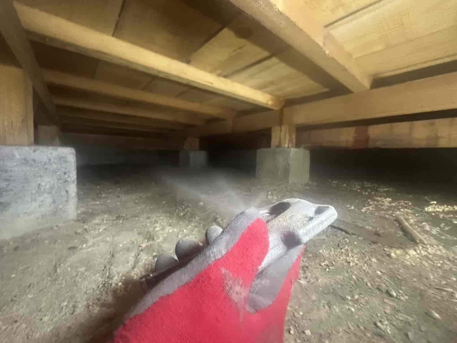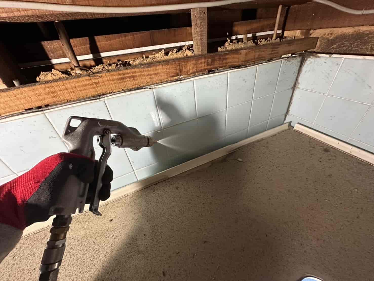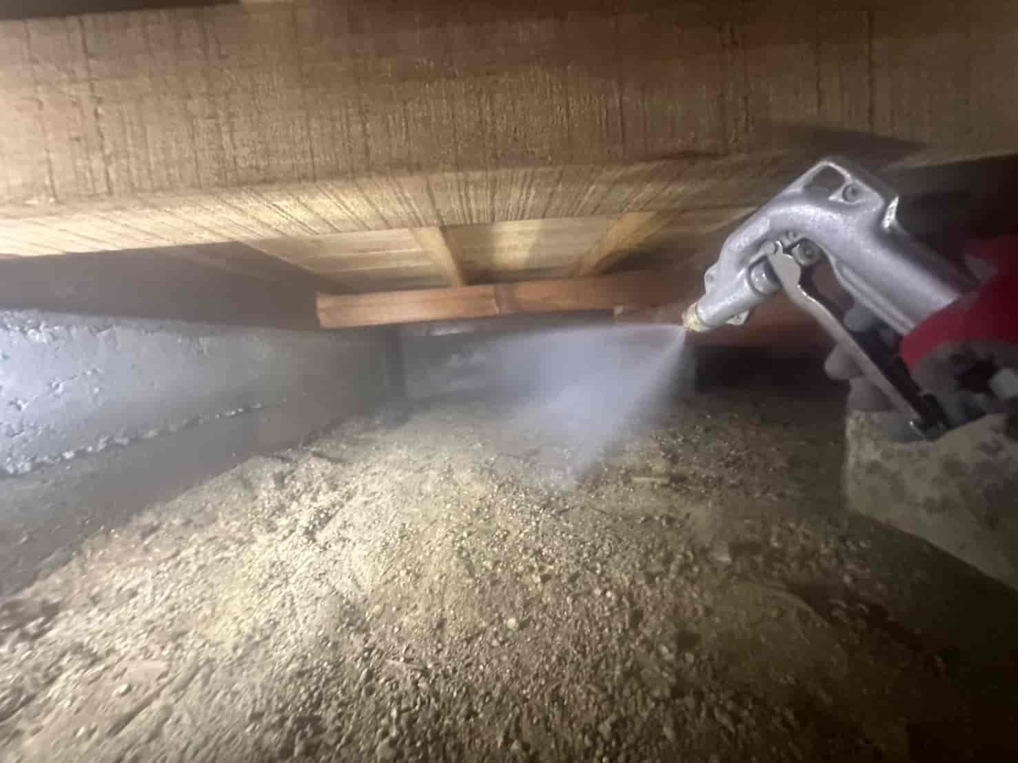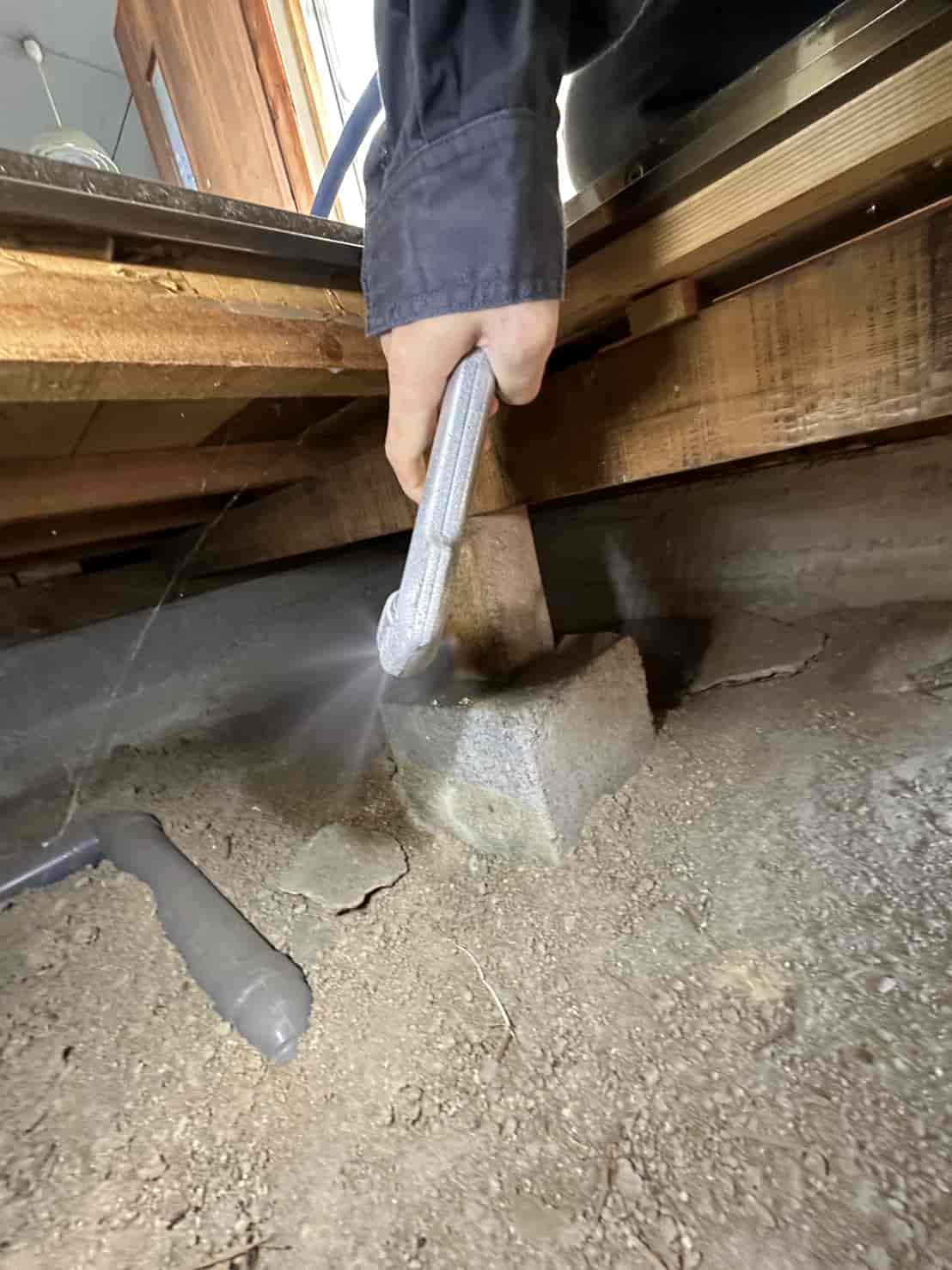 床下に進入し、土壌および木部に対して専用の防蟻薬剤を散布施工しました。