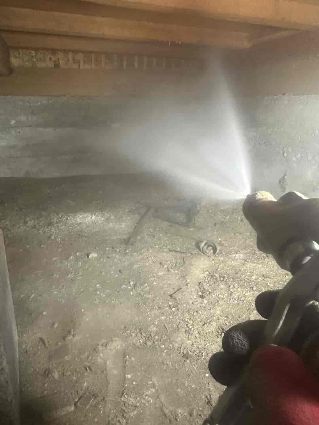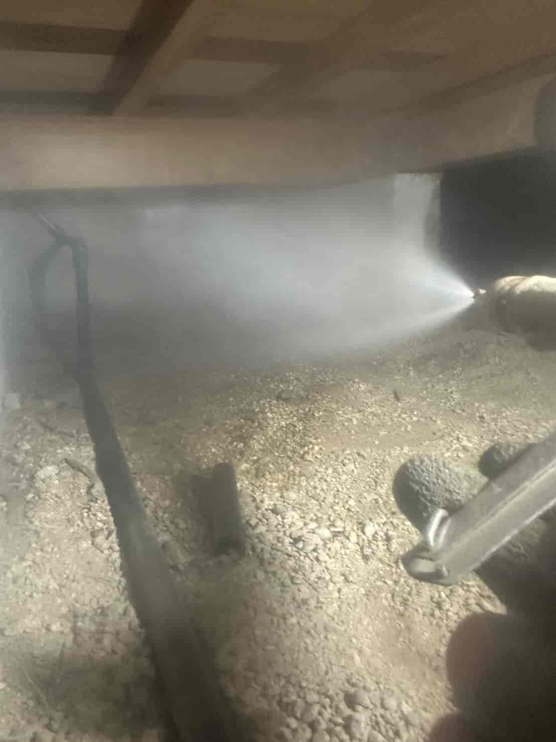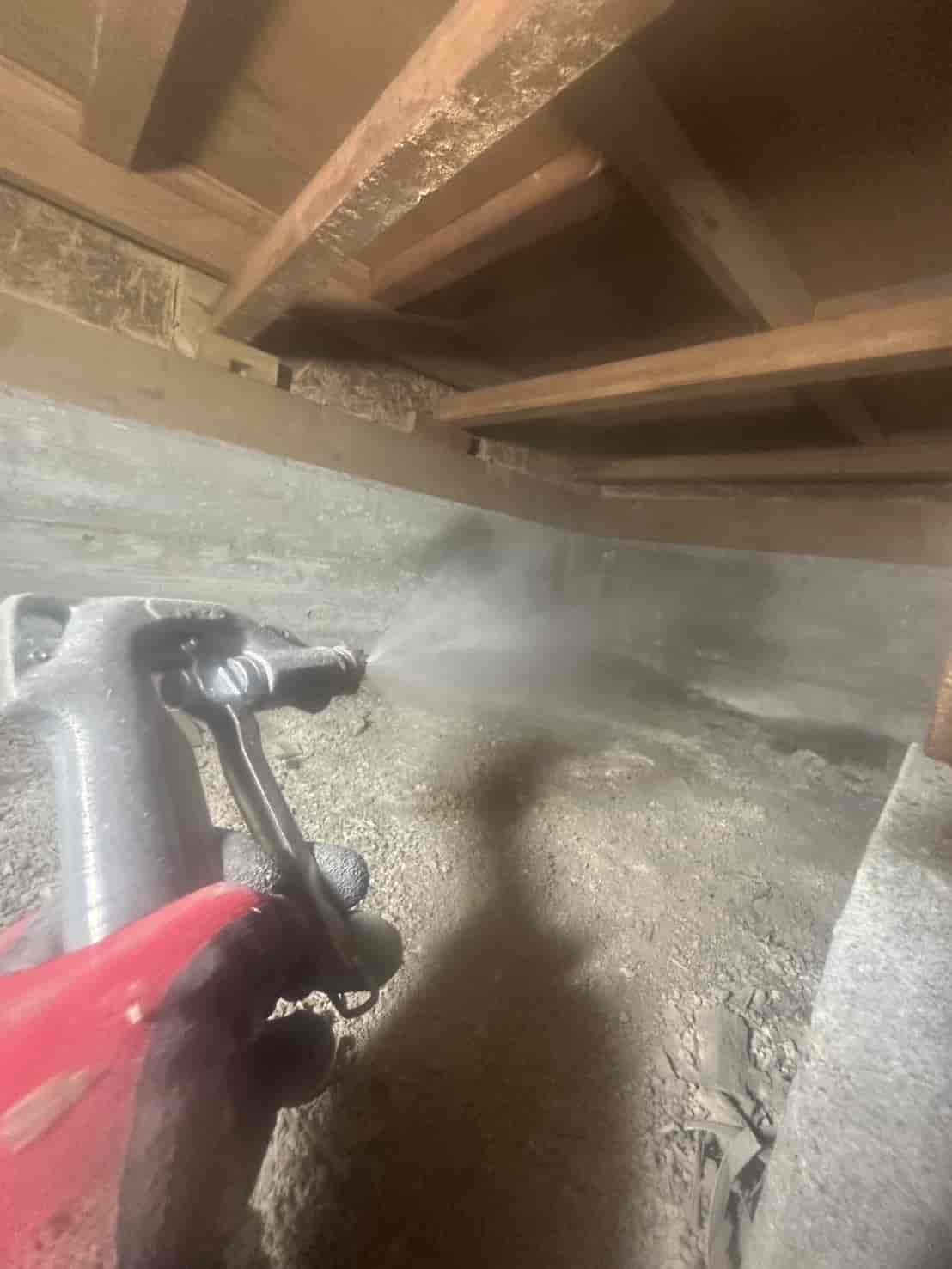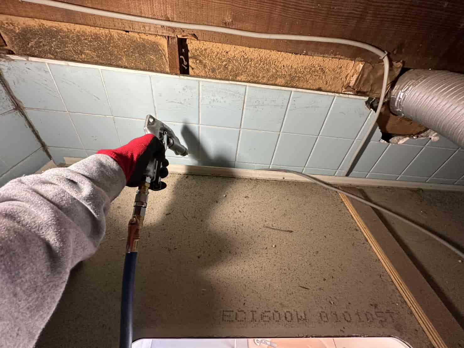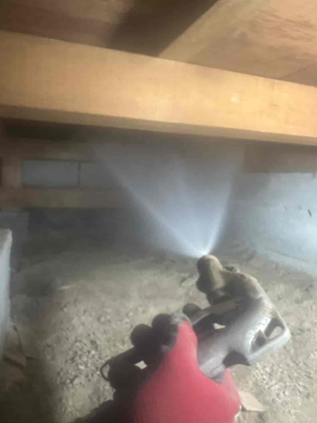 床下に進入し、土壌および木部に対して専用の防蟻薬剤を散布施工しました。