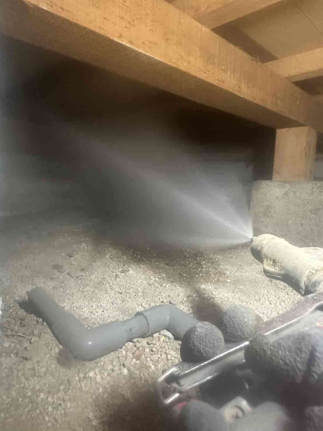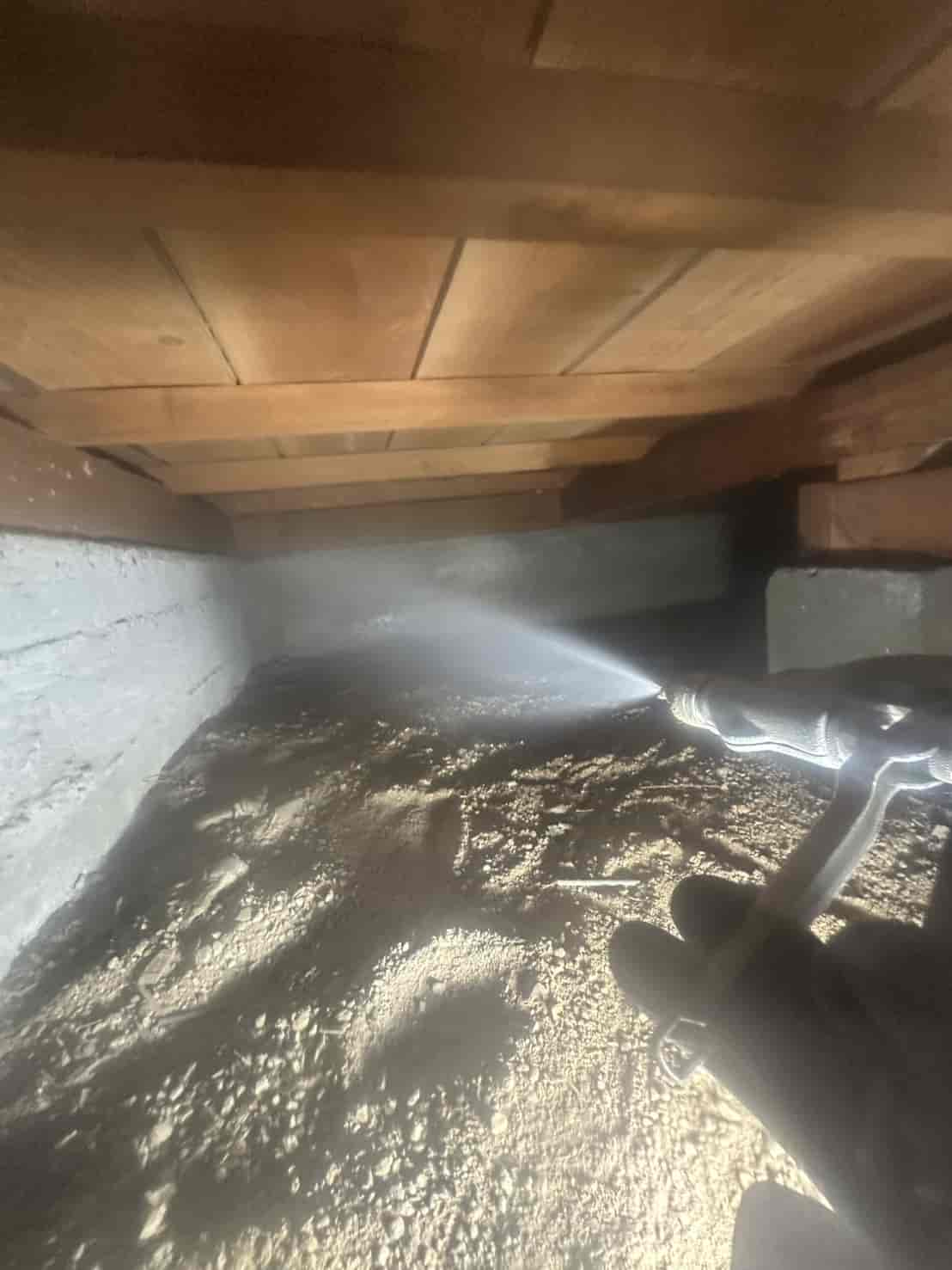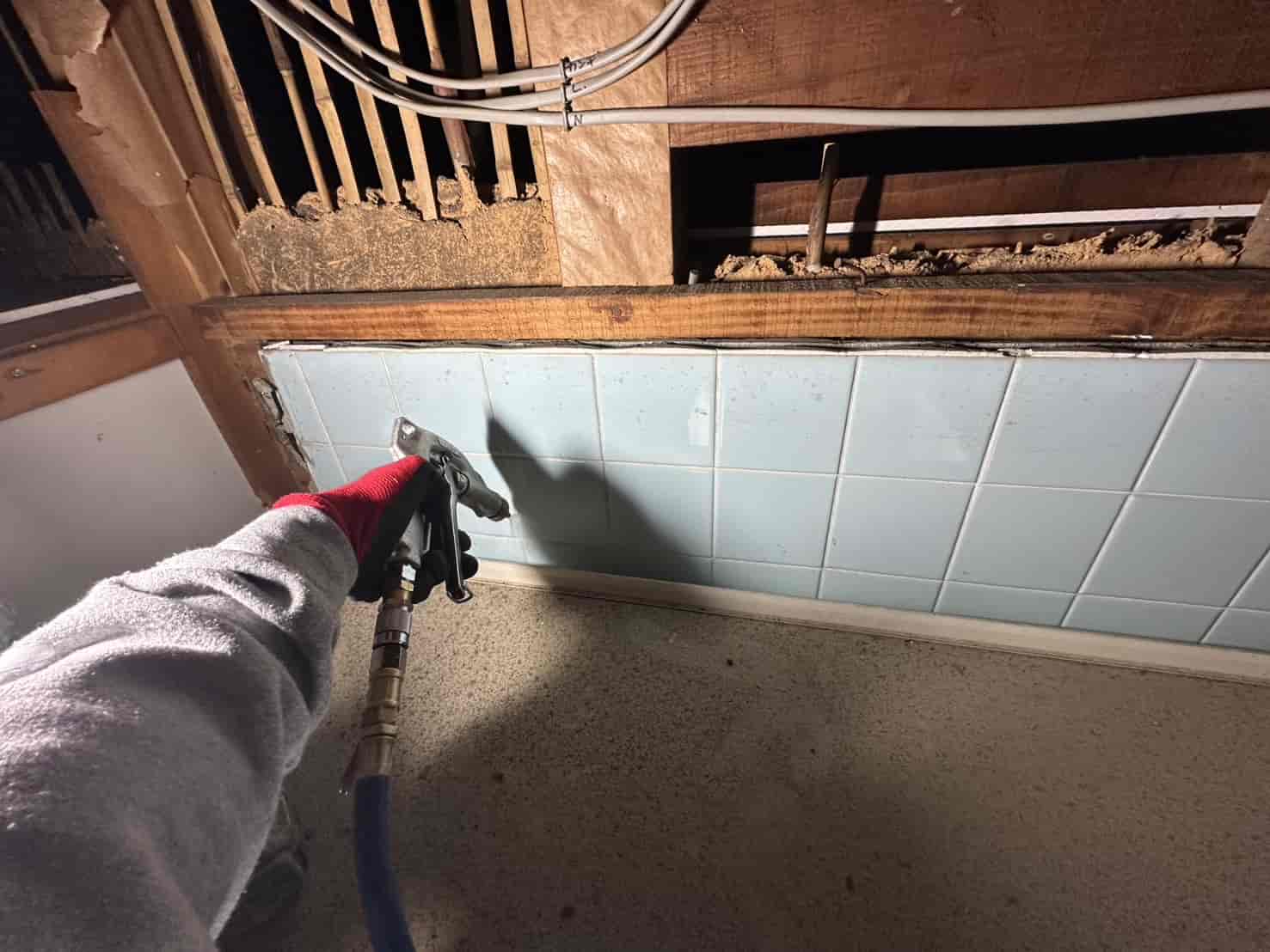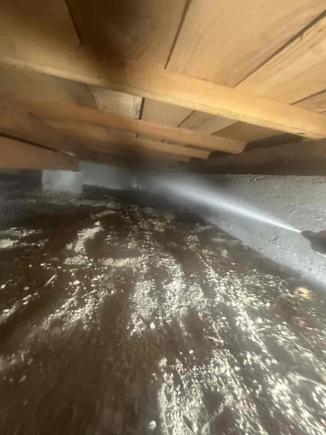 床下に進入し、土壌および木部に対して専用の防蟻薬剤を散布施工しました。