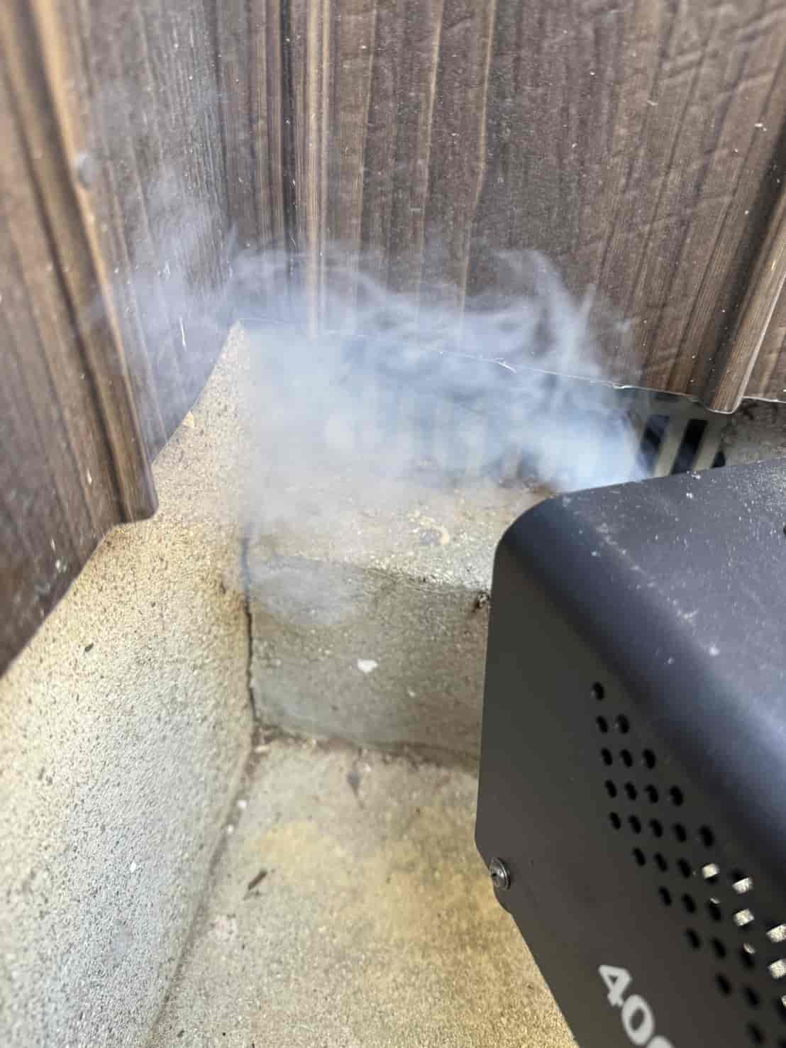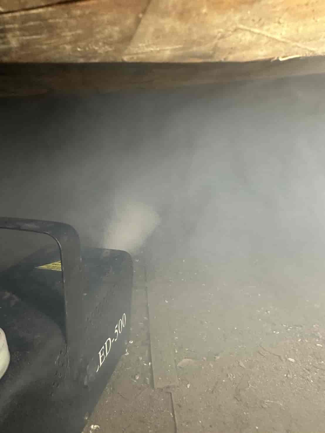 まず初めに、1階天井裏・床下・2階天井裏すべてに対して燻煙処理を実施しました。燻煙処理は、ねずみが嫌がる成分を煙として行き渡らせることで、現在建物内にいるねずみを追い出すための重要な工程です。