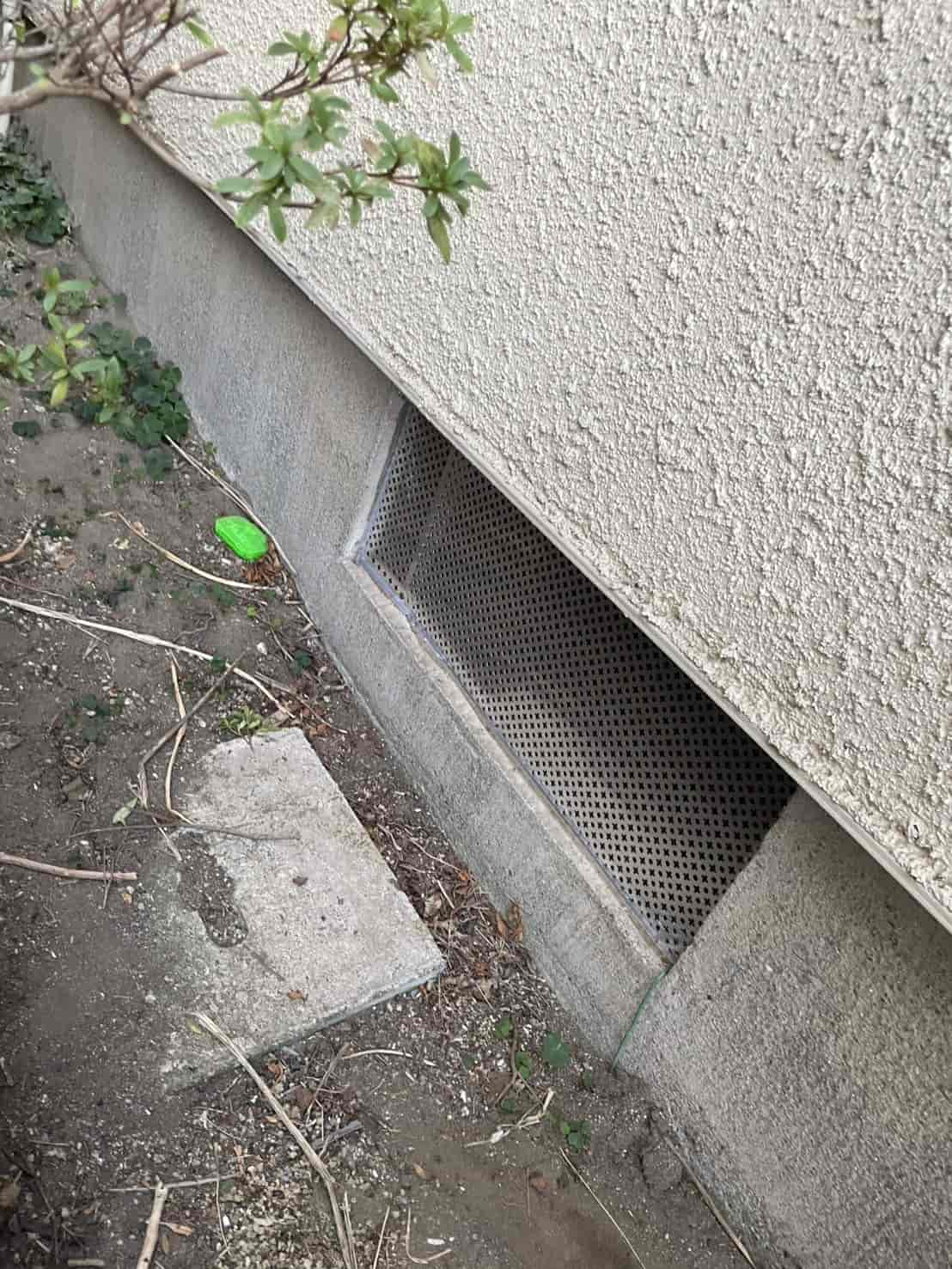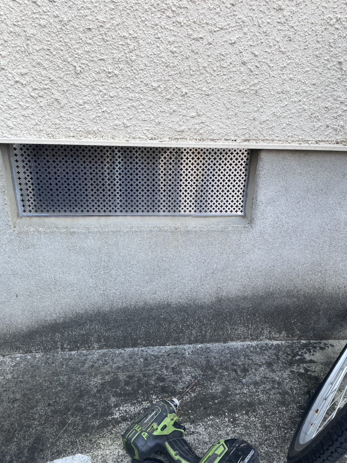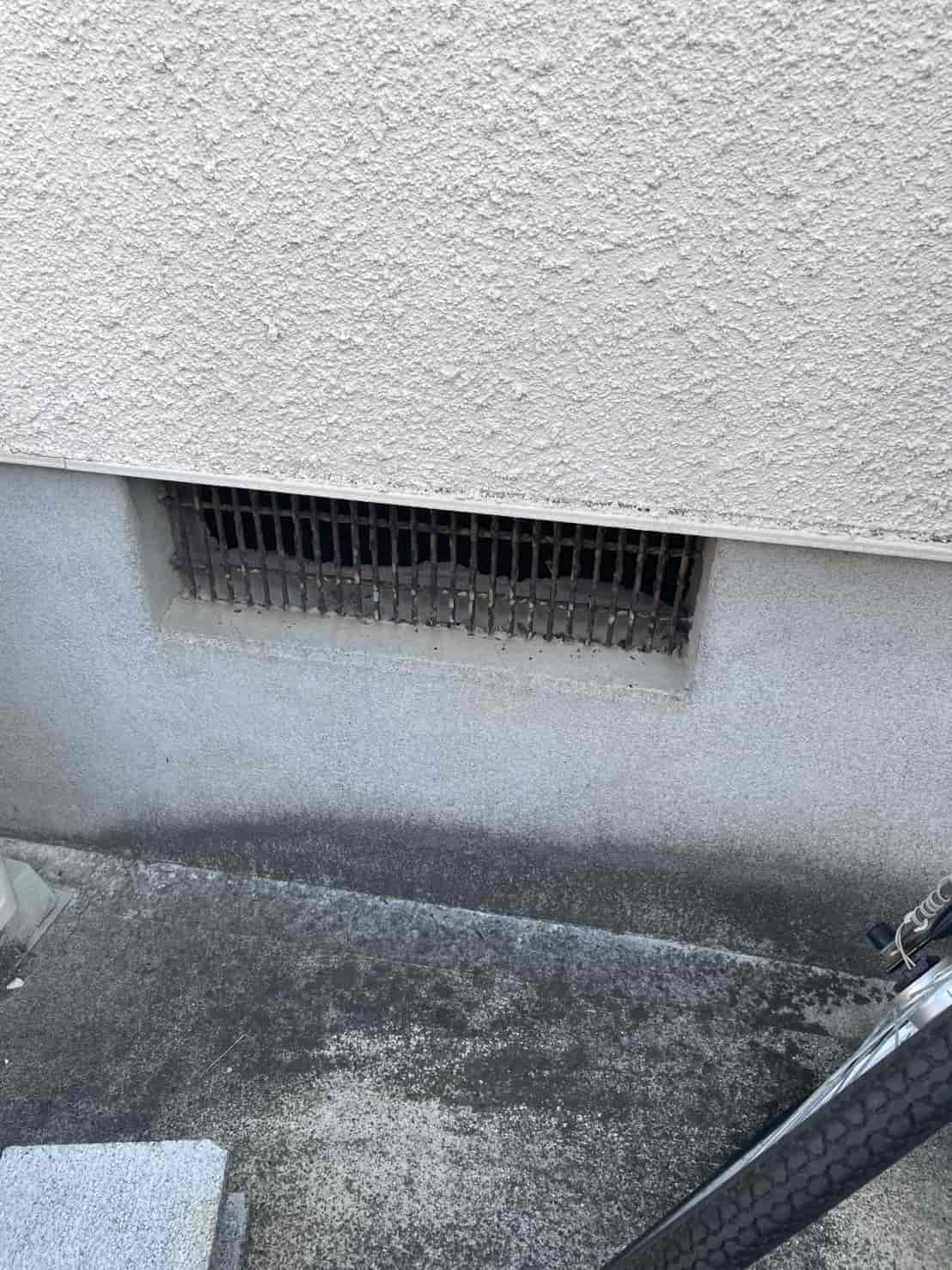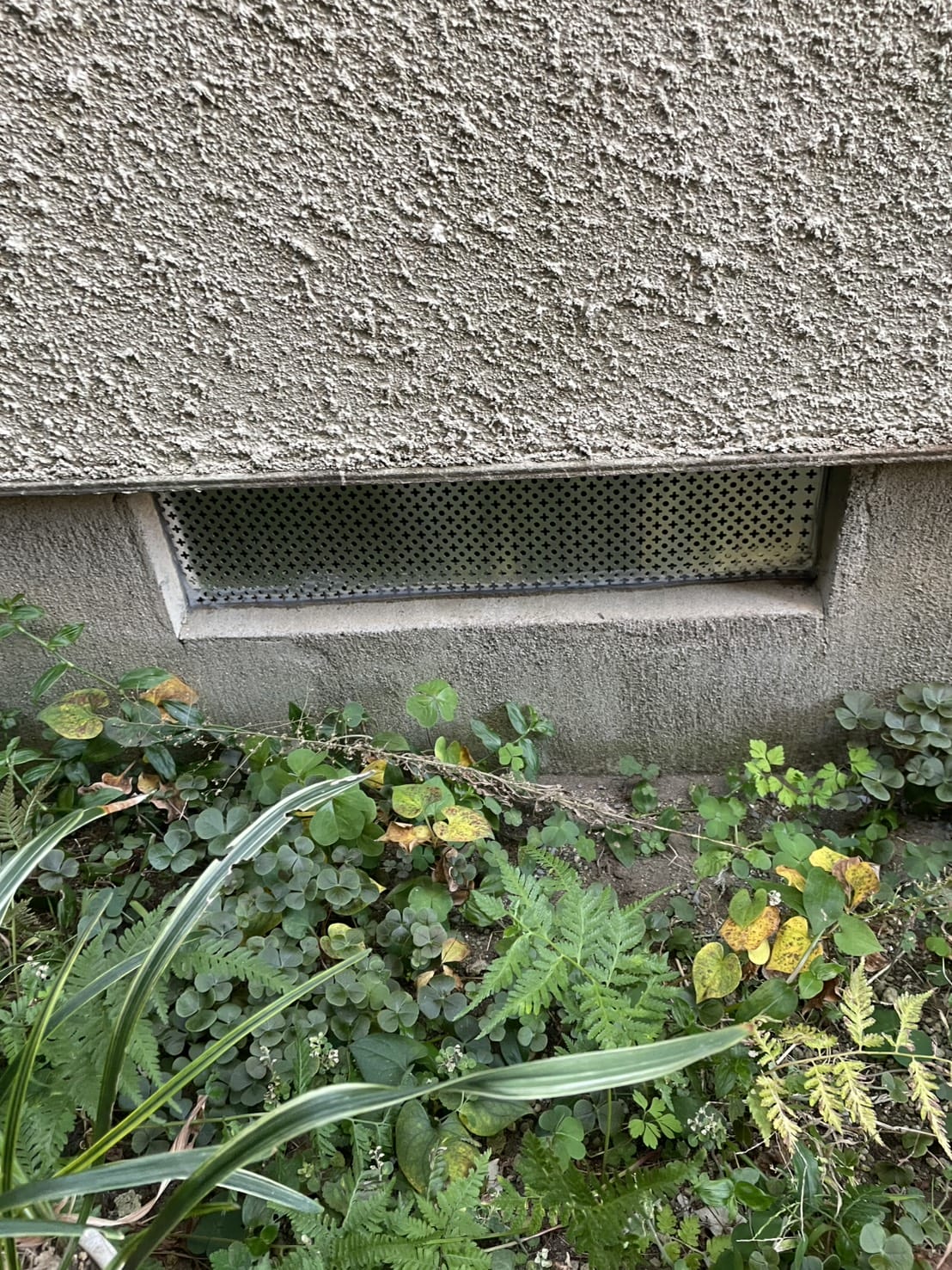 まず外周を確認したところ、基礎通気口まわりにネズミのフンを発見。通気口は床下へつながる重要な換気部分ですが、古くなると金網の隙間やゆるみが生じ、ネズミにとって絶好の侵入口になります。今回もまさにそのパターンでした。