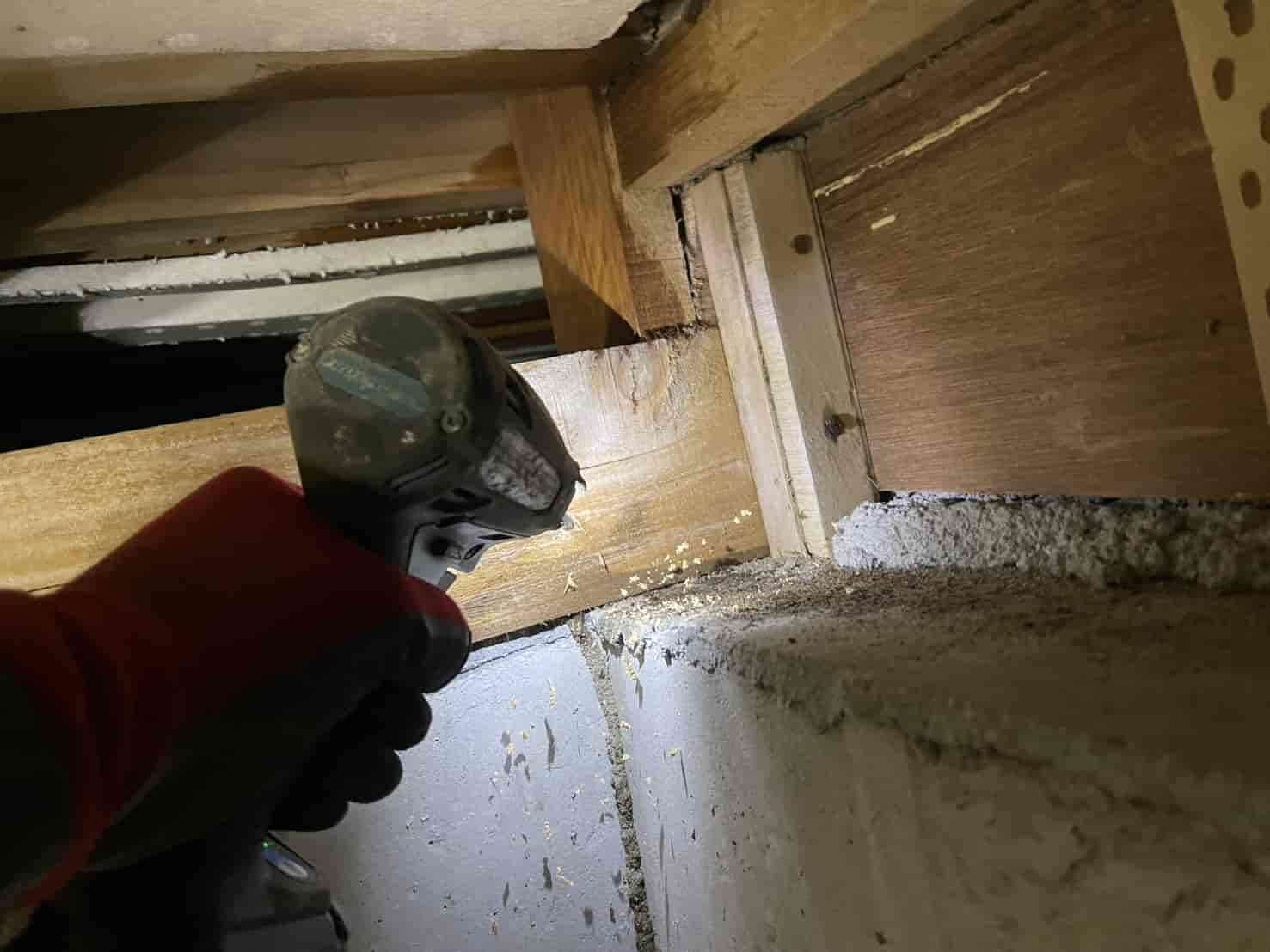 玄関内側・和室・広縁それぞれの木部に対し、小さな穿孔を開け、内部の木材線維まで確実に薬剤が浸透するよう注入処理を行いました。シロアリは木材内部を掘り進めるため、表面処理だけでは完全な駆除・予防が難しく、穿孔注入が最も効果的な方法のひとつです。特に和室は畳下の湿度が高まりやすく、シロアリが好む環境となるため、周辺の根太・大引きにも徹底的に注入を施しました。
