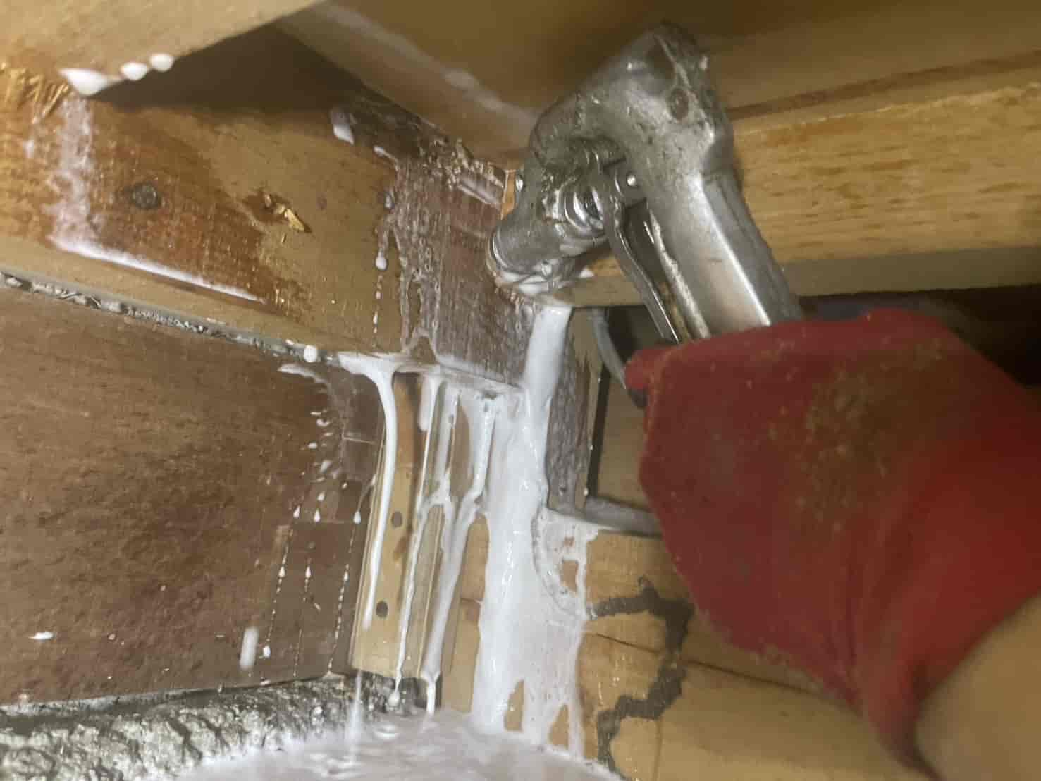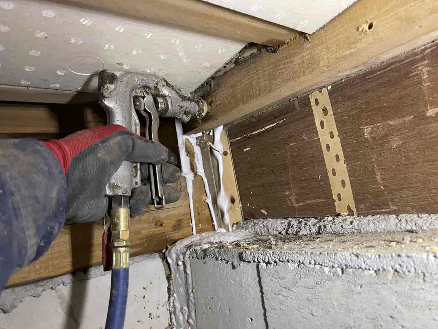 こうした部位はシロアリが侵入経路として利用するケースが多いため、内部に向かう蟻道形成と合わせて、玄関部を重点的に処置する必要がありました。点検結果を踏まえ、以下の流れで本格的な駆除施工を実施しました。