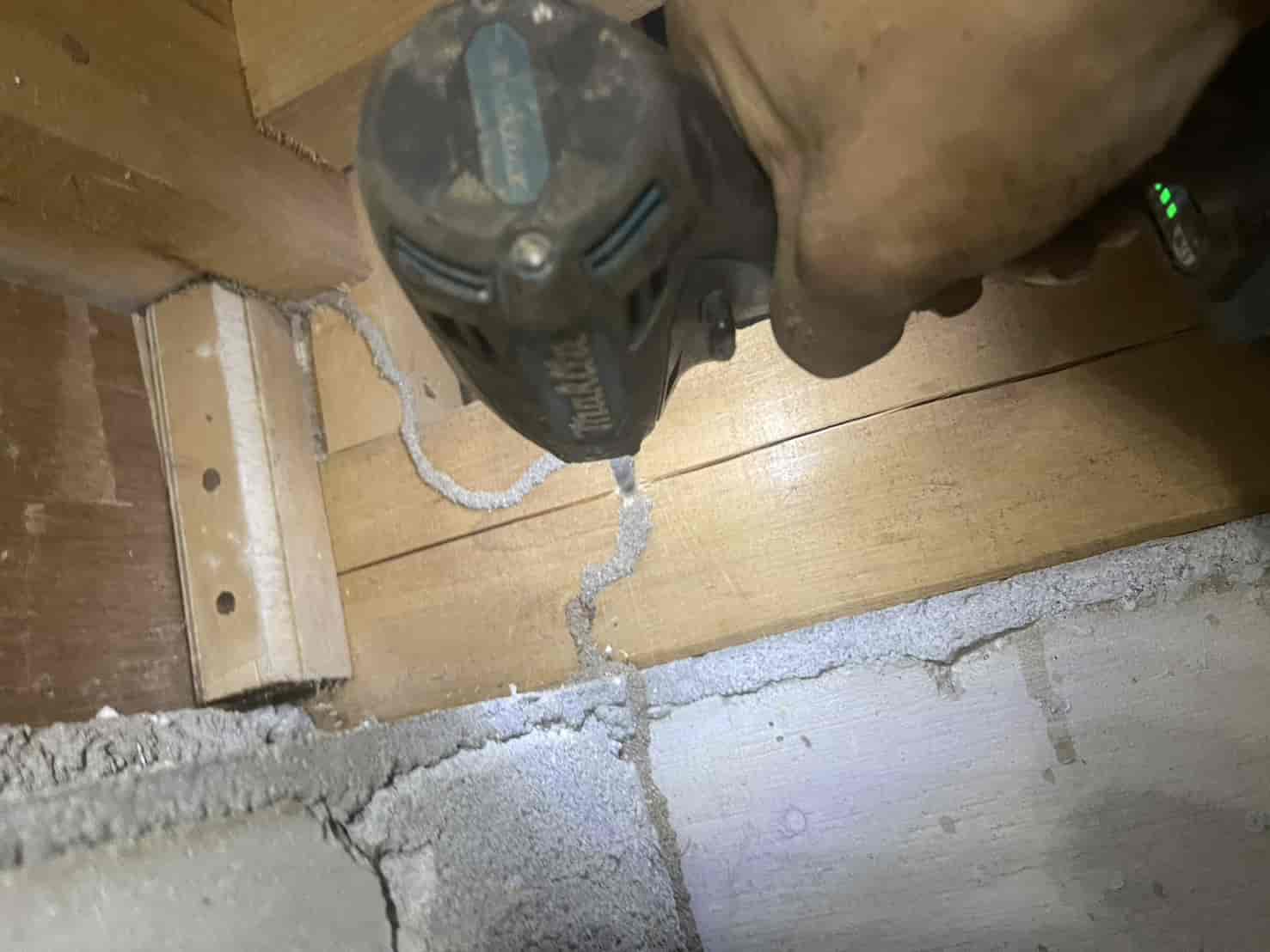 玄関部は特にリスクが高いと判断し、コンクリート立ち上がりに専用ドリルで小さな穴を開け、内部に薬剤を圧入しました。コンクリートは一見すると硬く防御力があるように見えますが、実際にはシロアリは微細な隙間から侵入してくるため、内部に薬剤を浸透させて防御層を形成することが極めて重要です。