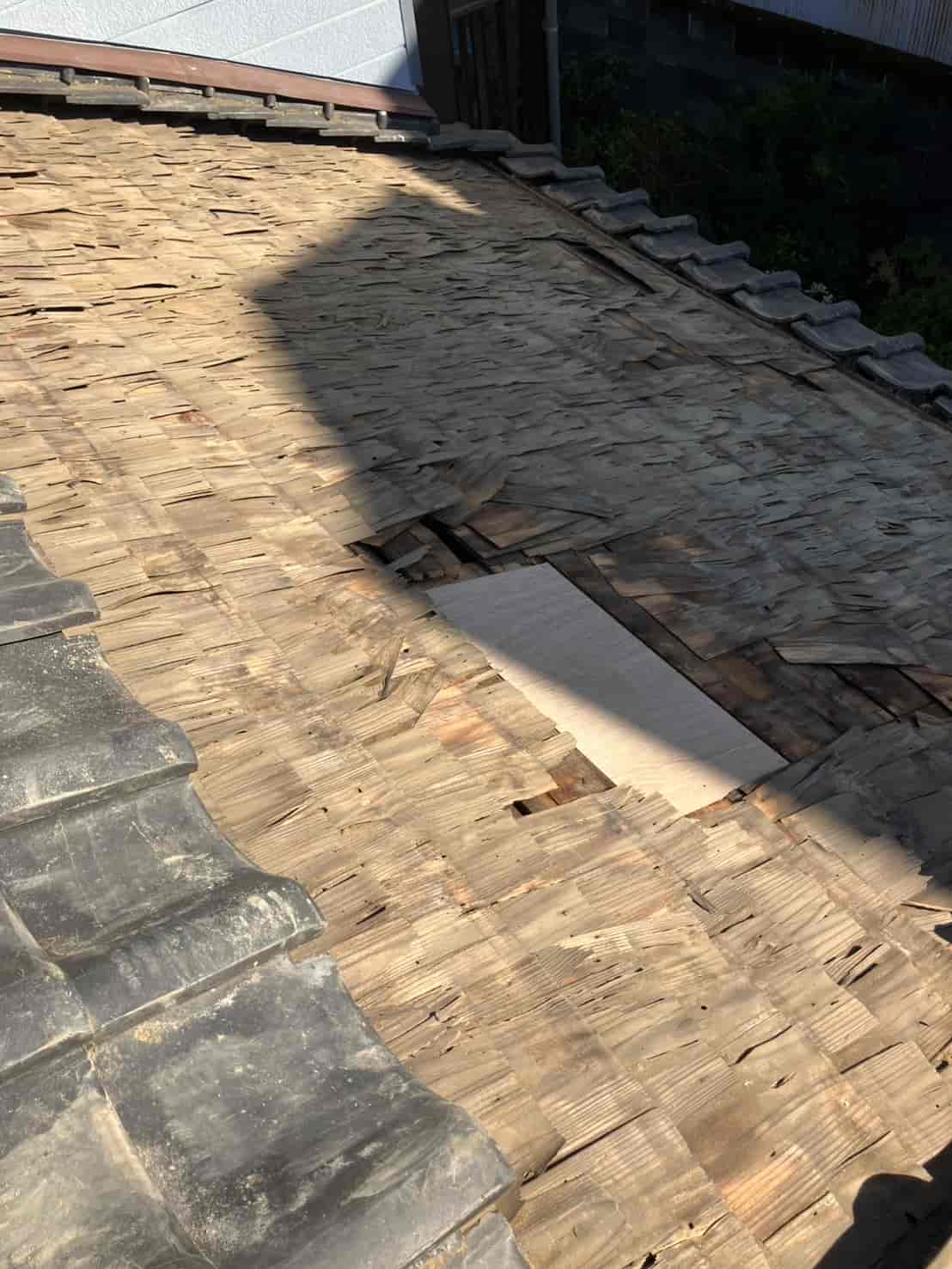 屋根の上に上がって調査したところ、割れた瓦の下にある防水シート(ルーフィング)が劣化し、雨水を通してしまっている状態でした。