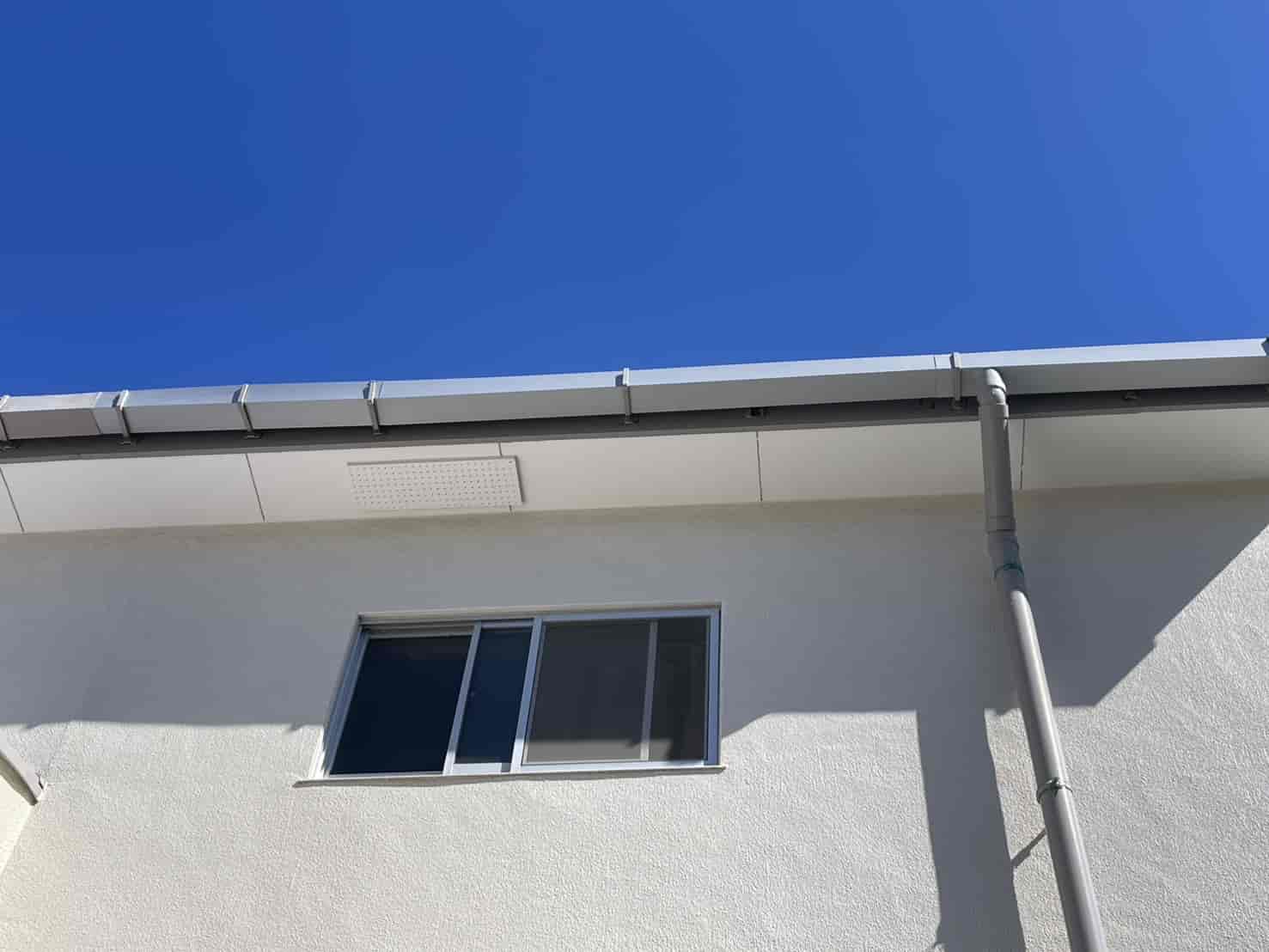 【対応】強風と大雨の影響で軒樋が変形・脱落しているとのご相談を受け、現地調査を実施。破損部分を撤去し、劣化した金具を新品へ交換したうえで、既製品では対応できない形状部分を板金加工で補修しました。雨水の流れがスムーズになるよう勾配調整と補強金具の追加を行い、接合部にはシーリング処理を施工。散水テストで排水の正常化を確認し、外壁への雨水被害を防止しました。