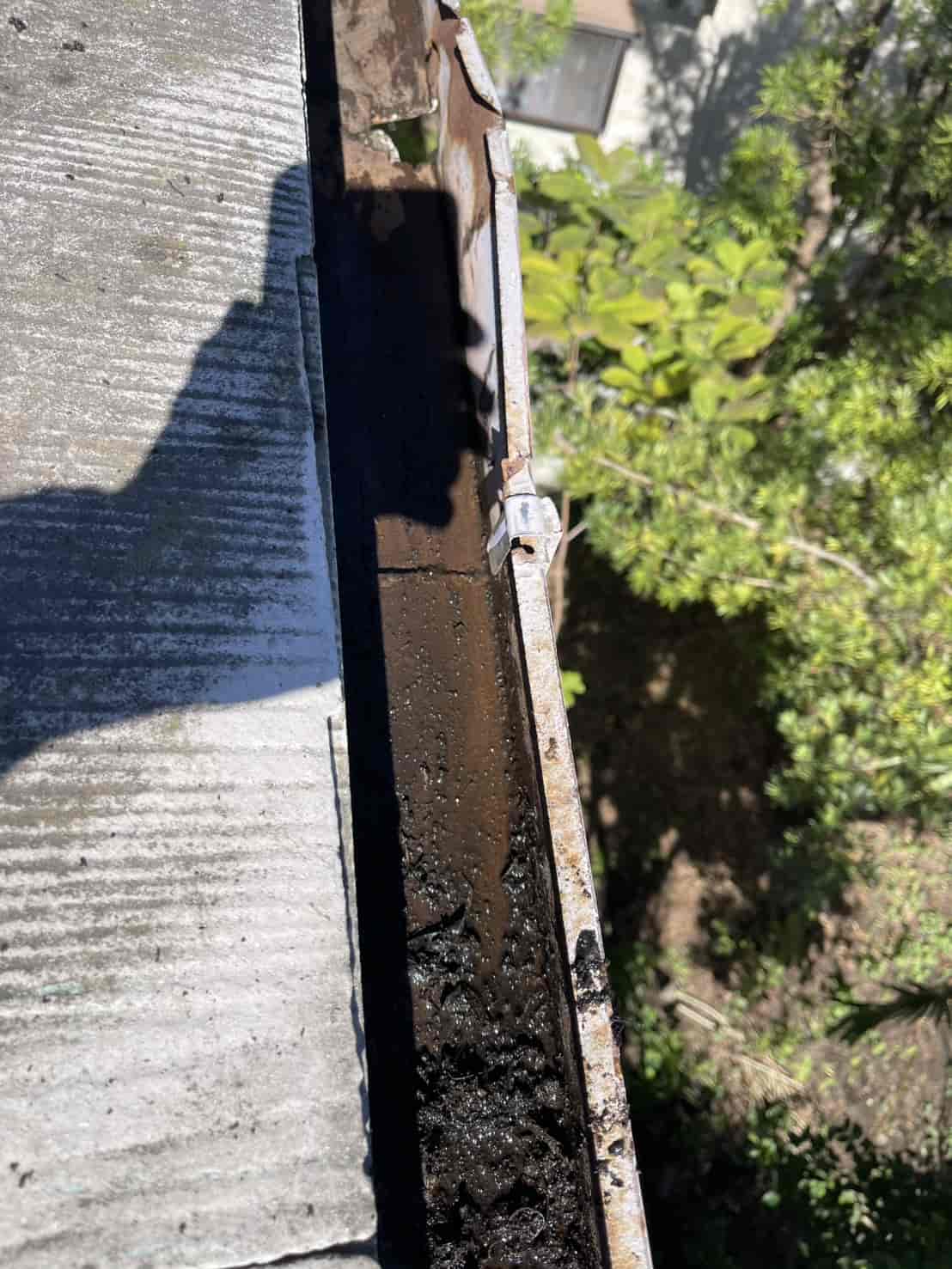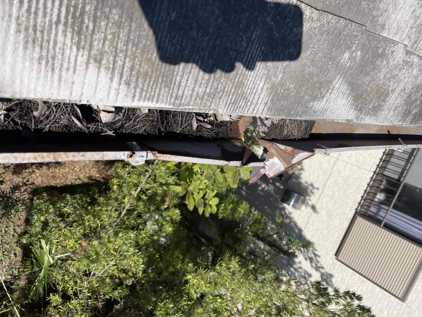 現地を確認したところ、屋根の端部分に設置されている軒樋(のきどい)が強風によって変形し、支持金具も外れている状態でした。