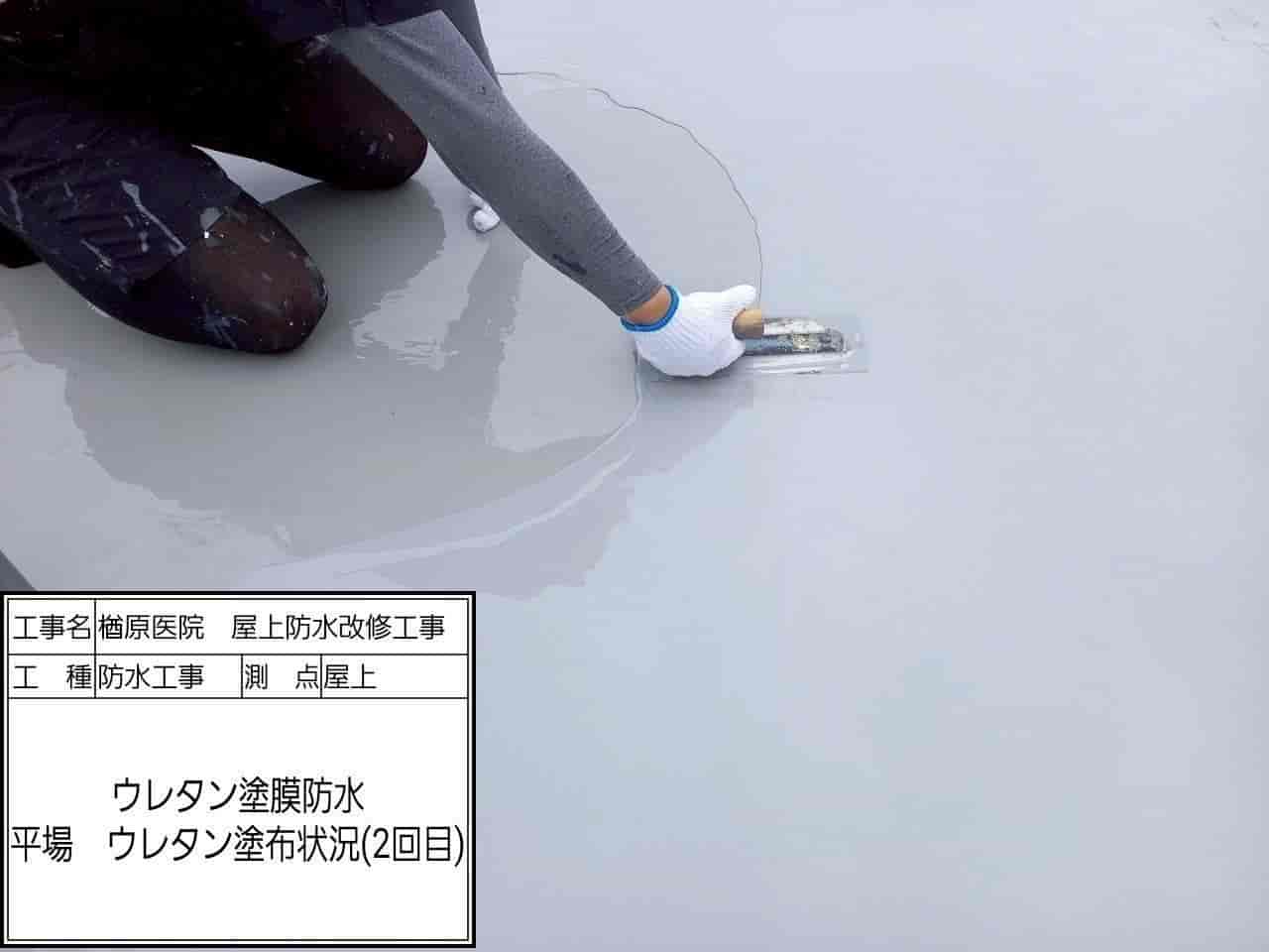 通気緩衝シートの上から、ウレタン防水材を2回に分けて塗布します。
