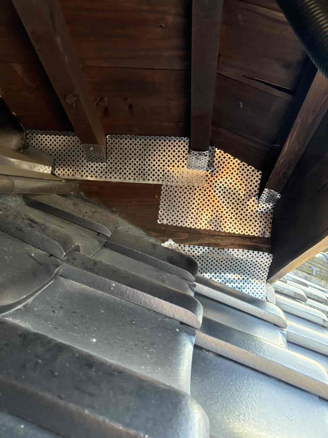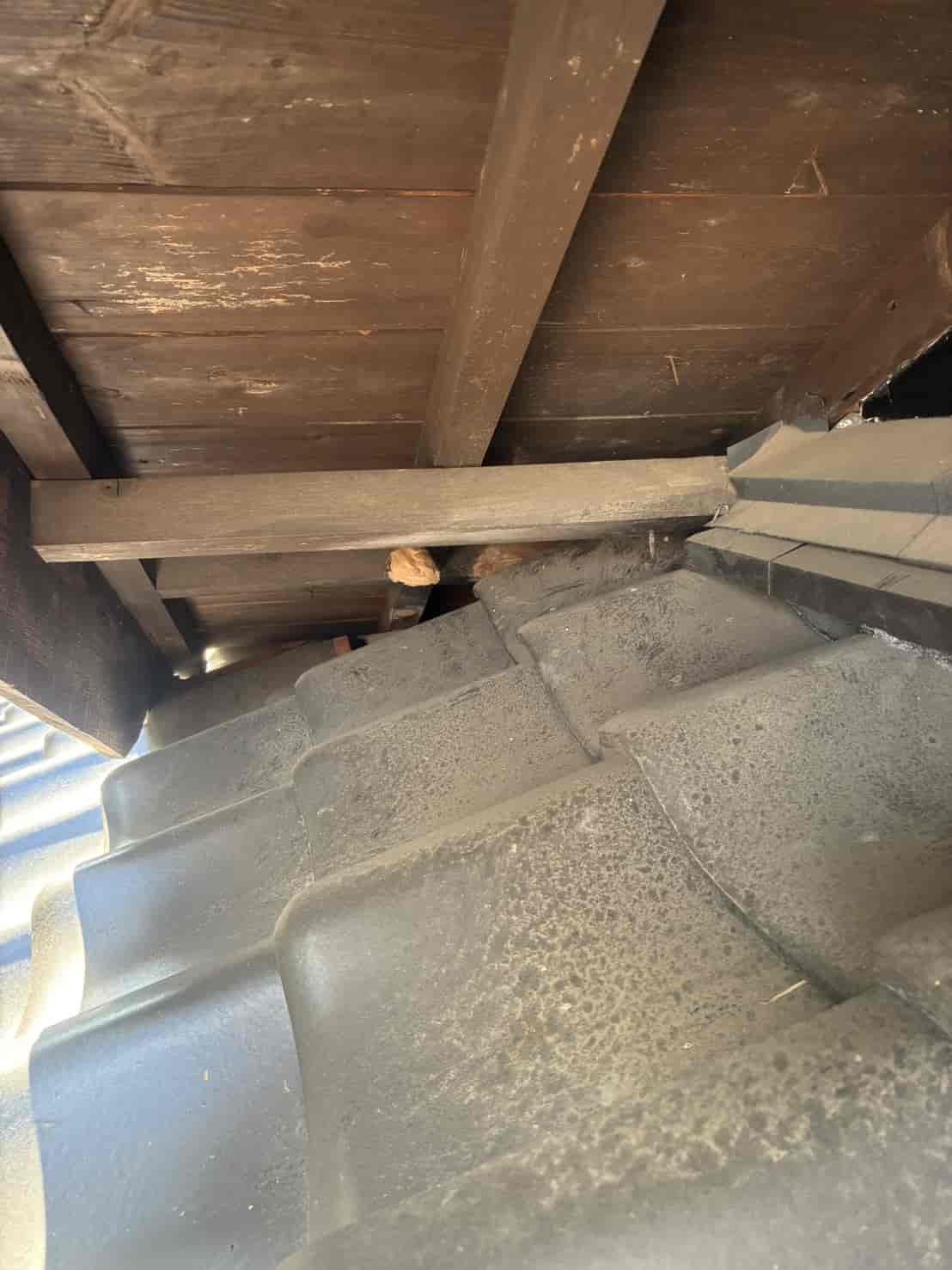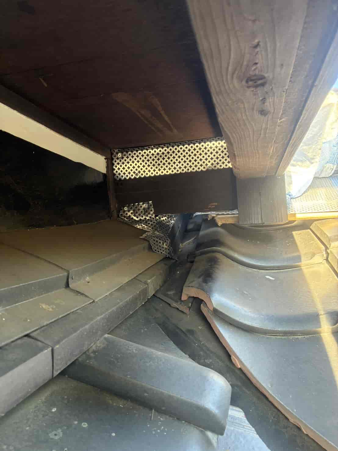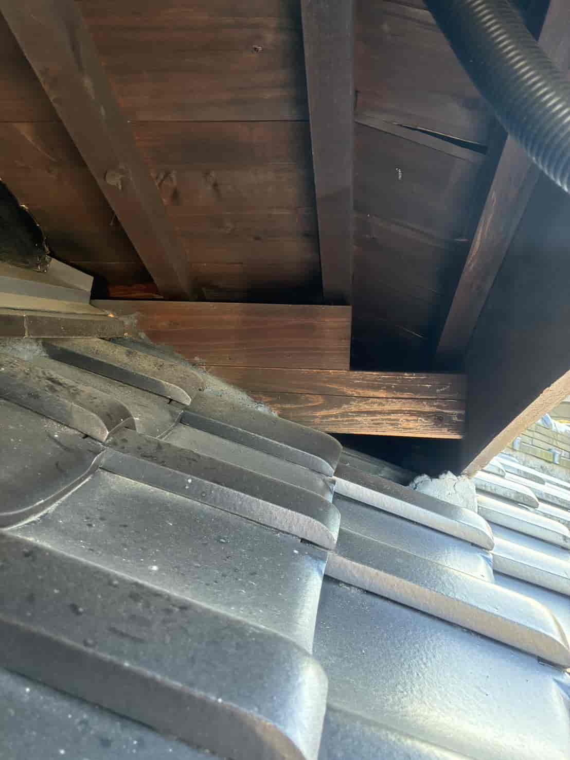 今回の現場でも、瓦と木部の取り合い部分にわずかな隙間があり、そこから屋根裏へ侵入している状態でした。