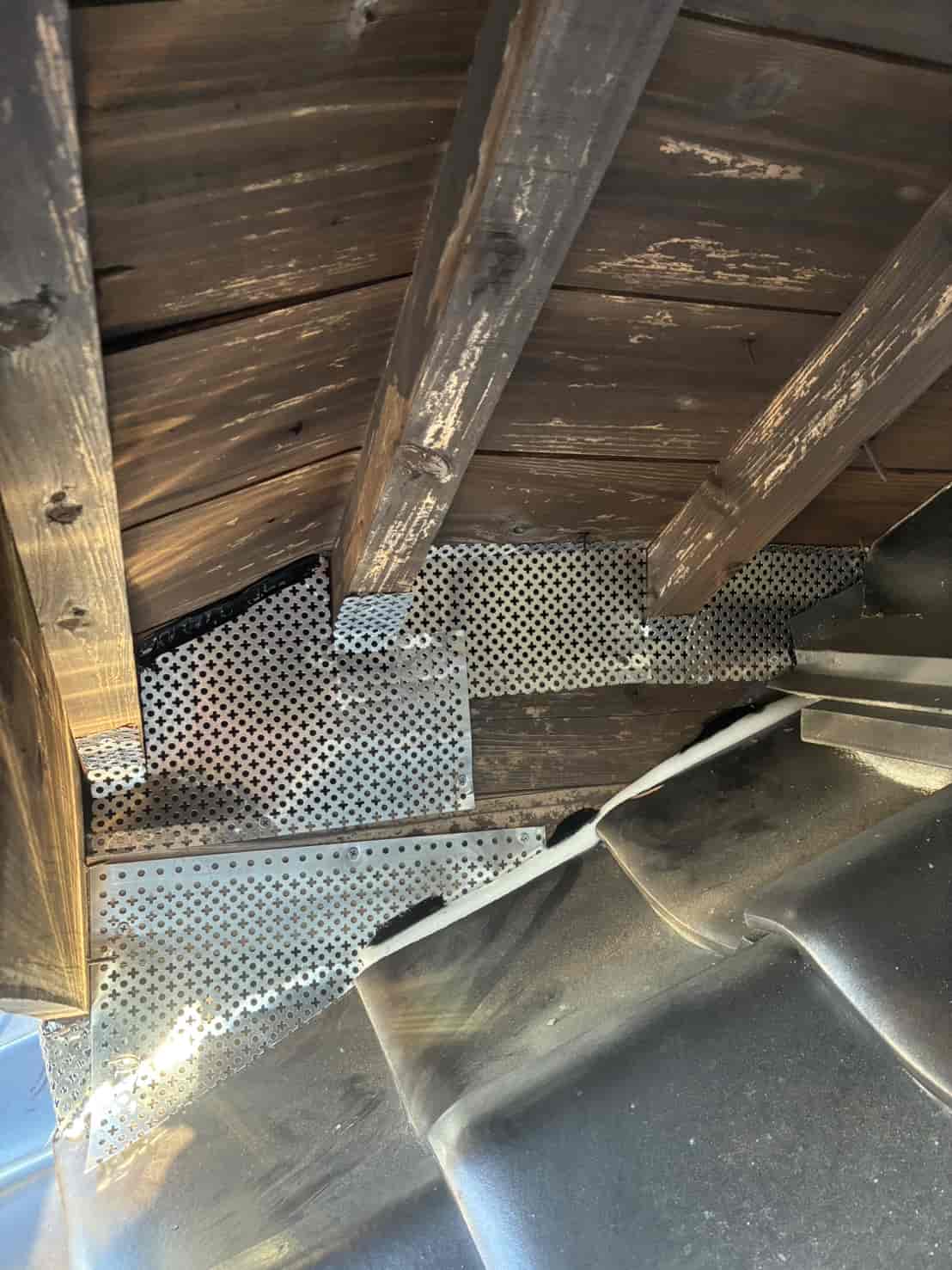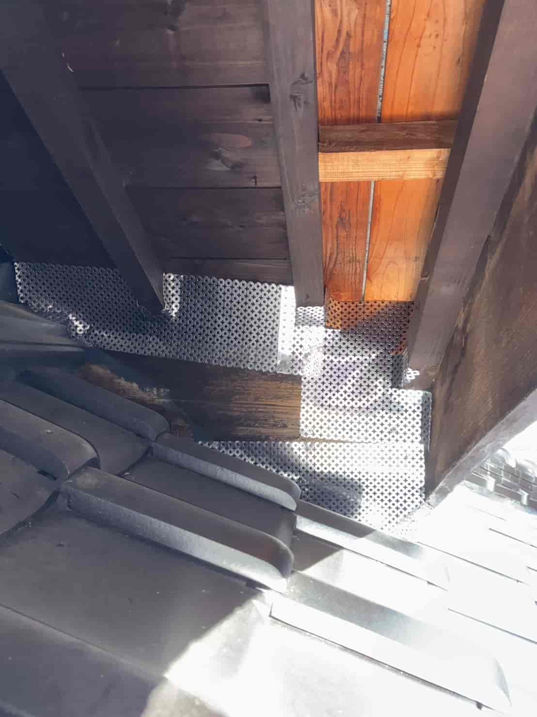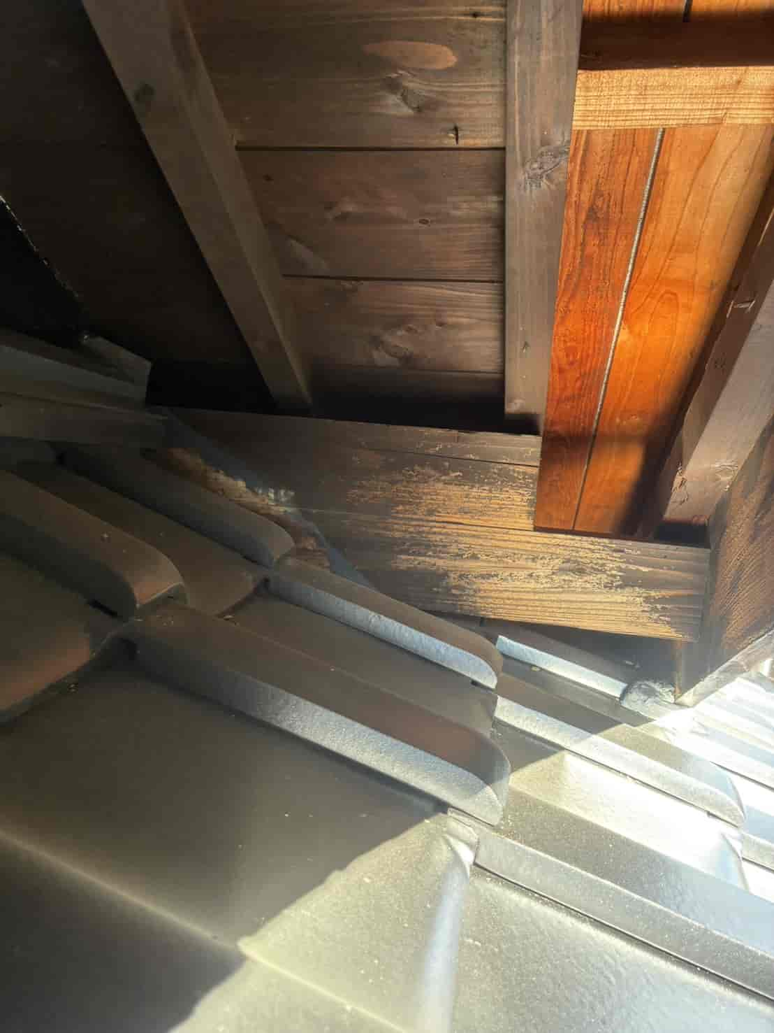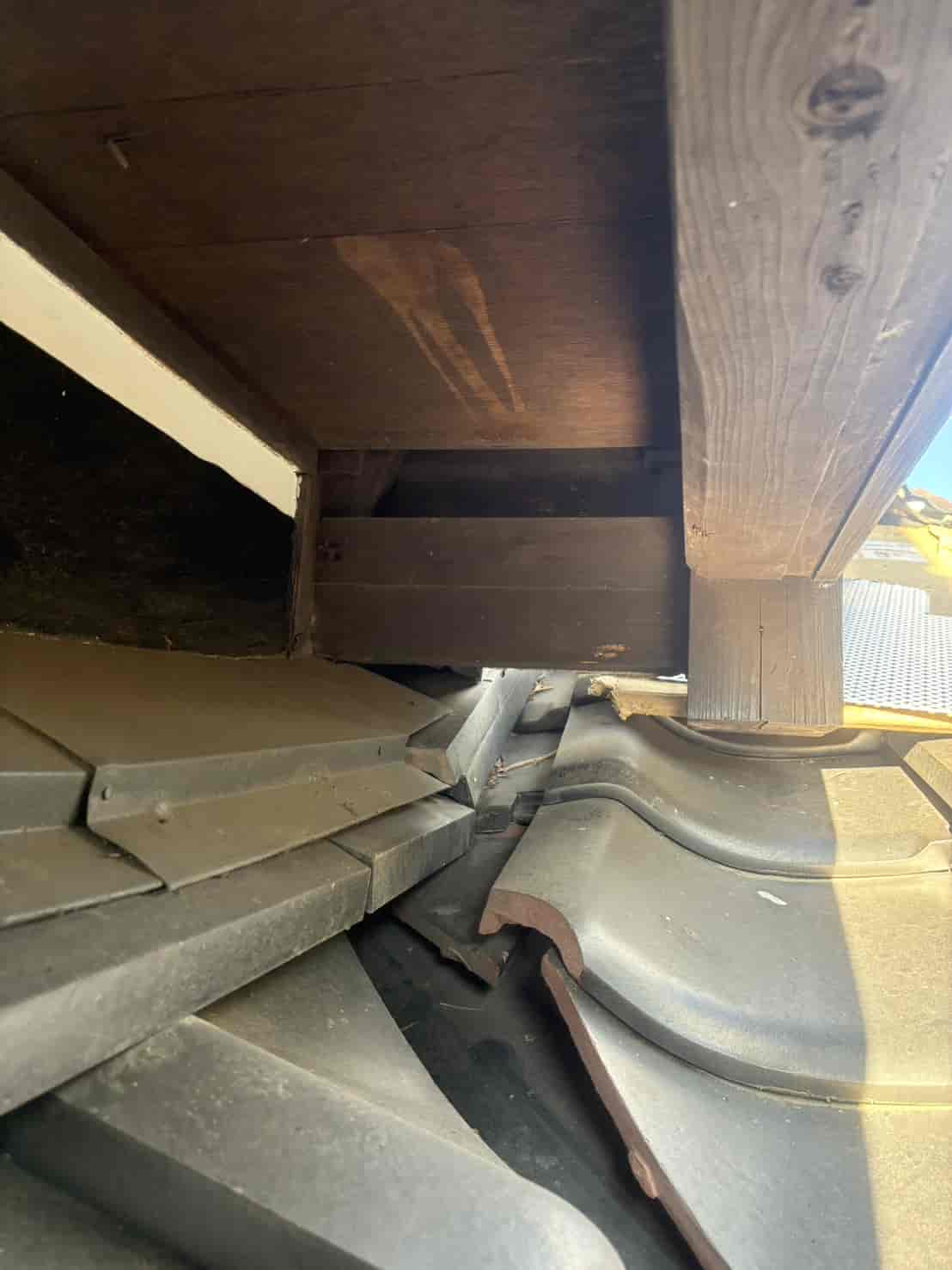 今回の現場でも、瓦と木部の取り合い部分にわずかな隙間があり、そこから屋根裏へ侵入している状態でした。