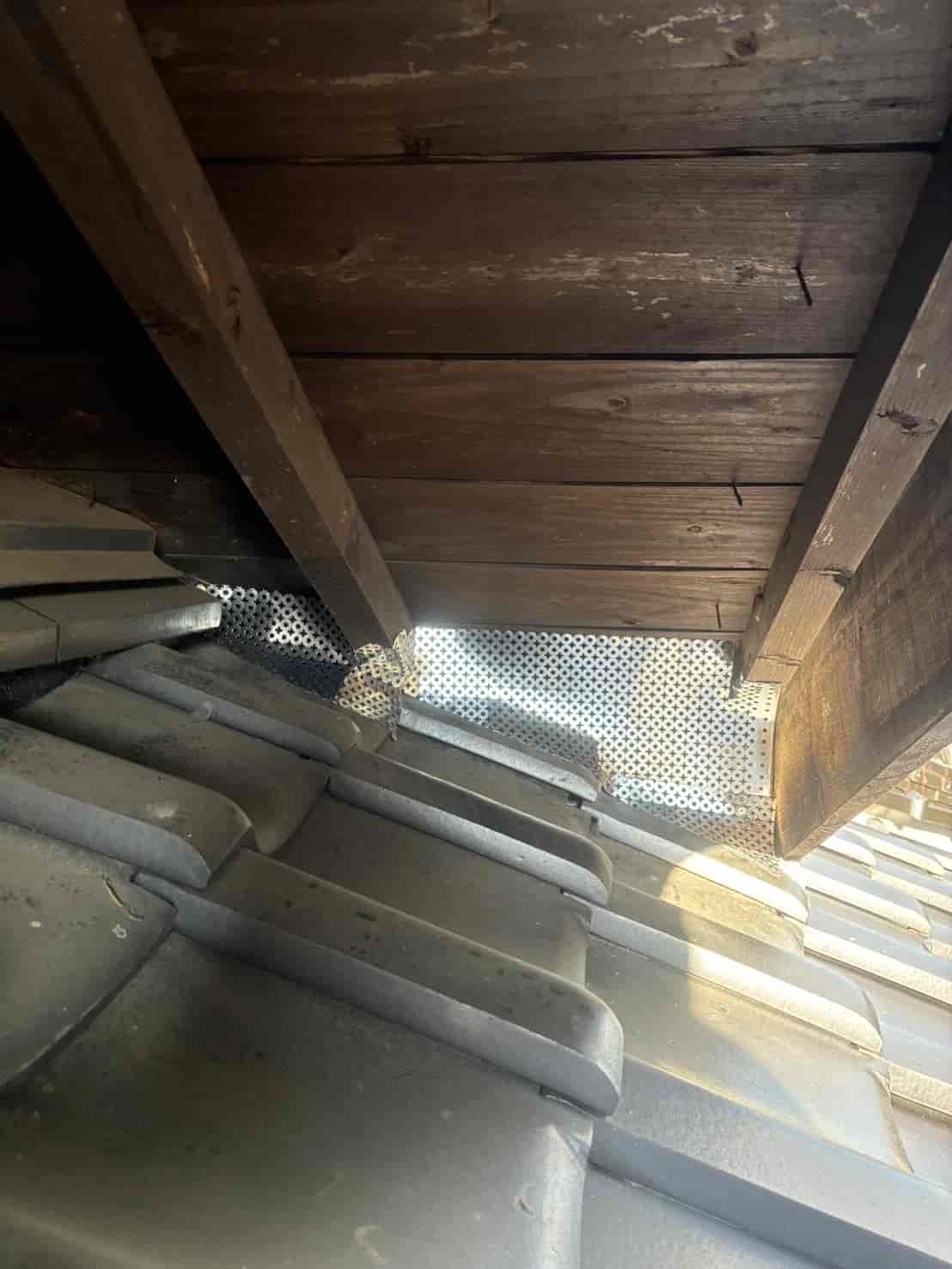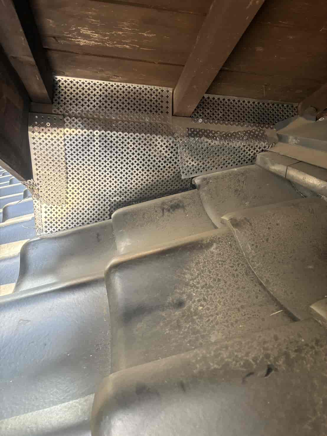 入り母屋部分では、瓦の復旧・調整を行い、木部の隙間を構造に適した方法で補修・封鎖します。単なる簡易処理ではなく、再侵入を防ぐため耐久性を重視した施工を行います。