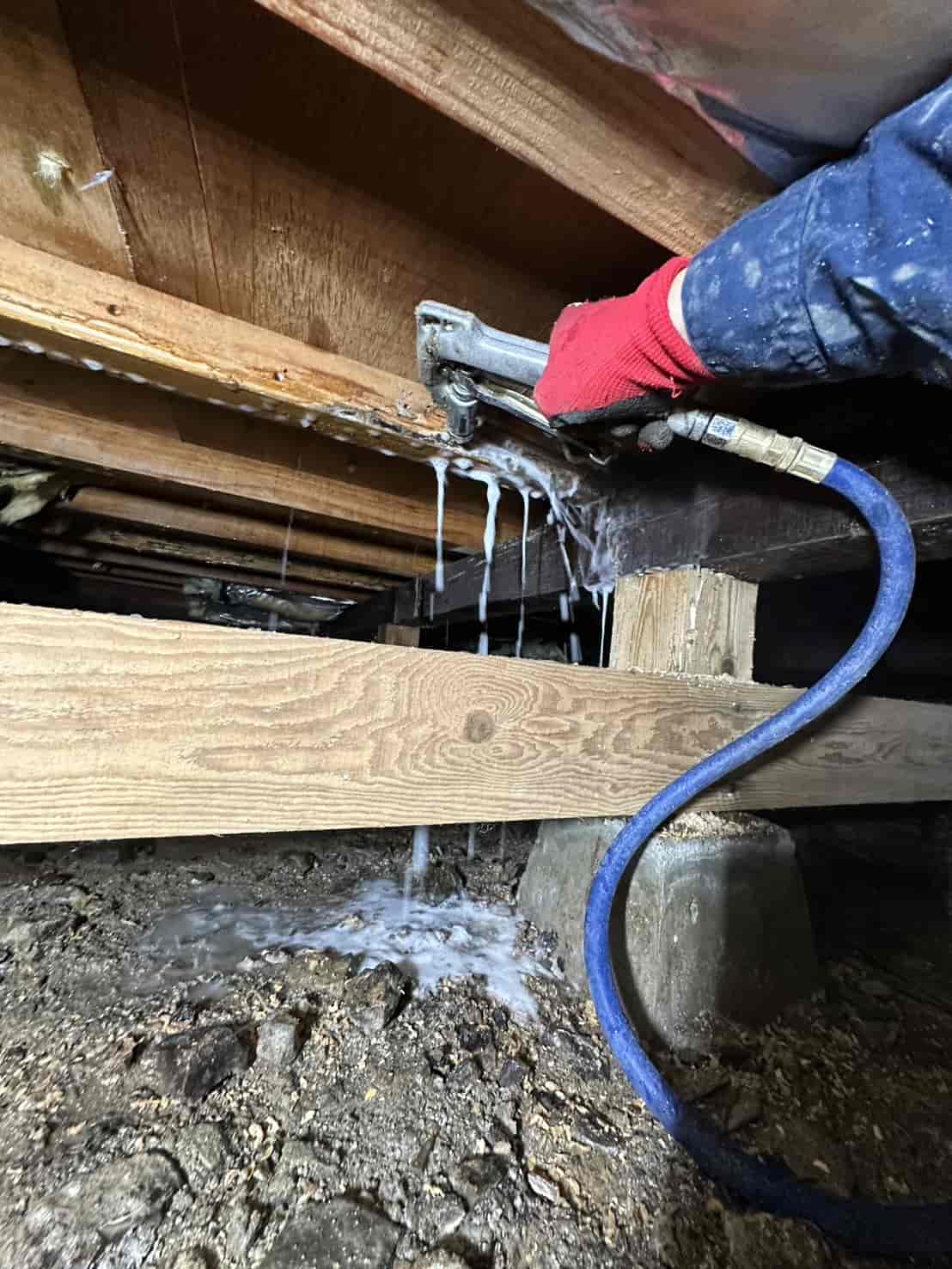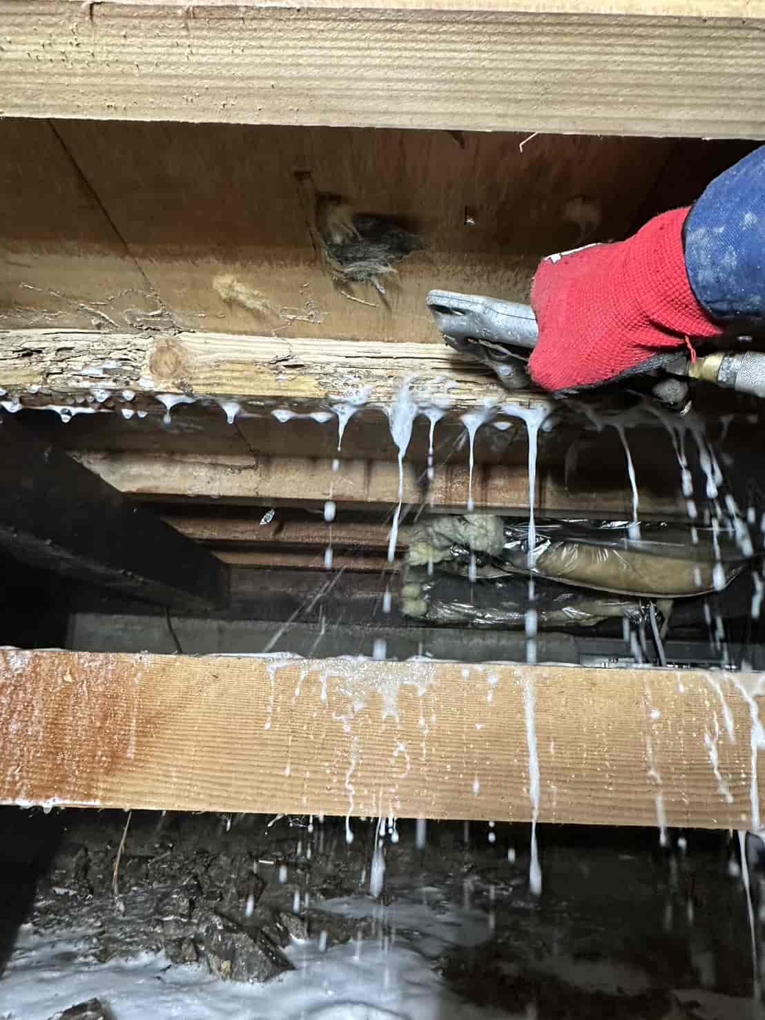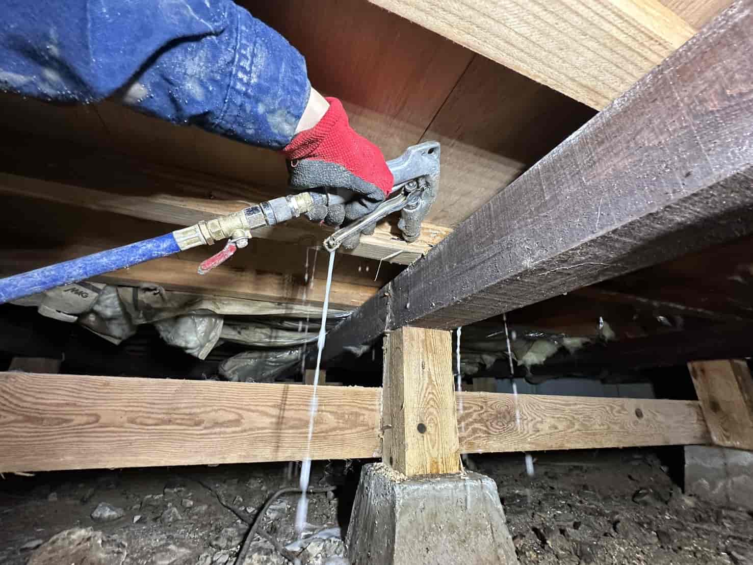 今回の現場では、断熱材の裏側まで被害が広がっていたため、被害箇所の断熱材をすべて撤去し、構造材を露出させた状態で薬剤散布を行いました。