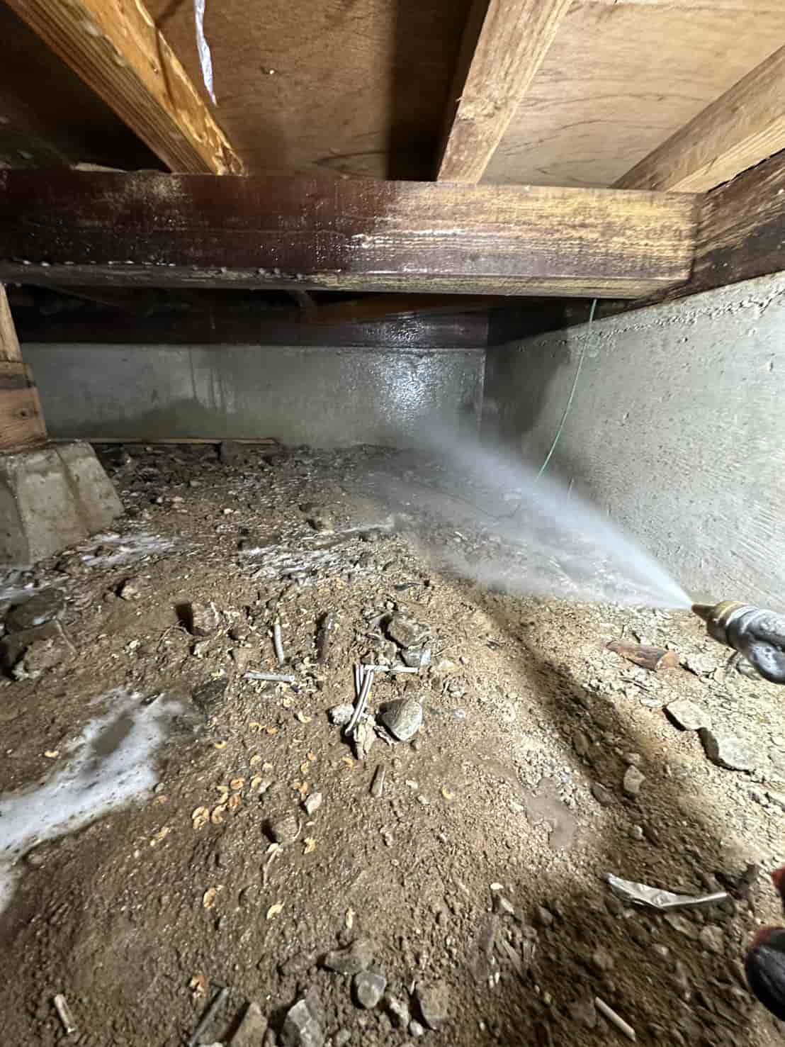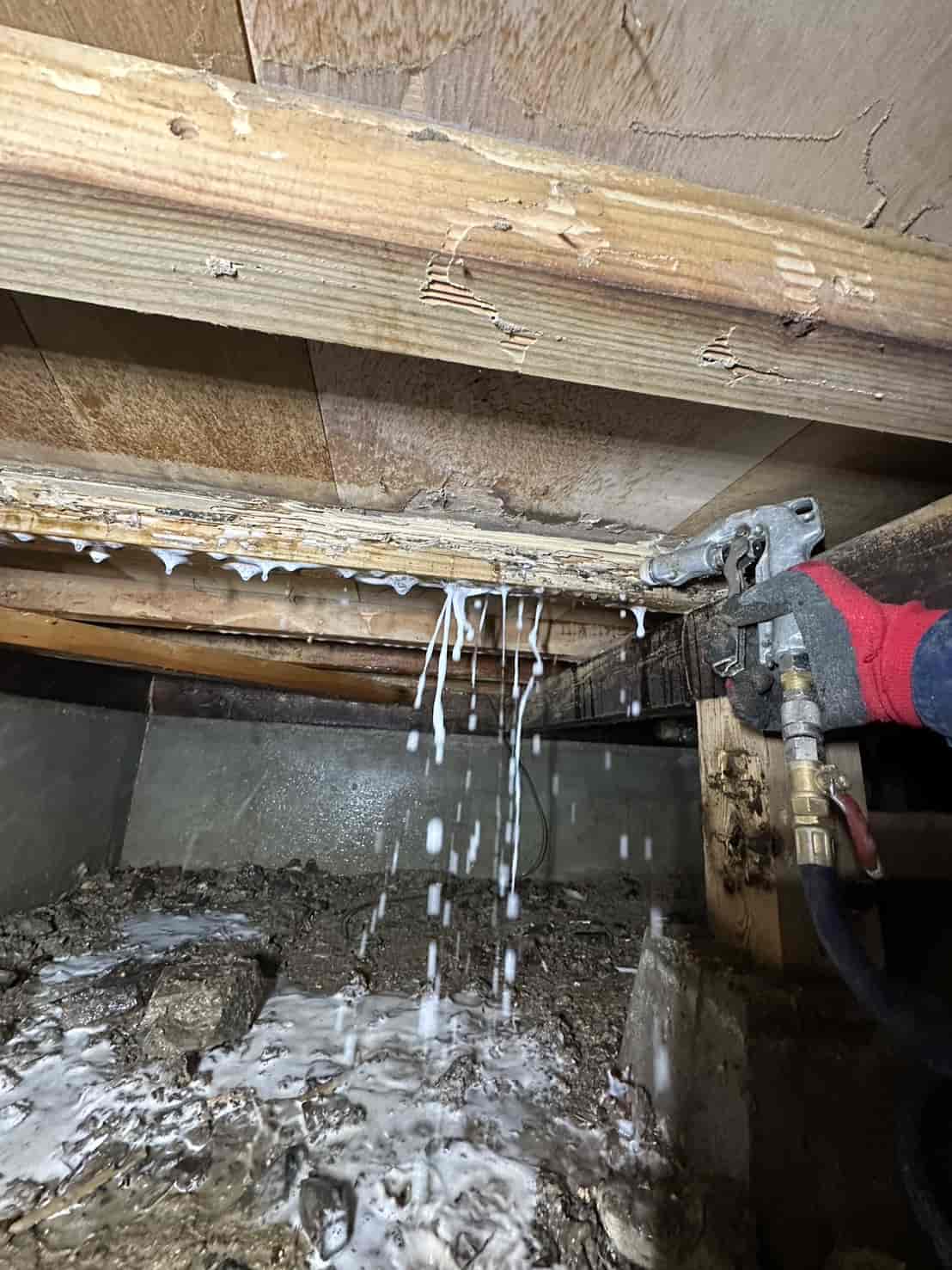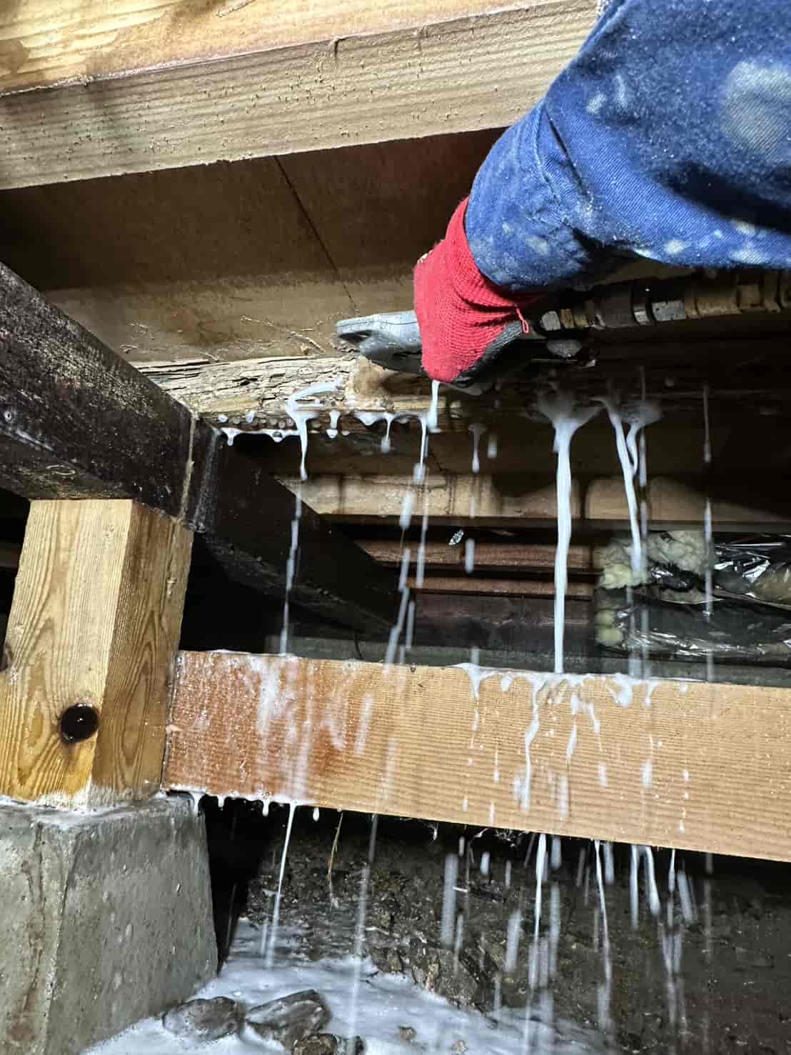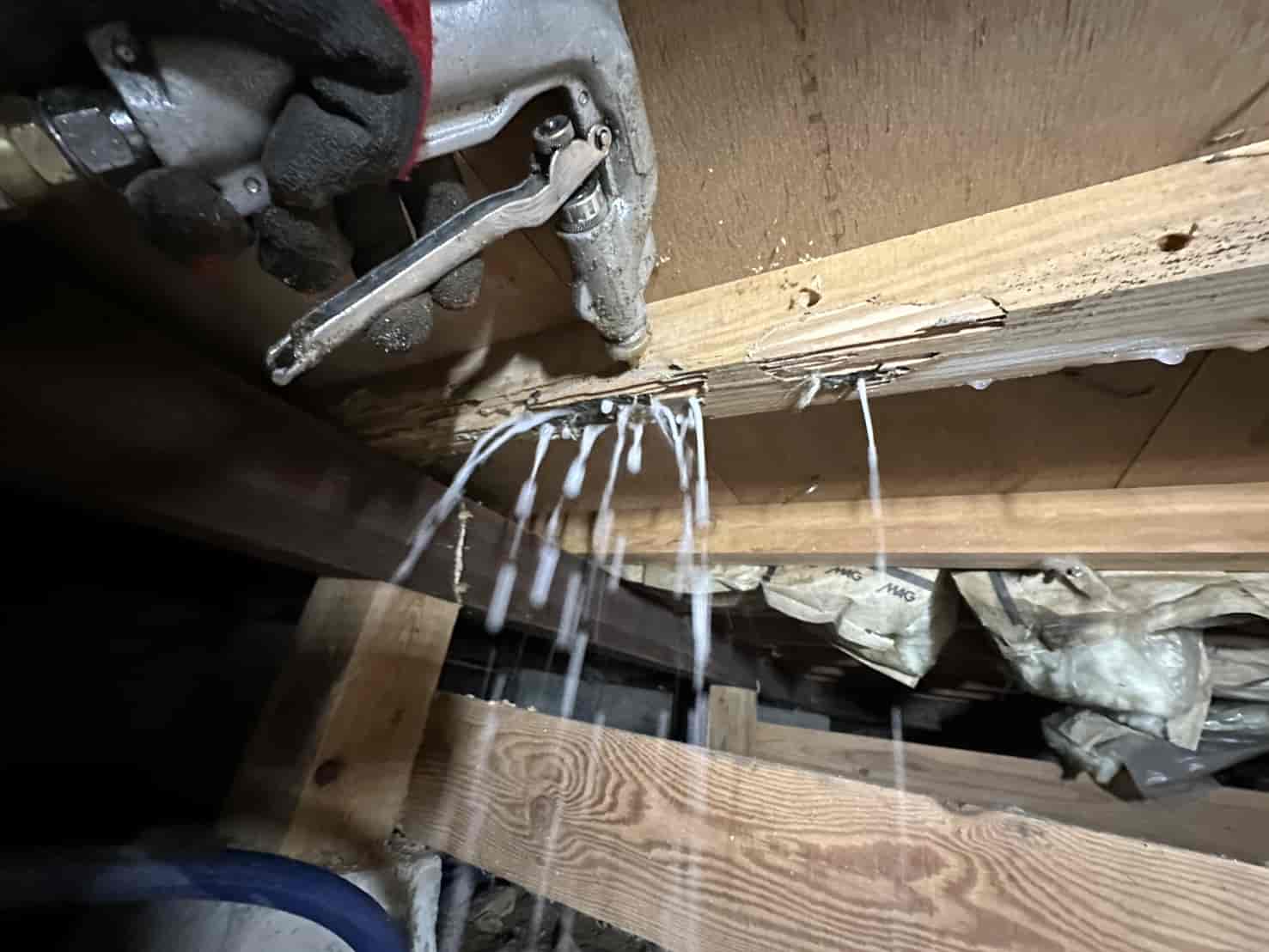 今回の現場では、断熱材の裏側まで被害が広がっていたため、被害箇所の断熱材をすべて撤去し、構造材を露出させた状態で薬剤散布を行いました。